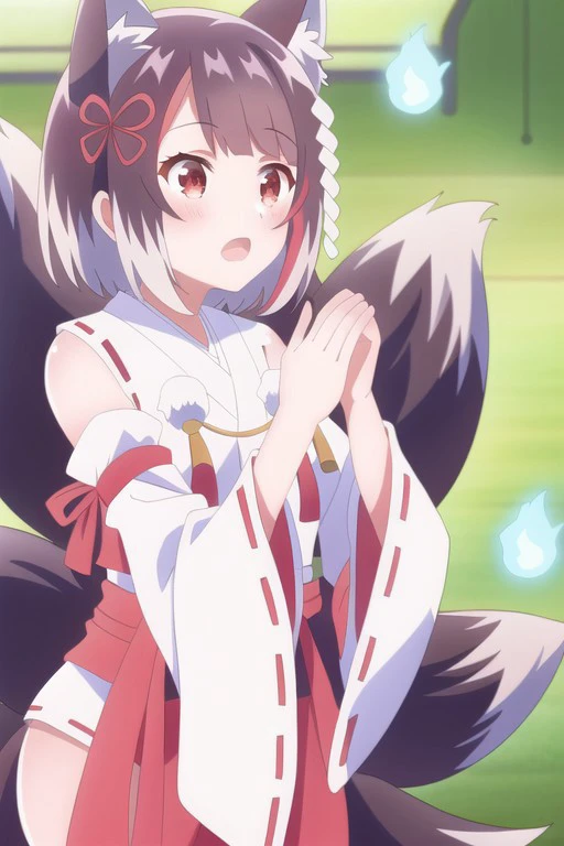Trigger Words: shion kaminari, short hair, animal ears, tail, streaked hair, fox ears, fox tail, fox girl, multiple tails, brown hair, red eyes
