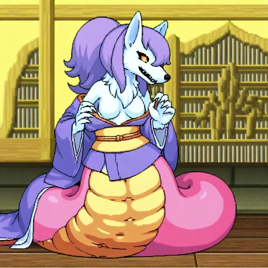 female, lamia, anthro wolf, glowing yellow eyes, white fur, purple hair, long hair, hands, claws, animal ears, sharp fangs, white wolf upper body, pink snake-like lower body, thick pink snake tail
