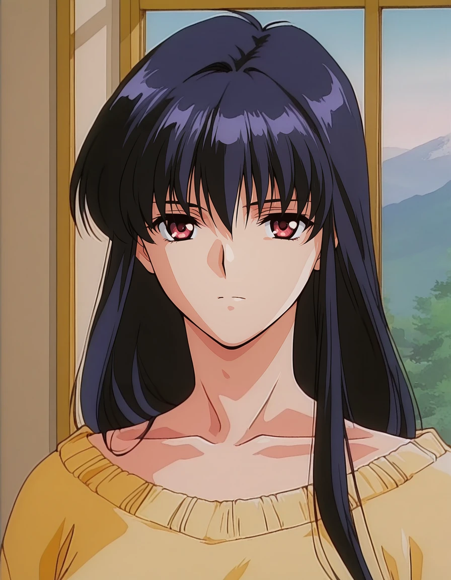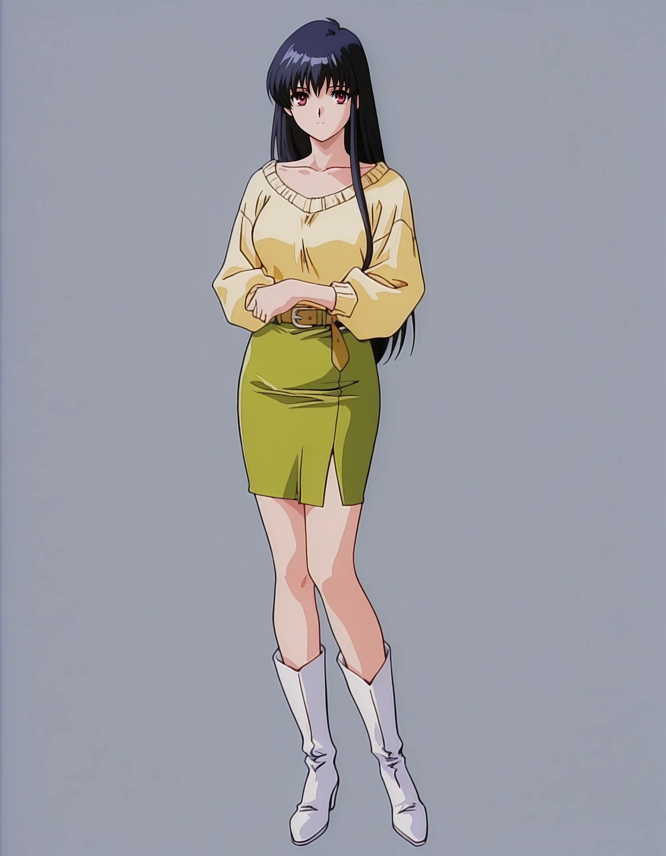 mai_midp,mai_sonyamp,mature female,(age_up:2),long_hair,black_hair,pink_eyes,collarbone,yellow_sweater,brown_belt,green_skirt,pencil skirt,white_boots