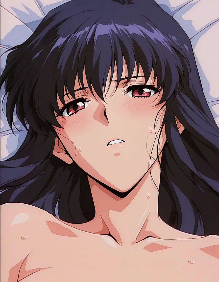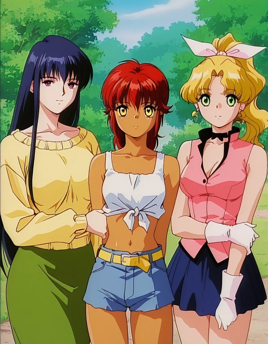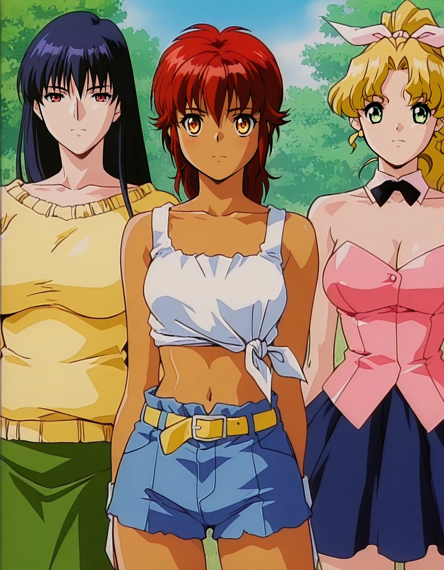 mai_midp,mai_lukishmp,(aged_up),dark-skinned_female,short_hair,red_hair,yellow_eyes,tank_top,tied_shirt,midriff,yellow_belt,blue_shorts,brown_footwear,holding_swordUsing the prompt 'mai_midp,retro_artstyle,1990s \(style\)' can obtain the style of the work.
