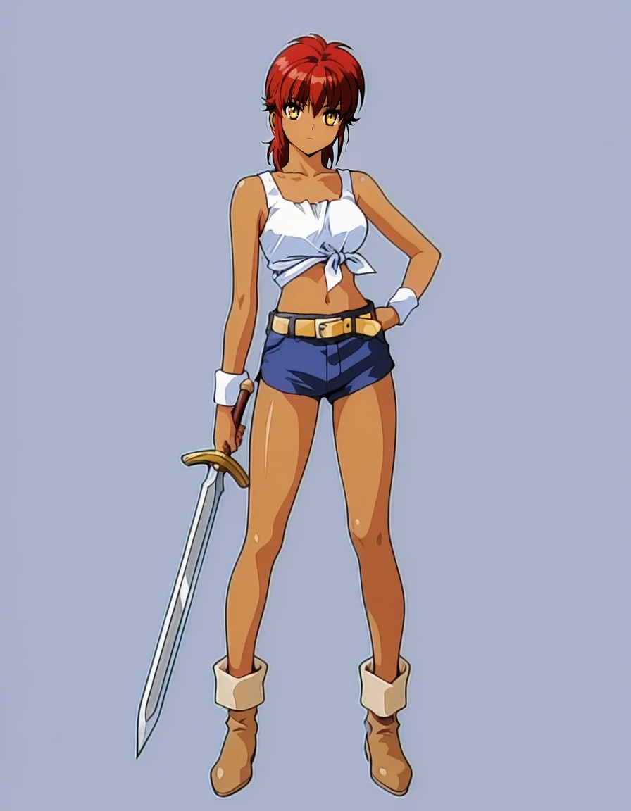 mai_midp,mai_lukishmp,(aged_up),dark-skinned_female,short_hair,red_hair,yellow_eyes,tank_top,tied_shirt,midriff,yellow_belt,blue_shorts,brown_footwear,holding_sword