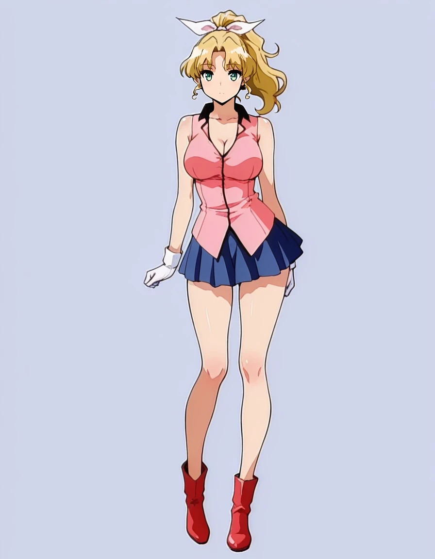 mai_keimp,(age_up:2),long_hair,ponytail,blonde_hair,jewelry,green_eyes,earrings,white_gloves,collared shirt,pink_shirt,bare_shoulders,cleavage,blue_skirt,red_footwear