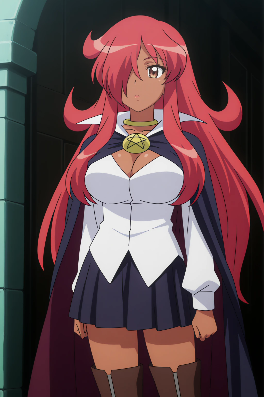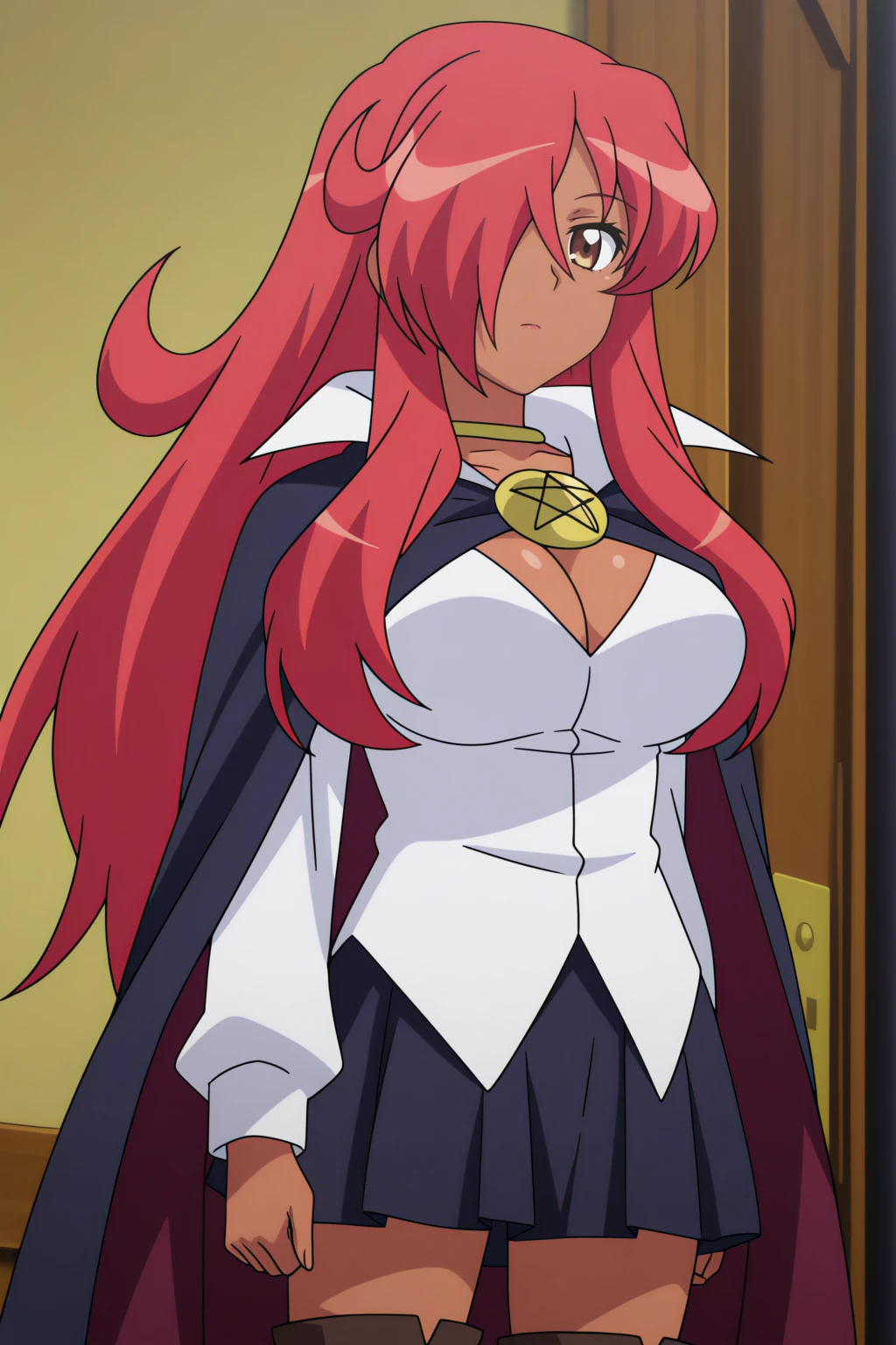 black cape, white shirt, black skirt, black_thighhighs, pentacle