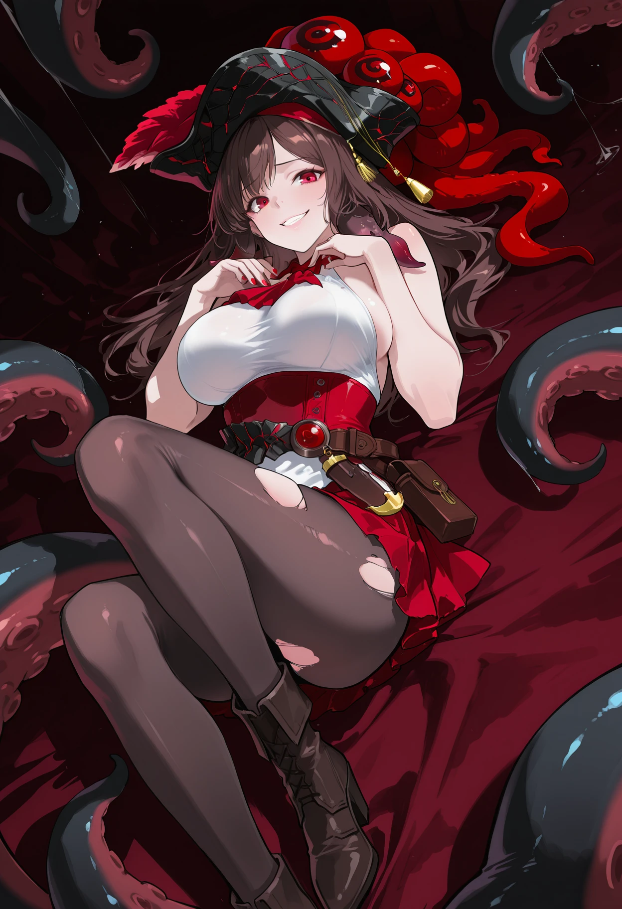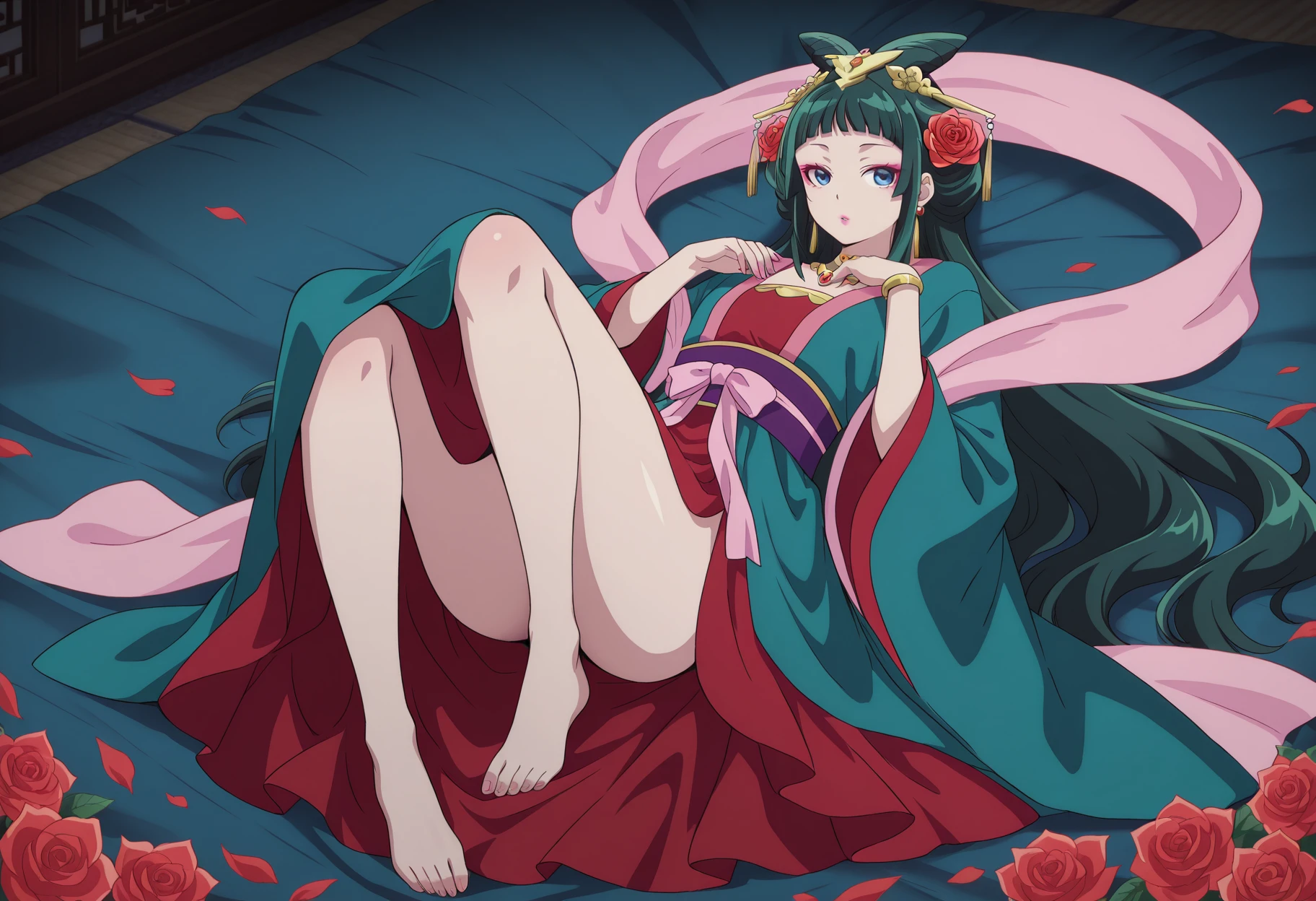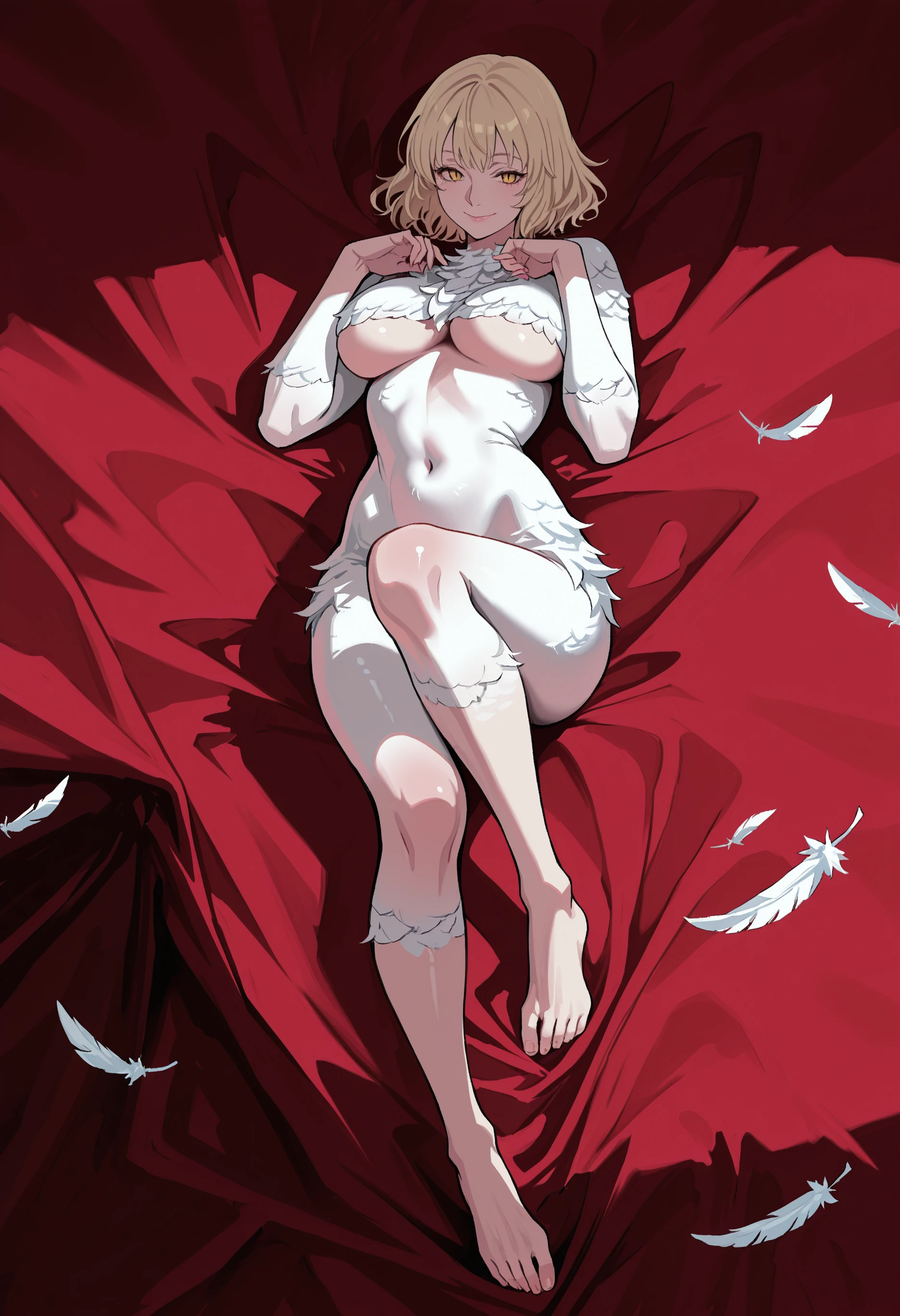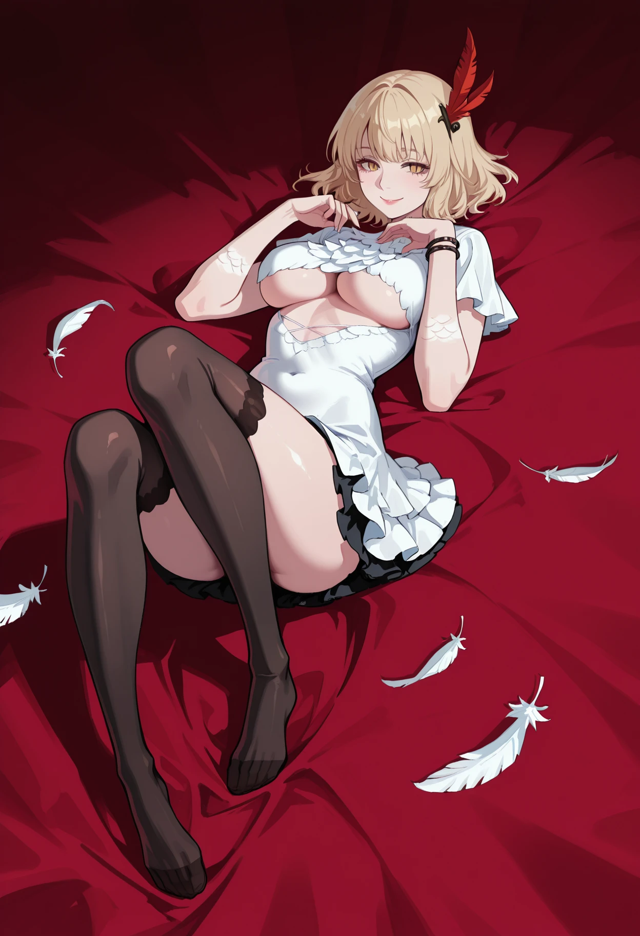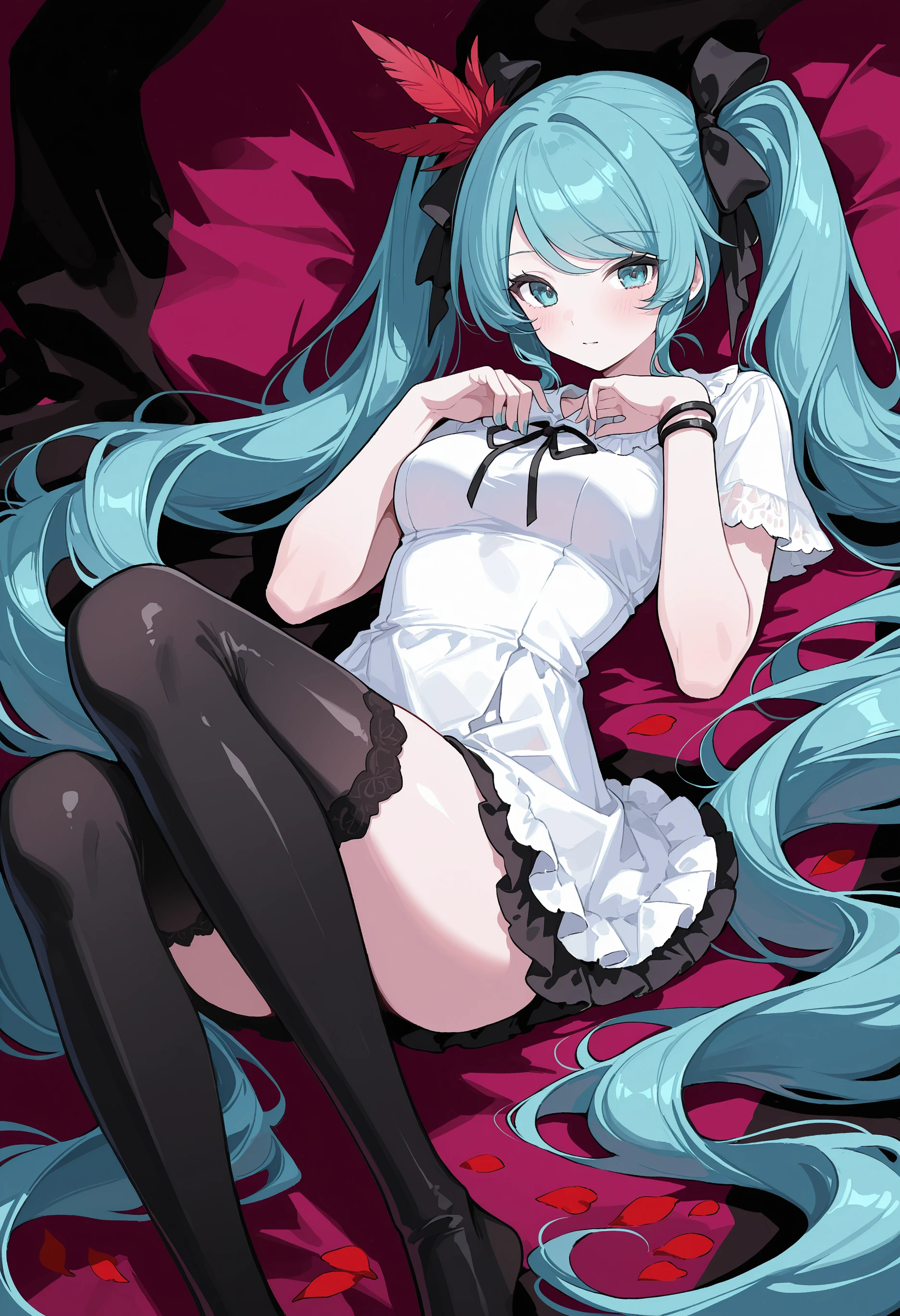 twintails, black hair bow, red feather hair ornament, black multiple bracelets, black neck ribbon, white short dress, white frills, black petticoat, black thighhighs, no shoes,