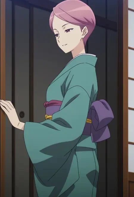 SuzuriKimono, 1girl, solo, short hair, pink hair, slicked hair, dark pink eyes, large breast, curvy, wide hips, female focus, japanese clothes, green kimono, purple and red obi, long sleeves, wide sleeves, white socks, Suzuri Sumeragi Hakama