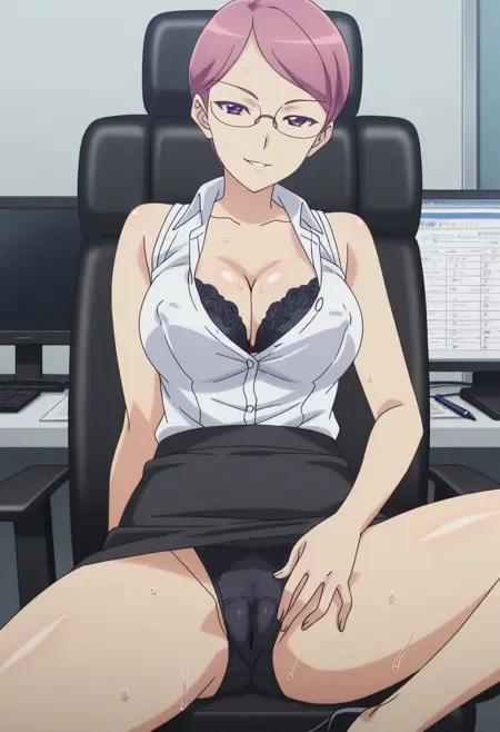 SuzuriOffice, mature female, 1girl, solo, long hair, pink hair, dark pink purple eyes, large breasts, curvy, wide hips, white shirt, sleeveless shirt, office lady, black pantyhose, black pencil skirt, high heels, black shoes, pantylines, bare shoulders, bare arms, black bra visible through clothes, elegant glasses,Artistic Disclaimer: