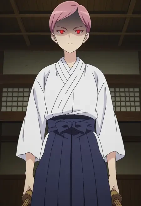 SuzuriHakama, 1girl, solo, short hair, pink hair, slicked hair, shaded face, no eyes, large breast, curvy, wide hips, female focus, japanese clothes, white kimono, blue hakama skirt, barefoot, serious look, long sleeves, holding, weapon, shinai, Suzuri Sumeragi Flashback