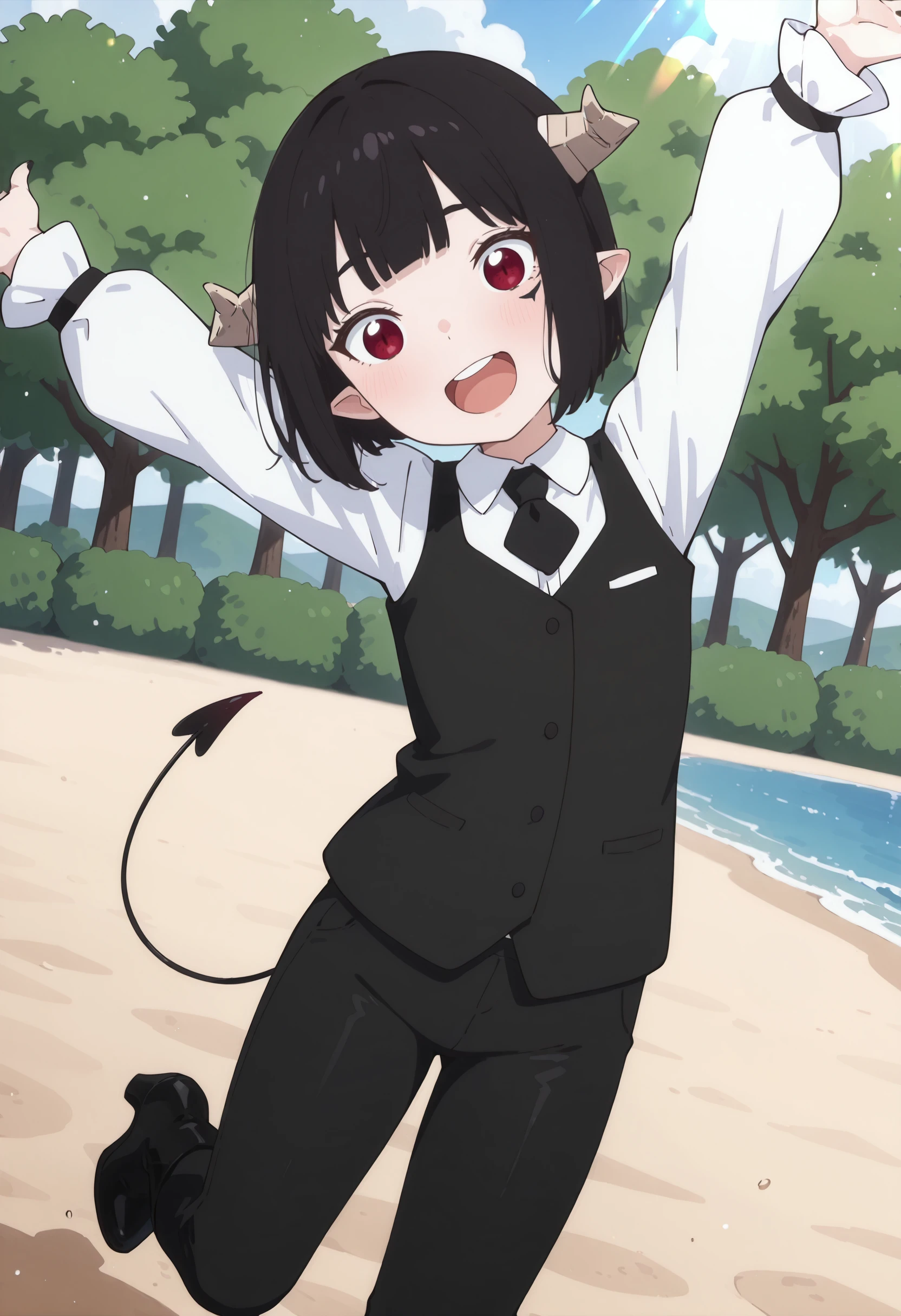 HimesamaYoungTorture, red eyes, horns, pointy ears, short hair, blunt bangs, black hair, demon tail