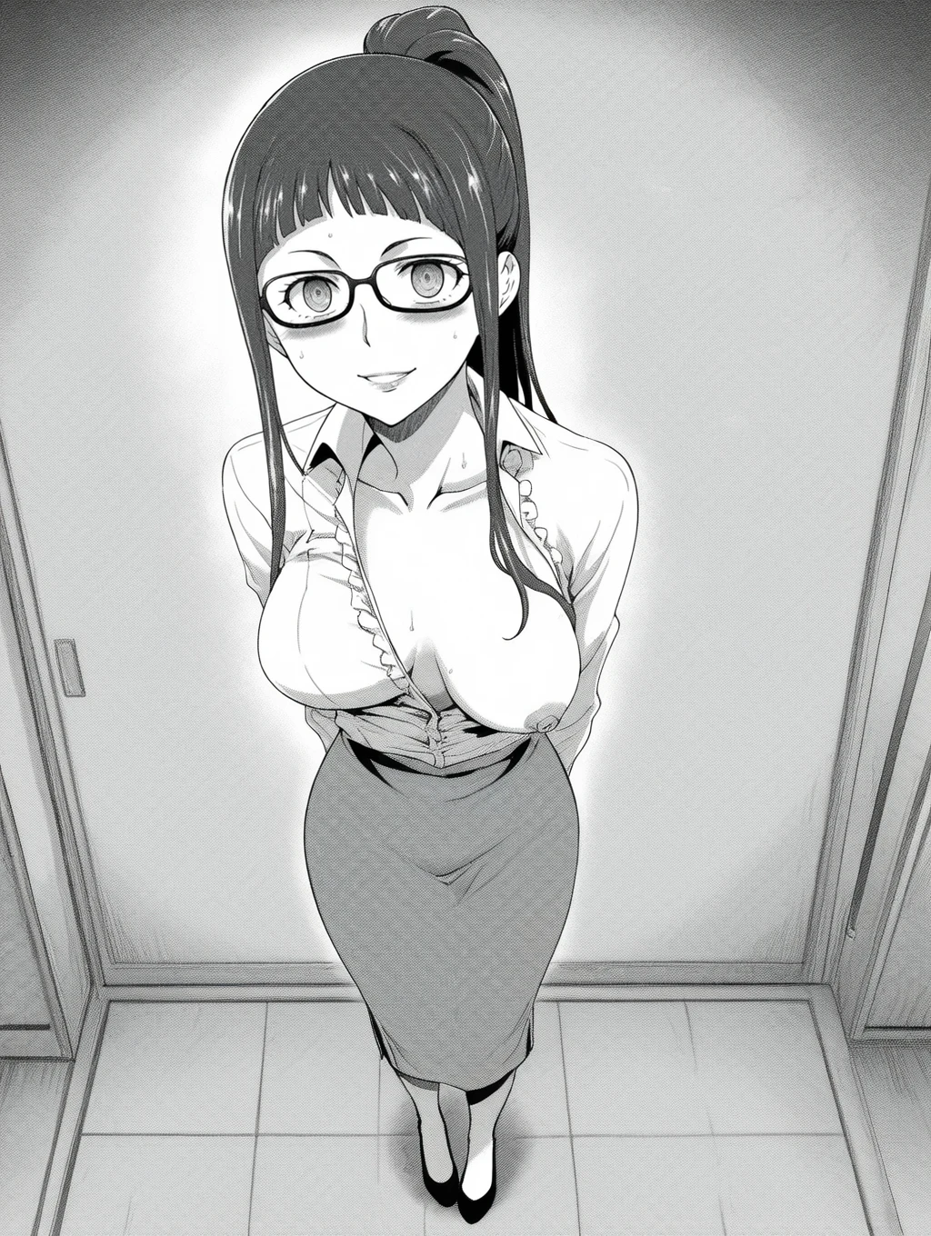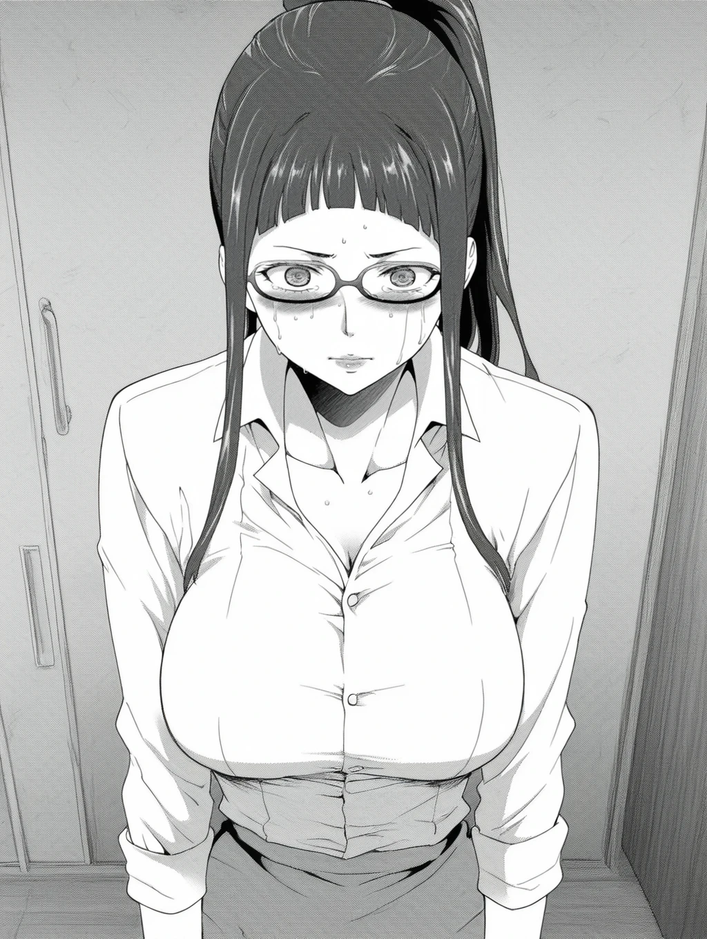 KujoAyame, glasses, long hair, ponytail, opaque glasses, ,bangs