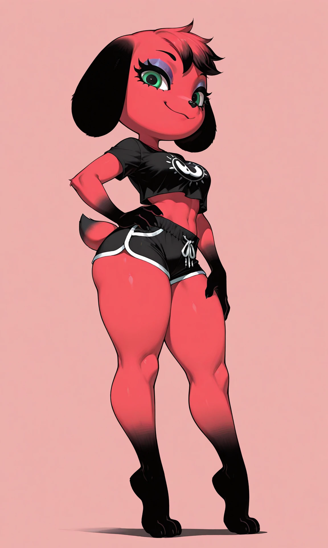 furry, animal nose, 1girl, shorts, crop top, cherry animal crossing, green eye, multicolor fur red and black, small tail, floppy ears