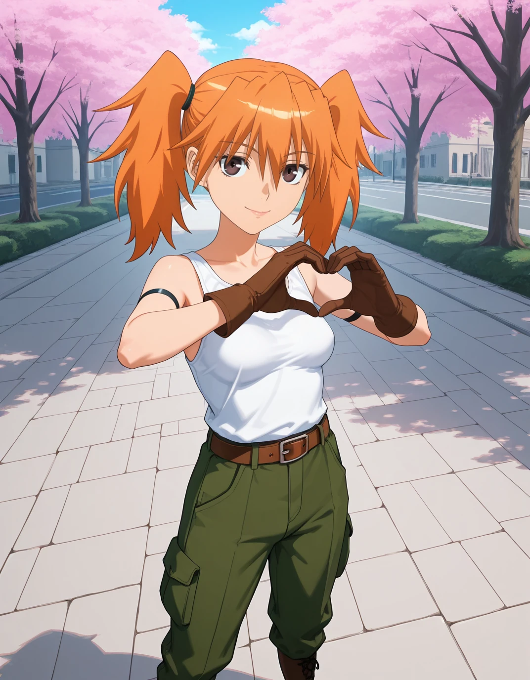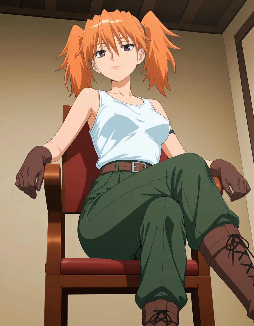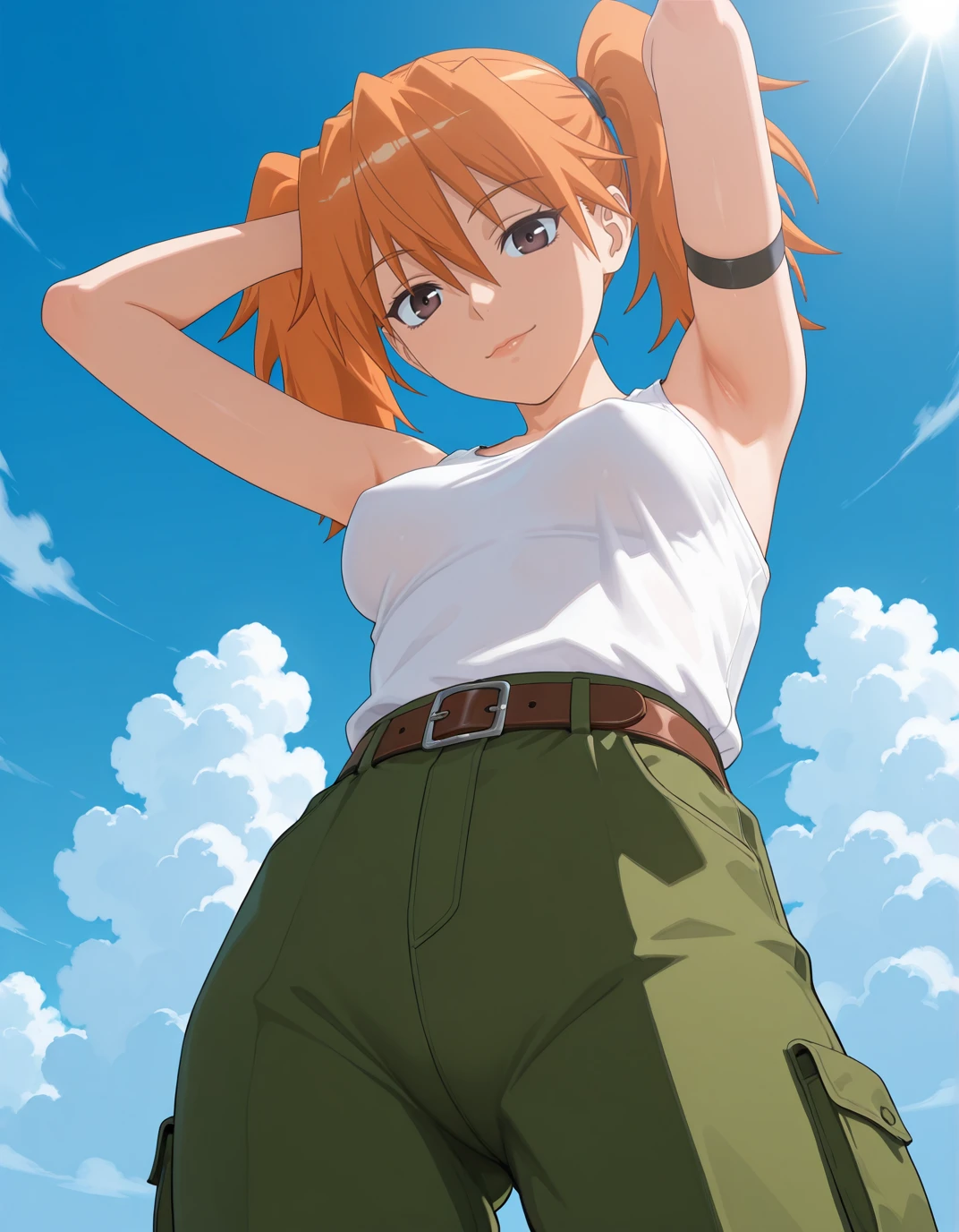 Clothes: orange hair, twintails, hair between eyes, dark brown eyes thin lips, medium natural breasts , white tank top without sleeves, green loose trousers, brown belt with pouches, brown lace-up boots, brown gloves, black armband on his left shoulder