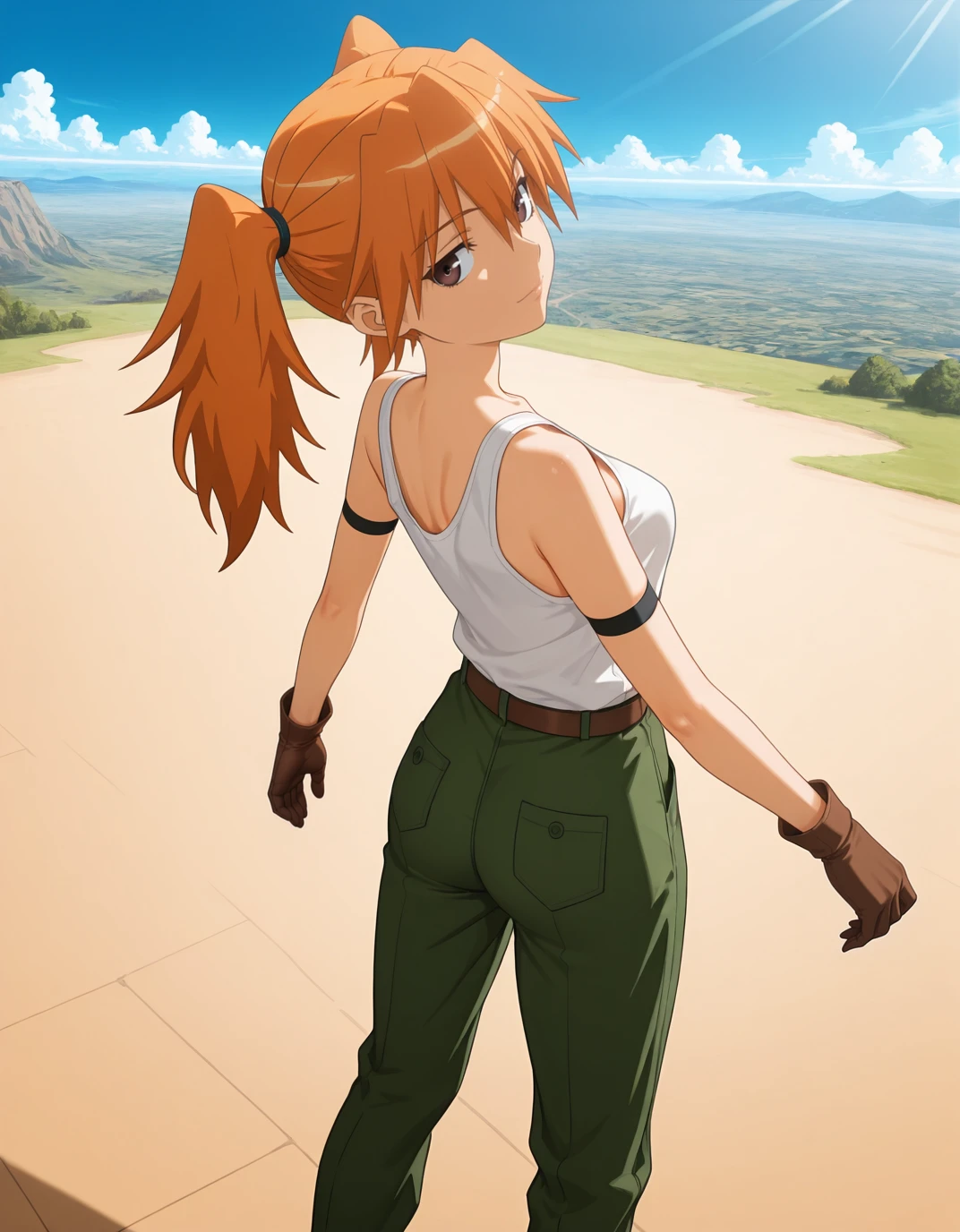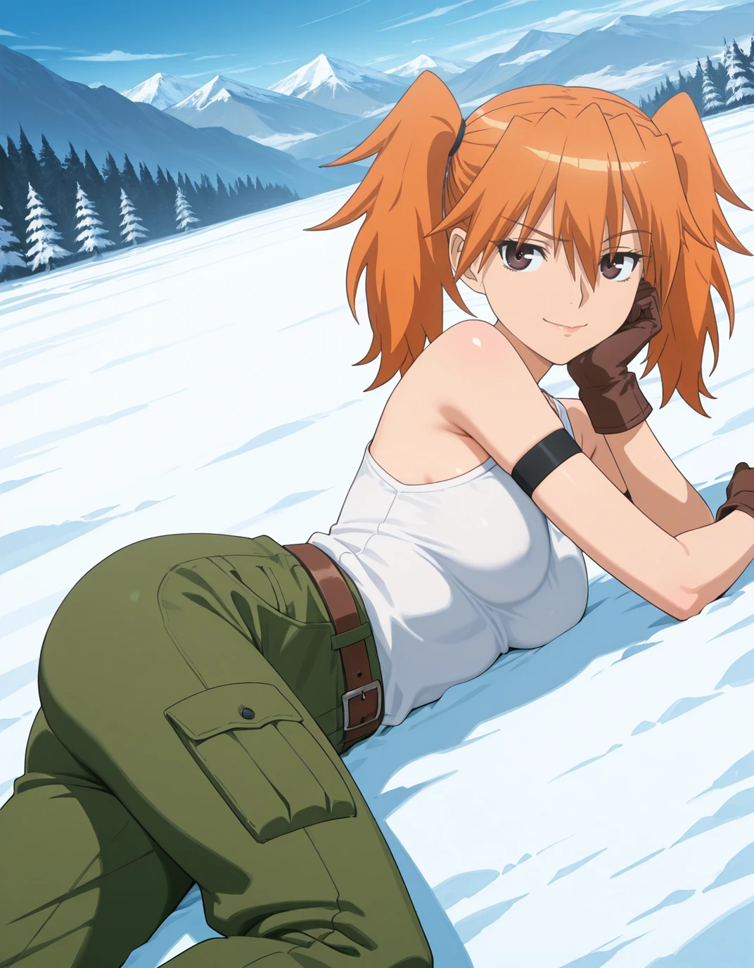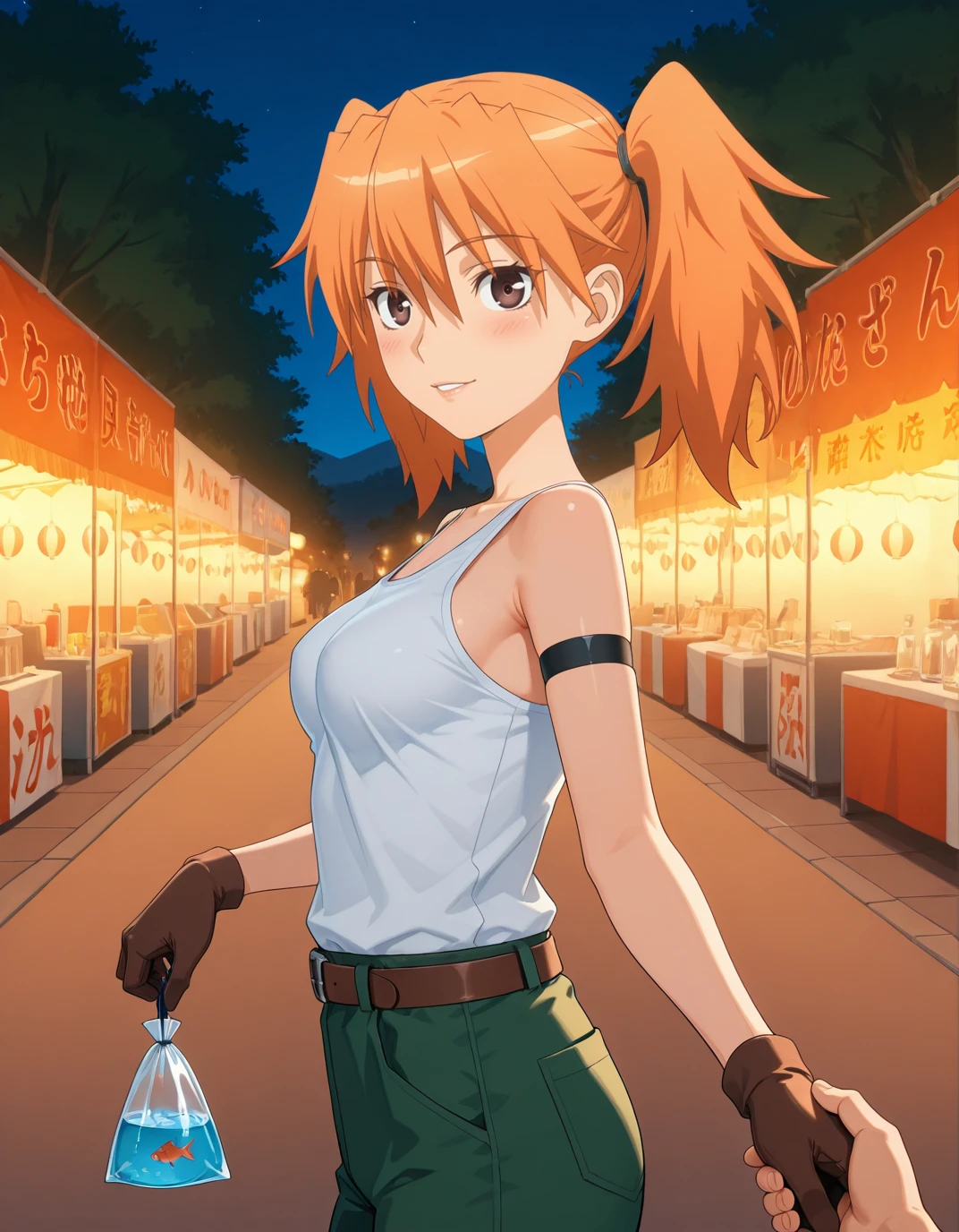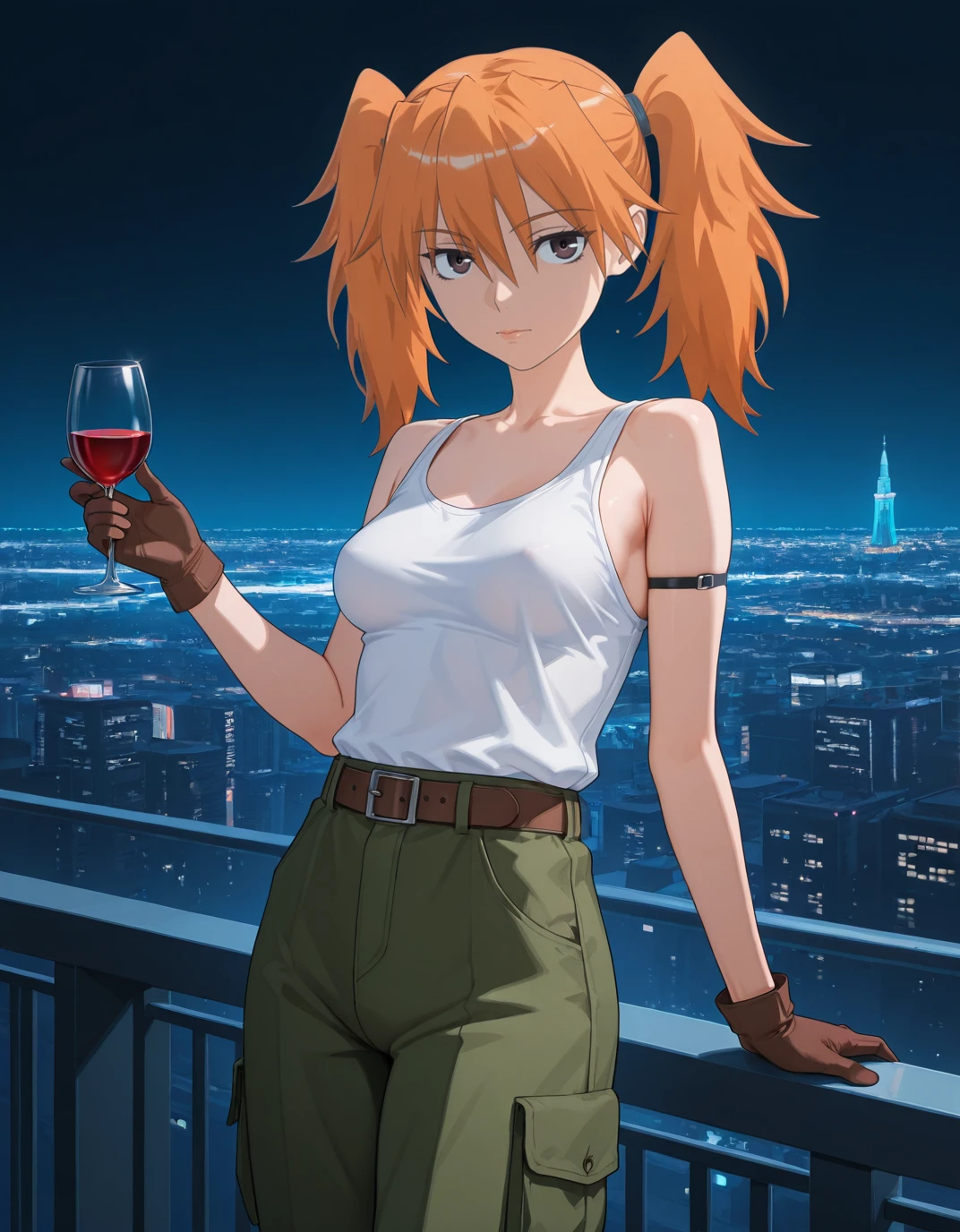 Clothes: orange hair, twintails, hair between eyes, dark brown eyes thin lips, medium natural breasts , white tank top without sleeves, green loose trousers, brown belt with pouches, brown lace-up boots, brown gloves, black armband on his left shoulder