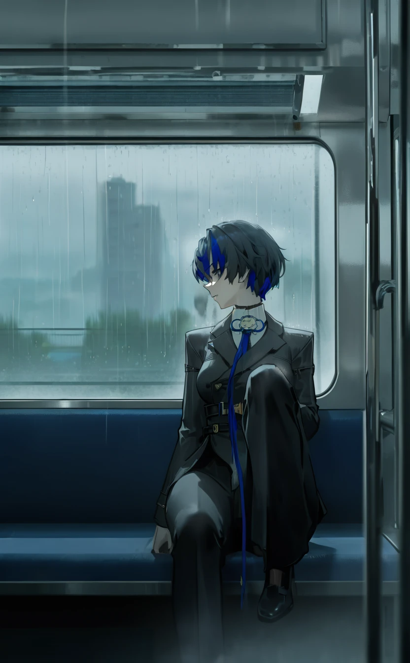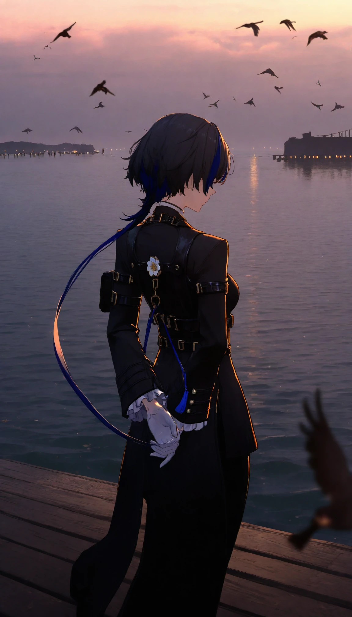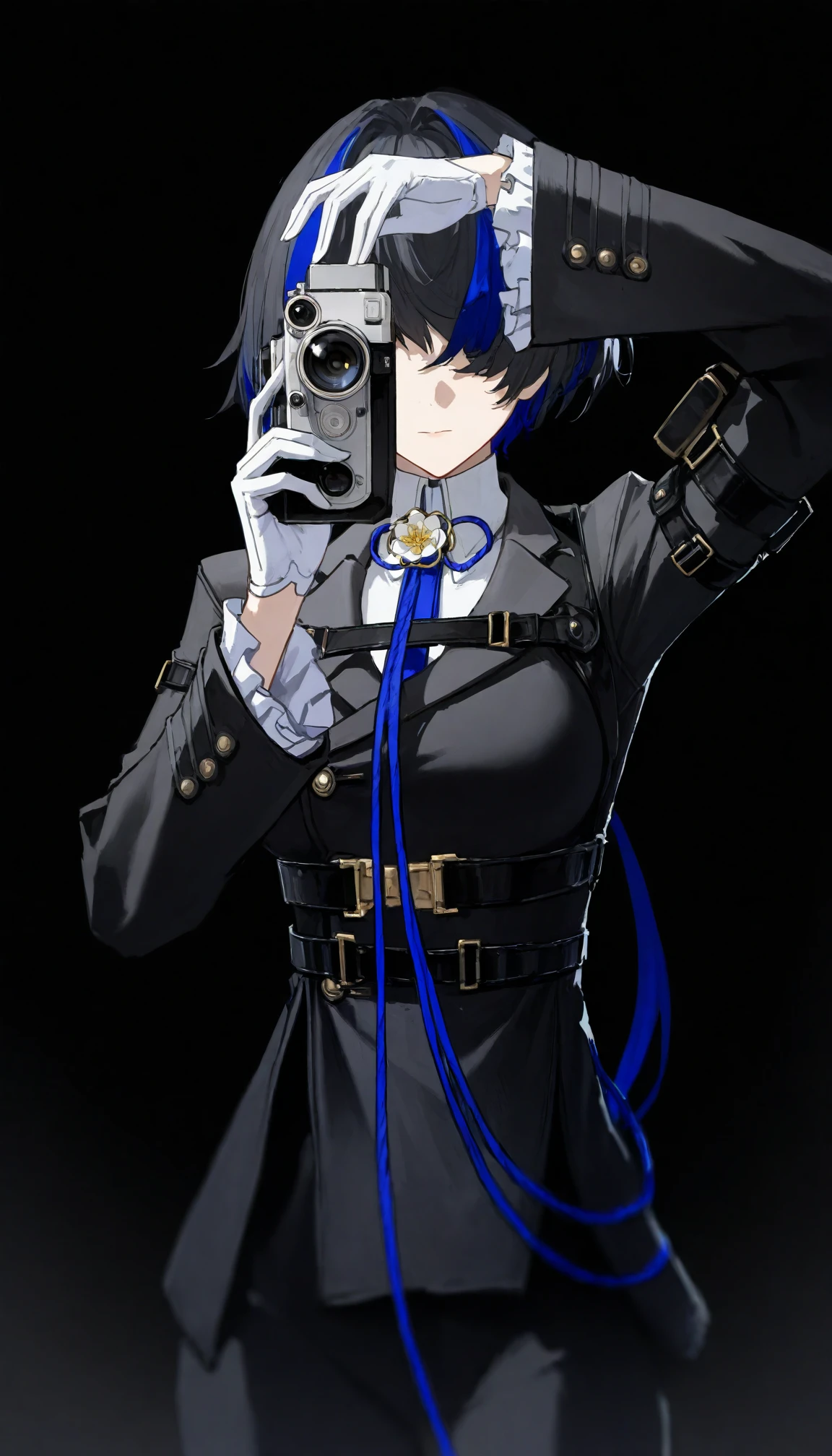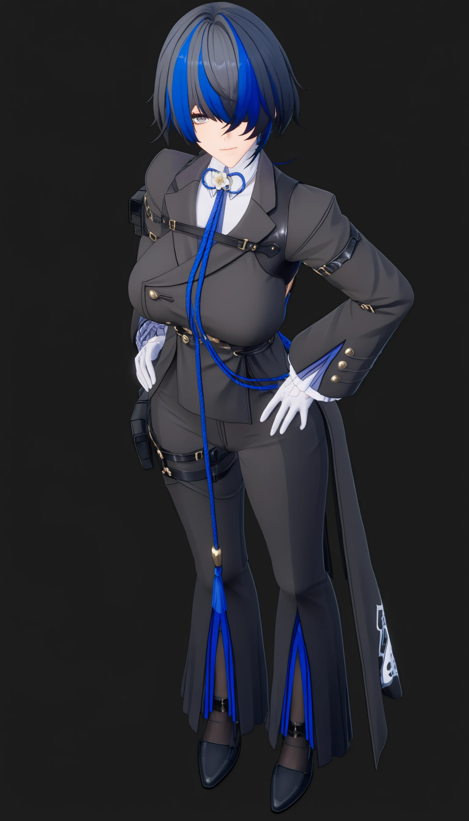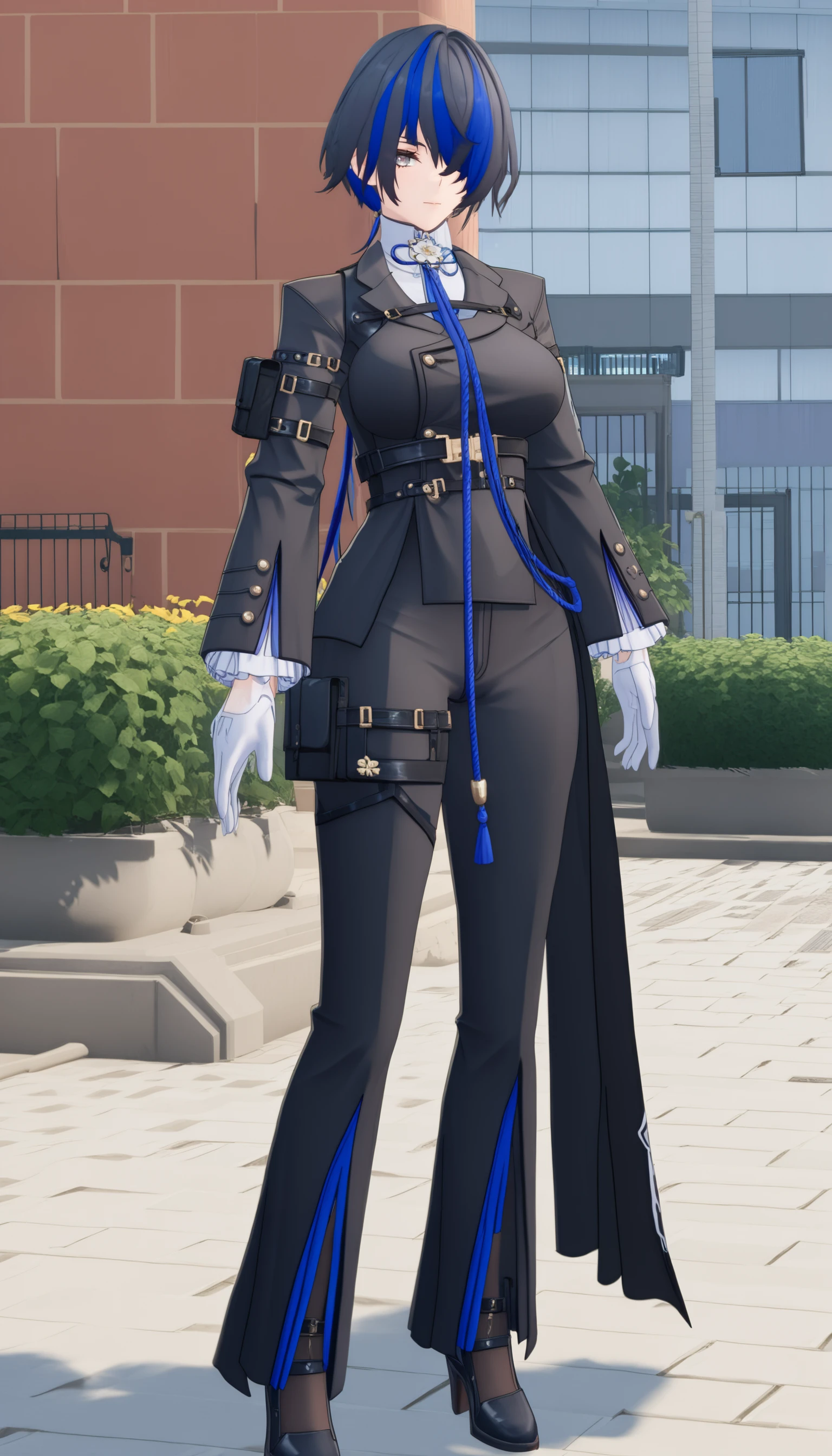 black suit,low ponytail, tassel, chest harness, blue ribbon, collared shirt, white gloves, frilled sleeves, arm strap,