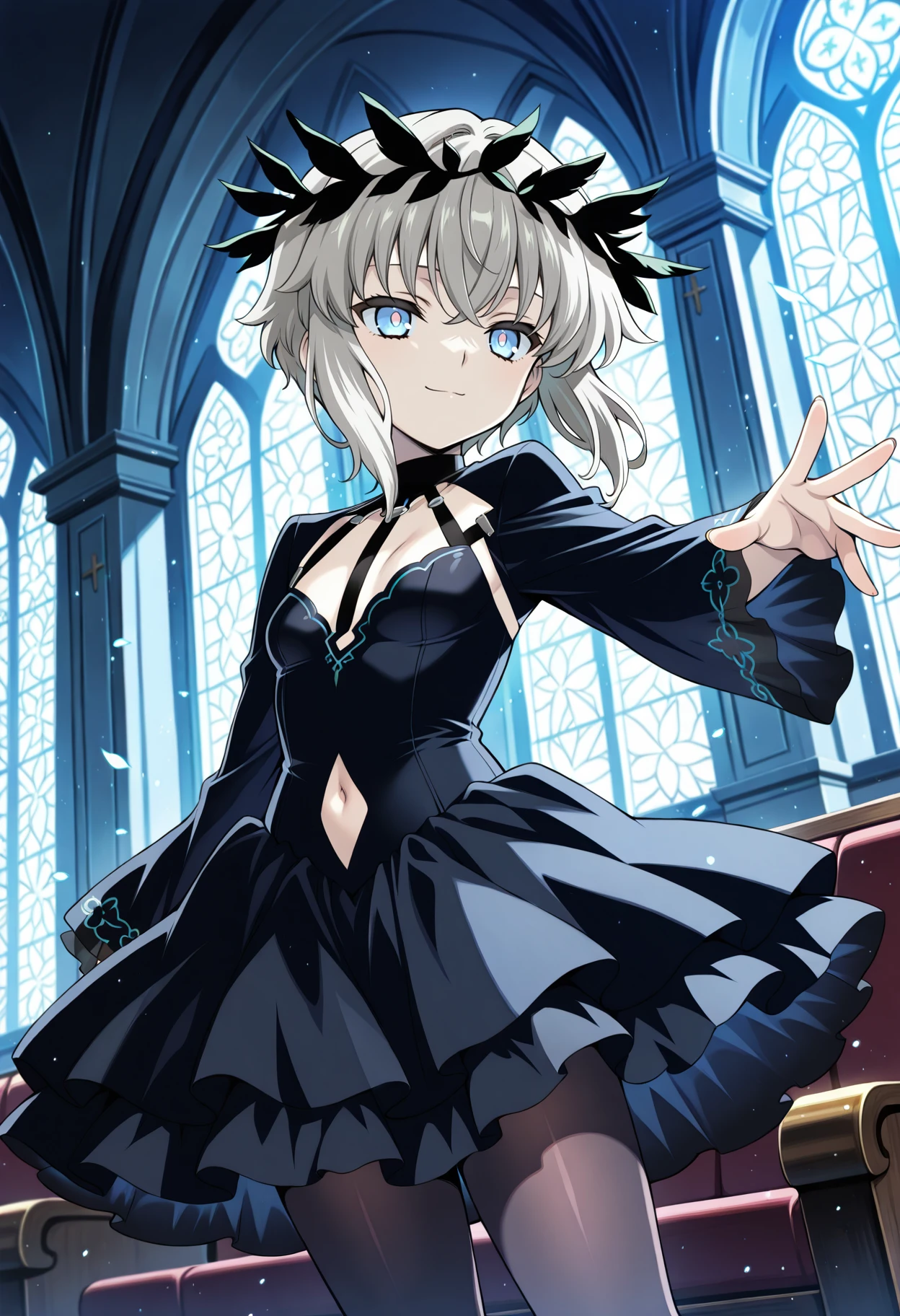 Base: amu_i, 1girl, retro artstyle, solo, , short hair with long locks, crossed bangs, hair between eyes, grey hair, blue eyes, head wreath, black choker, amu layered dress, black dress, breast cutout, long sleeves, frills, ribbon, navel cutout, pale skin, navel, grey pantyhose, small breasts,