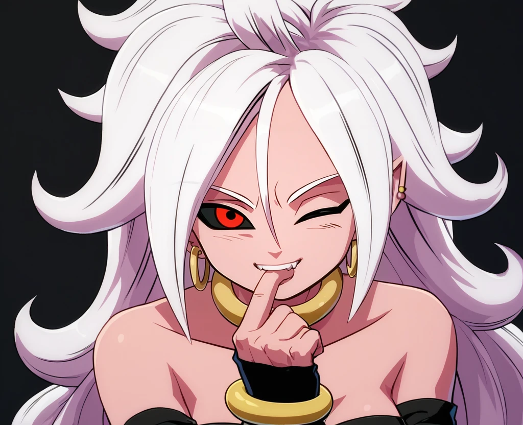 android21fz, pink skin, black sclera, red eyes, tube top, midriff, navel, white hair, long hair, elbow gloves, bare shoulders, bracelet, white pants, android 21,