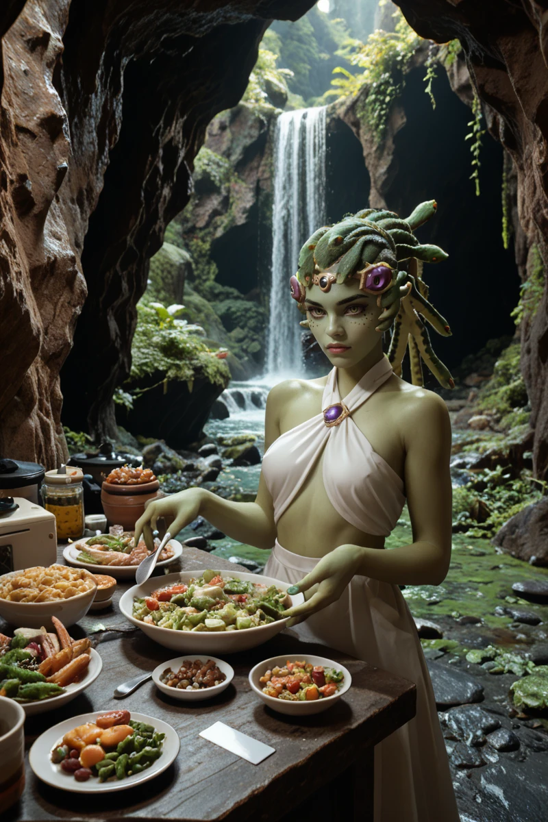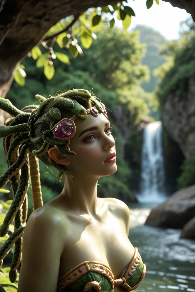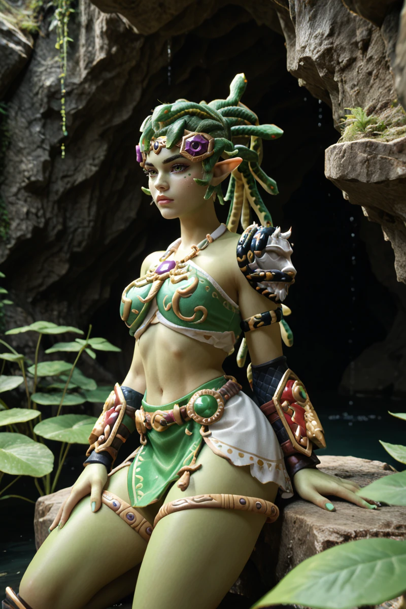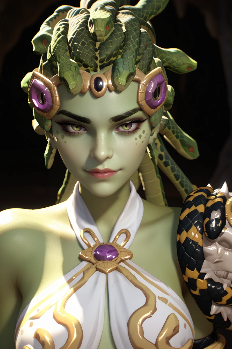 Medusa Widowmaker here... Look into my eyes, mon cher—if you dare. I am the venom made flesh, the perfect predator reborn from myth and shadow. My skin gleams a lethal lizard green, smooth and scaled like the serpents that now crown me. Where simple hair once fell, my living vipers coil and writhe, their eyes glowing with poisonous hunger, hissing secrets of every target in my sights.
