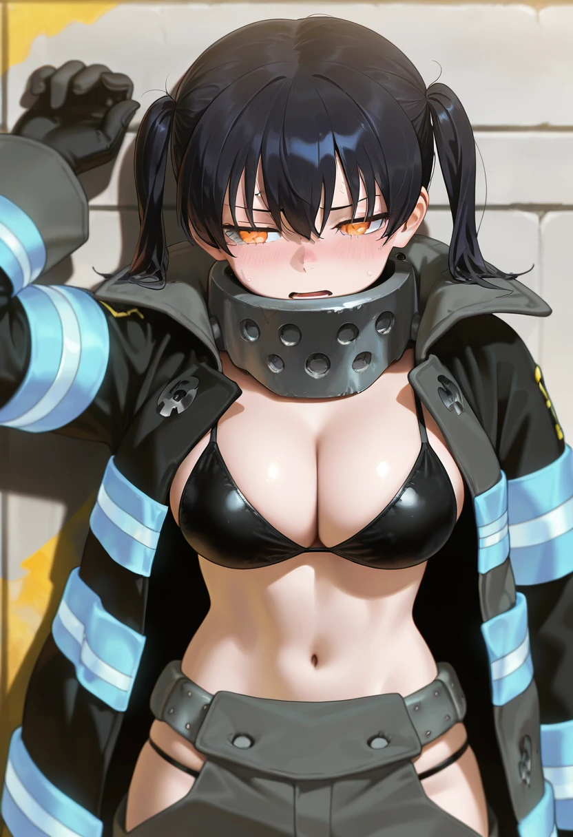 Tags for her outfit: long sleeves, navel, cleavage, black gloves, midriff, black bikini, bikini top only, black coat, open coat, bikini under clothes, grey pants, hip vent, baggy pants, metal collar, neon trim, glowing,