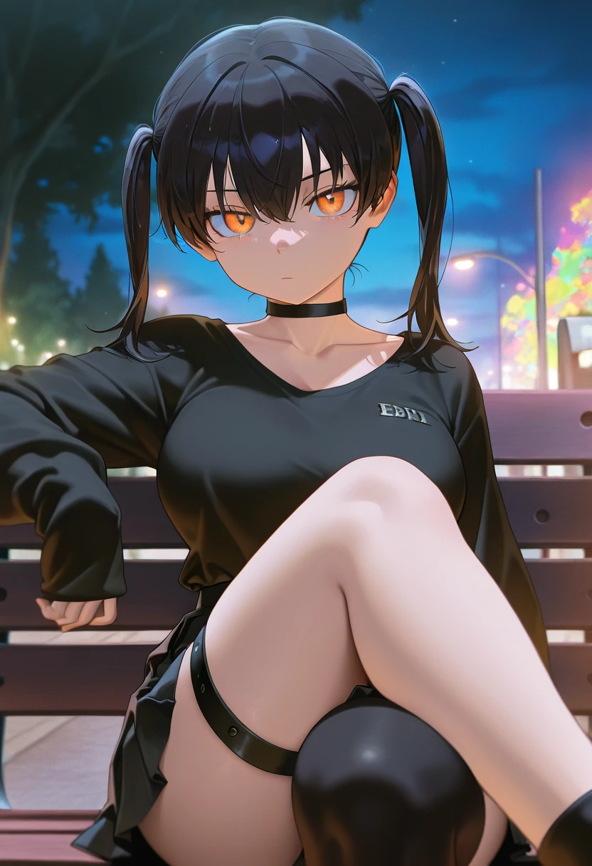 1girl, solo, long hair, large breasts, black hair, hair between eyes, twintails, orange eyes,
