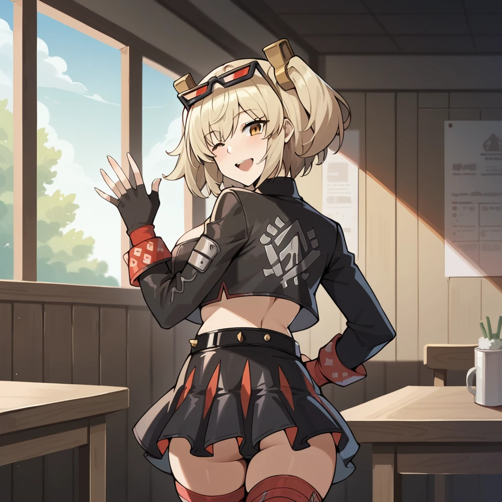 Burnice_ZZZ, blonde hair, orange eyes, two side up, short twintails, hair ornament, eyewear on head, sunglasses, goggles, Default Outfit: