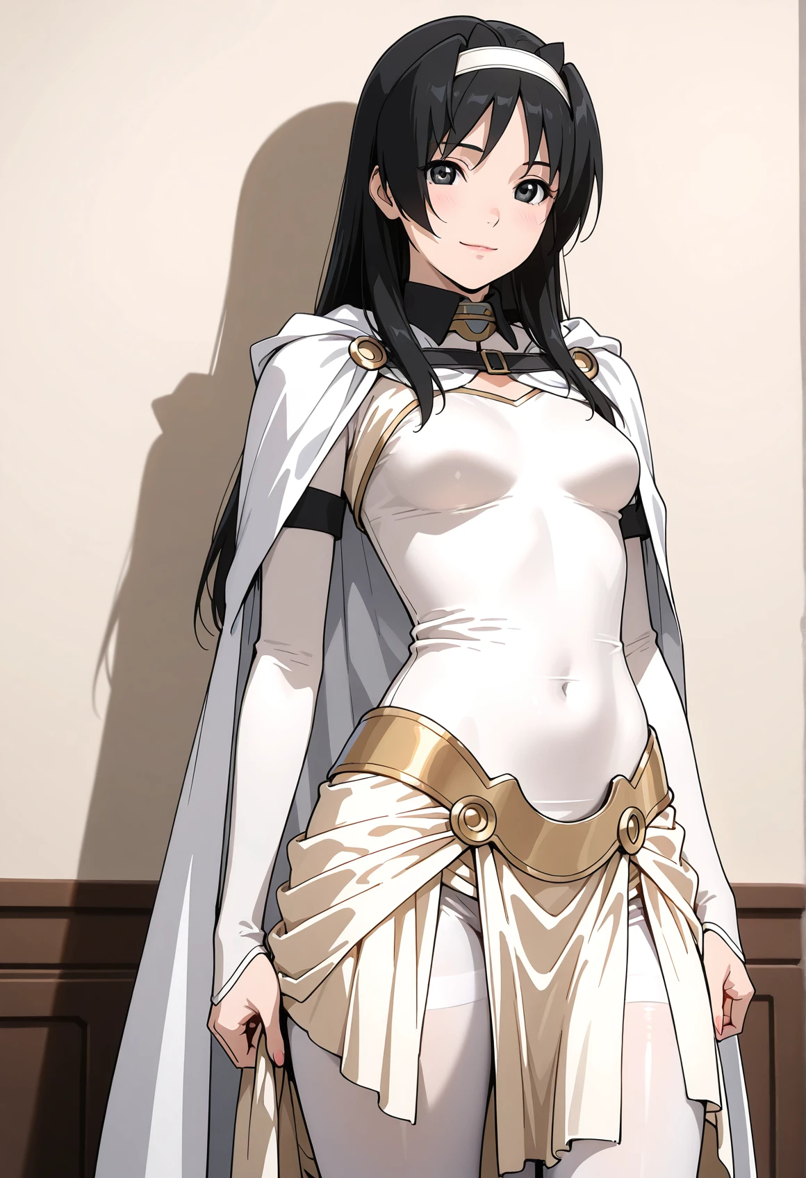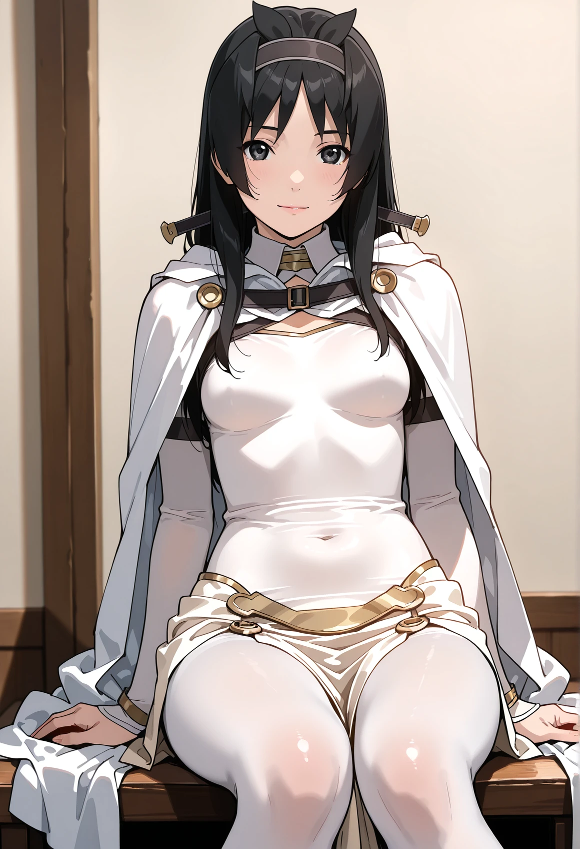 white cape,white bodysuit,long loincloth,white pantyhose,Description
