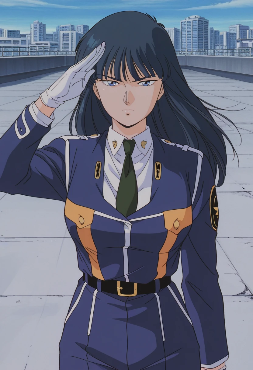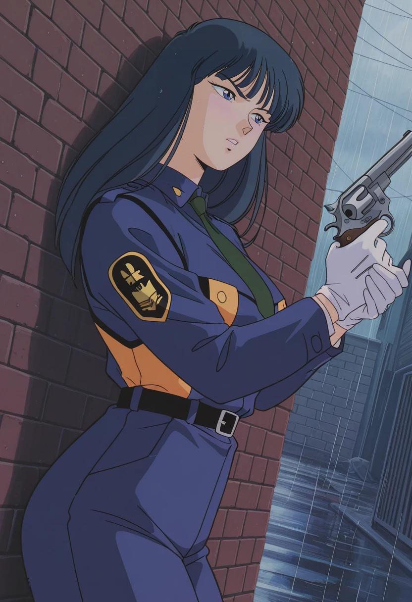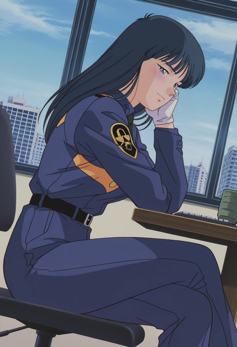 kanukac, 1girl, solo, long hair, black hair, blue eyes, medium breast, curvy, large hips,Police Uniform 1:
