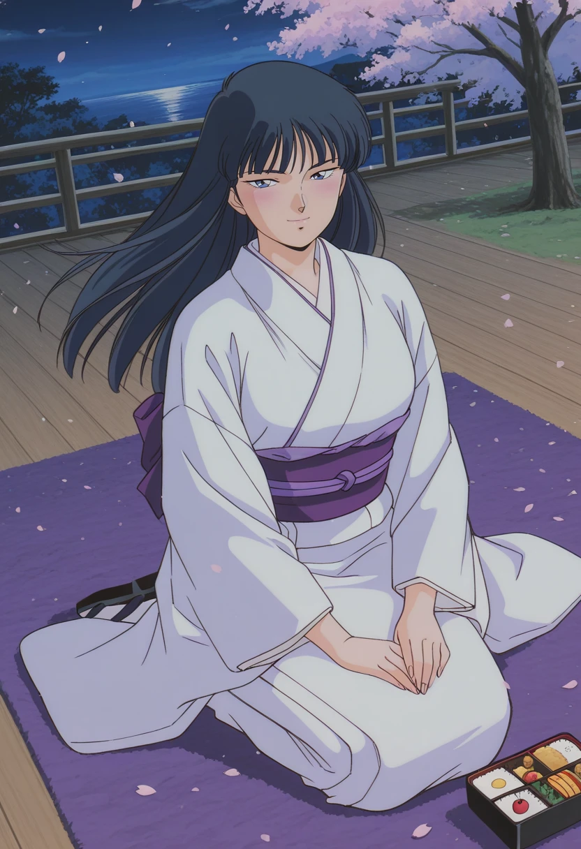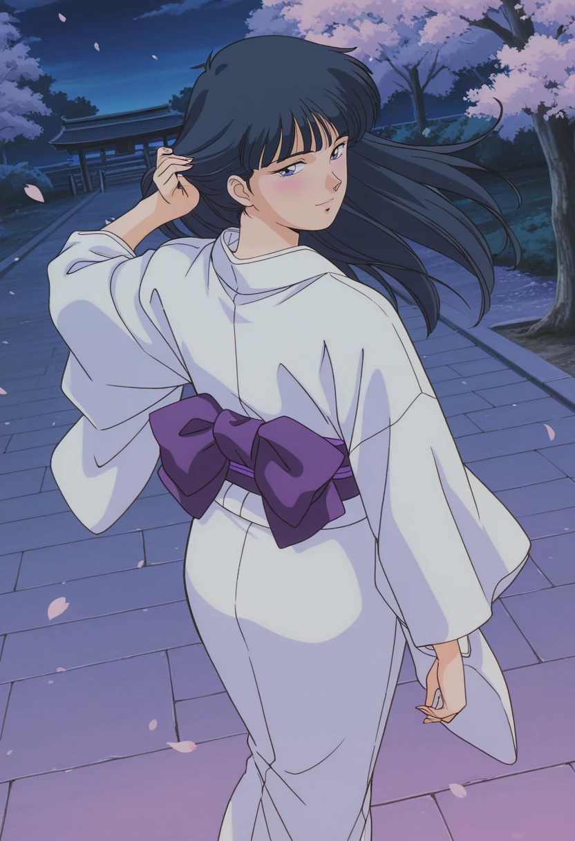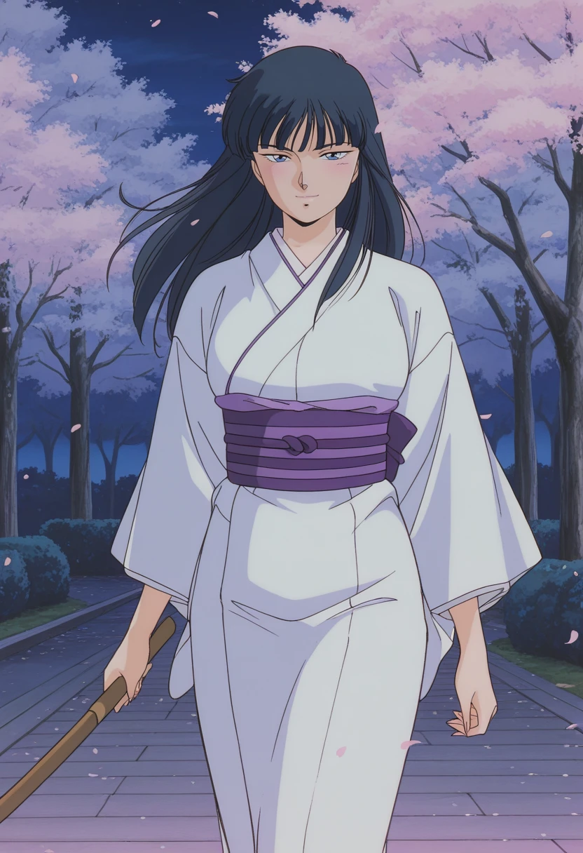 japanese clothes, white kimono, long sleeves, purple sash, back bow, white socks, black sandals, holding bokken,Striped Bikini: