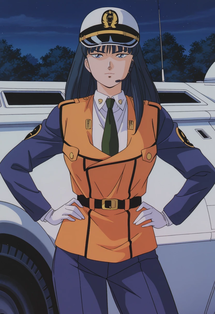police uniform, necktie, white collared shirt, orange vest, blue jacket, long sleeves, white gloves, black belt, blue pants, white shoes,Optional police hat: