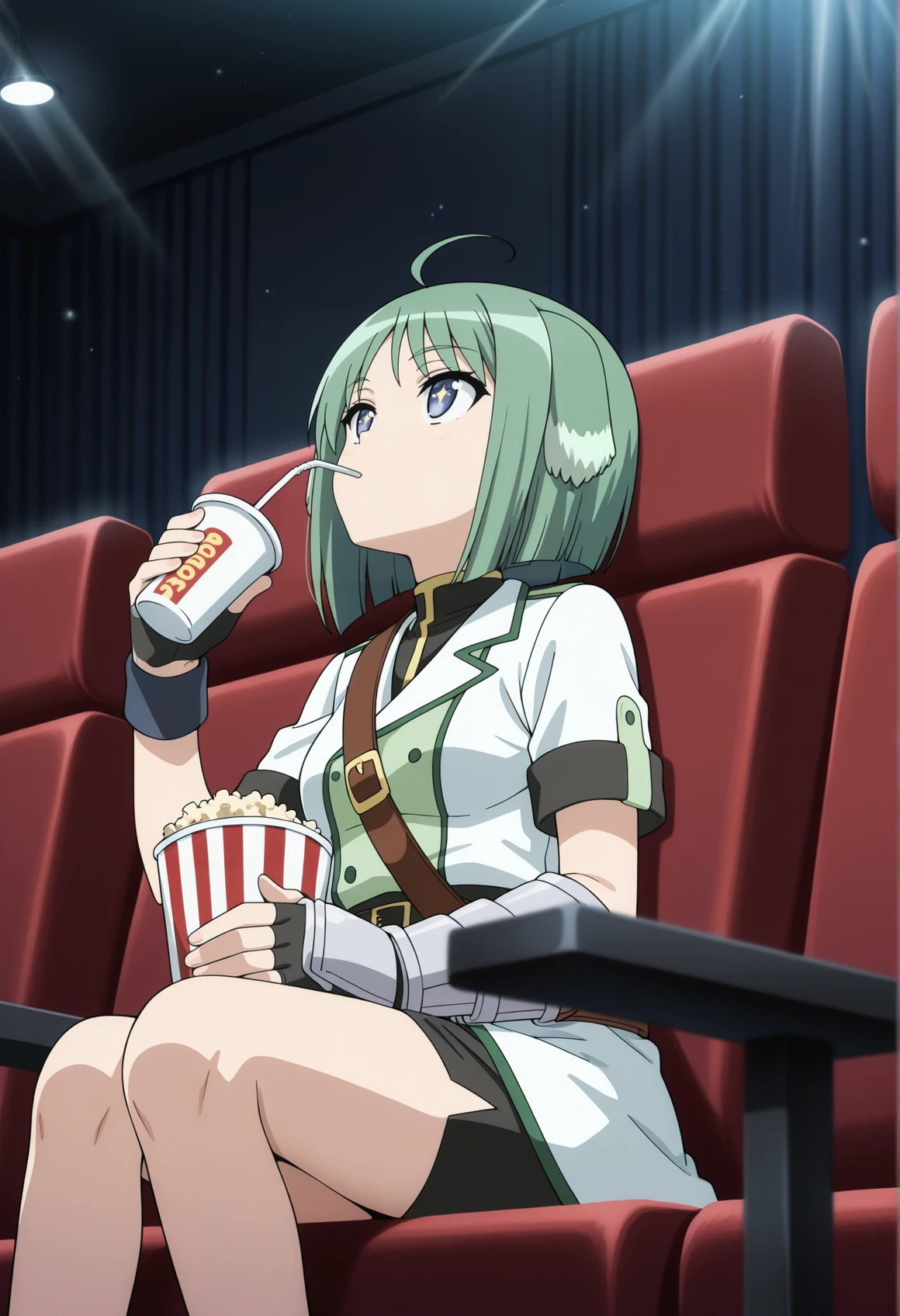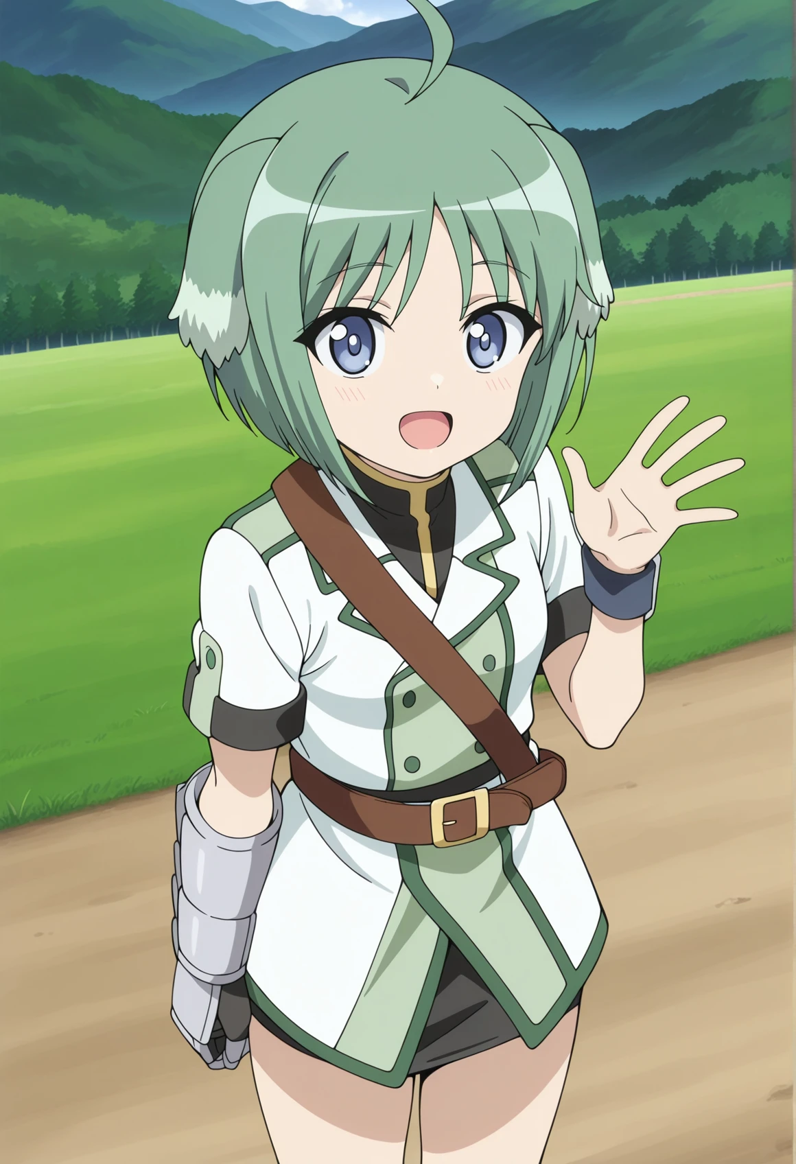 Notable tags: short hair, green hair, dog ears, military uniform, short sleeves, gauntlets, pencil skirt,