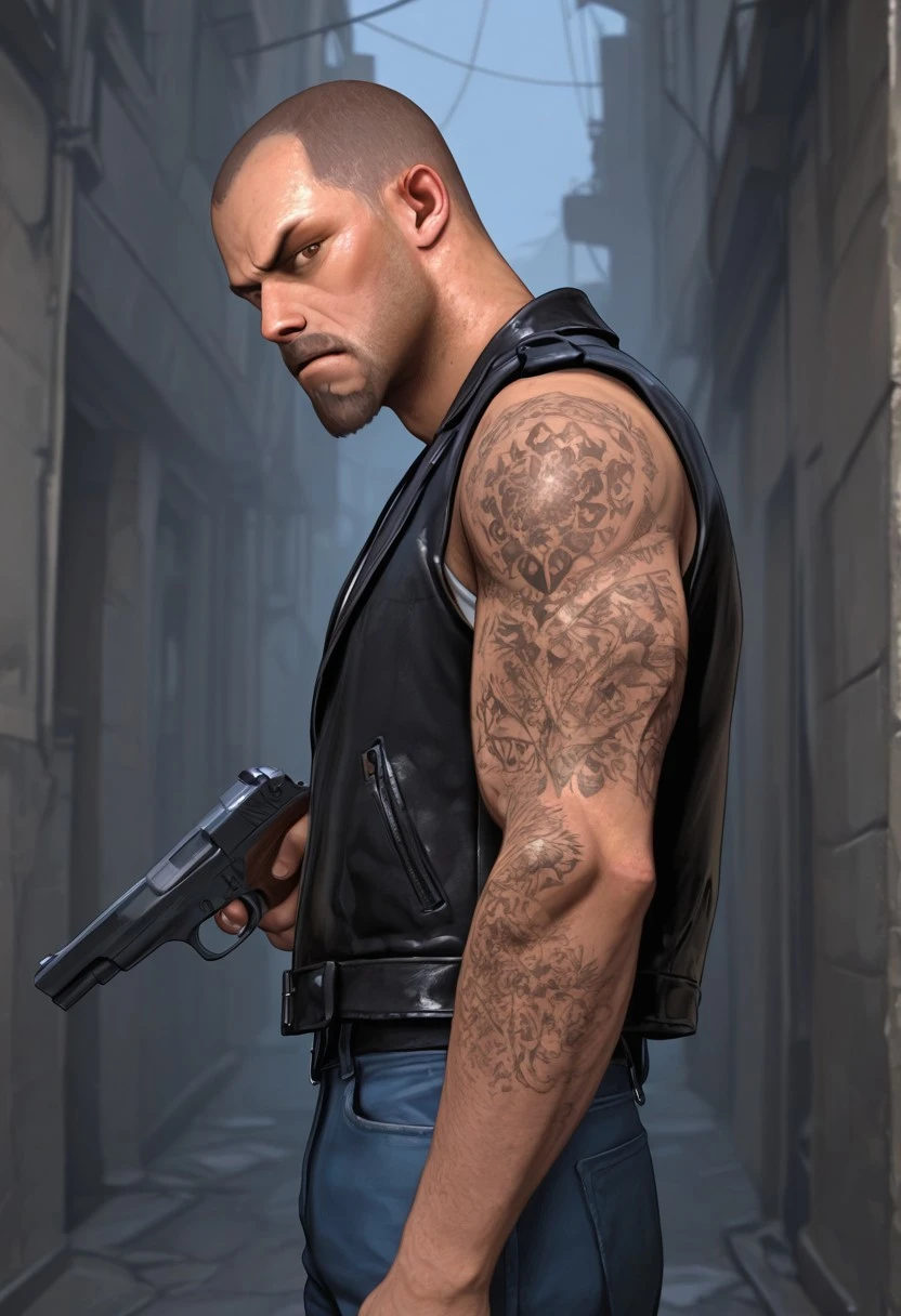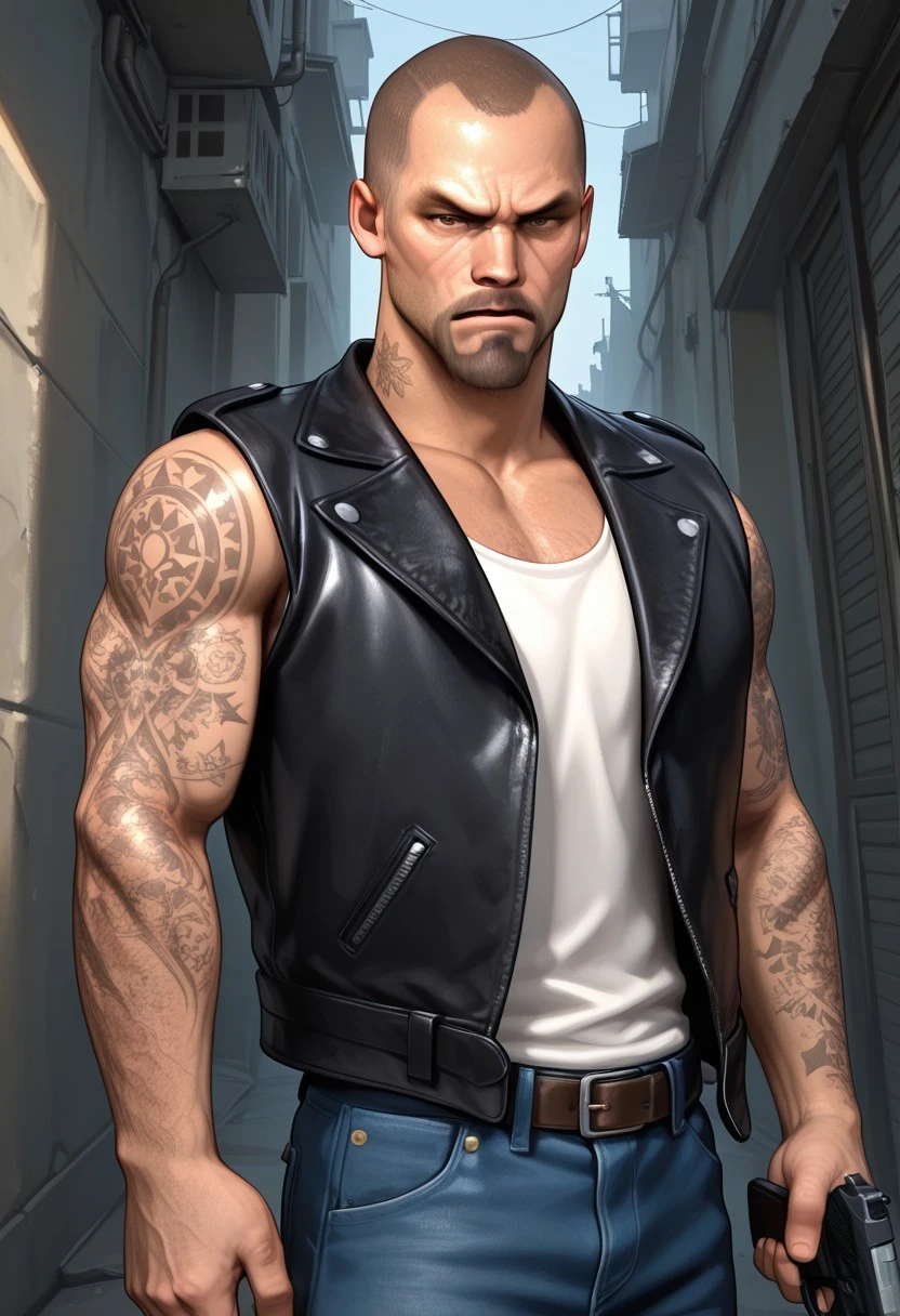 FrancisL4D, 1boy, male, solo male, human, broad shoulders, mature male, brown eyes, athletic build, sleeve tattoos, shaved head, goatee, mustache, facial hair, stubble, scruffy
