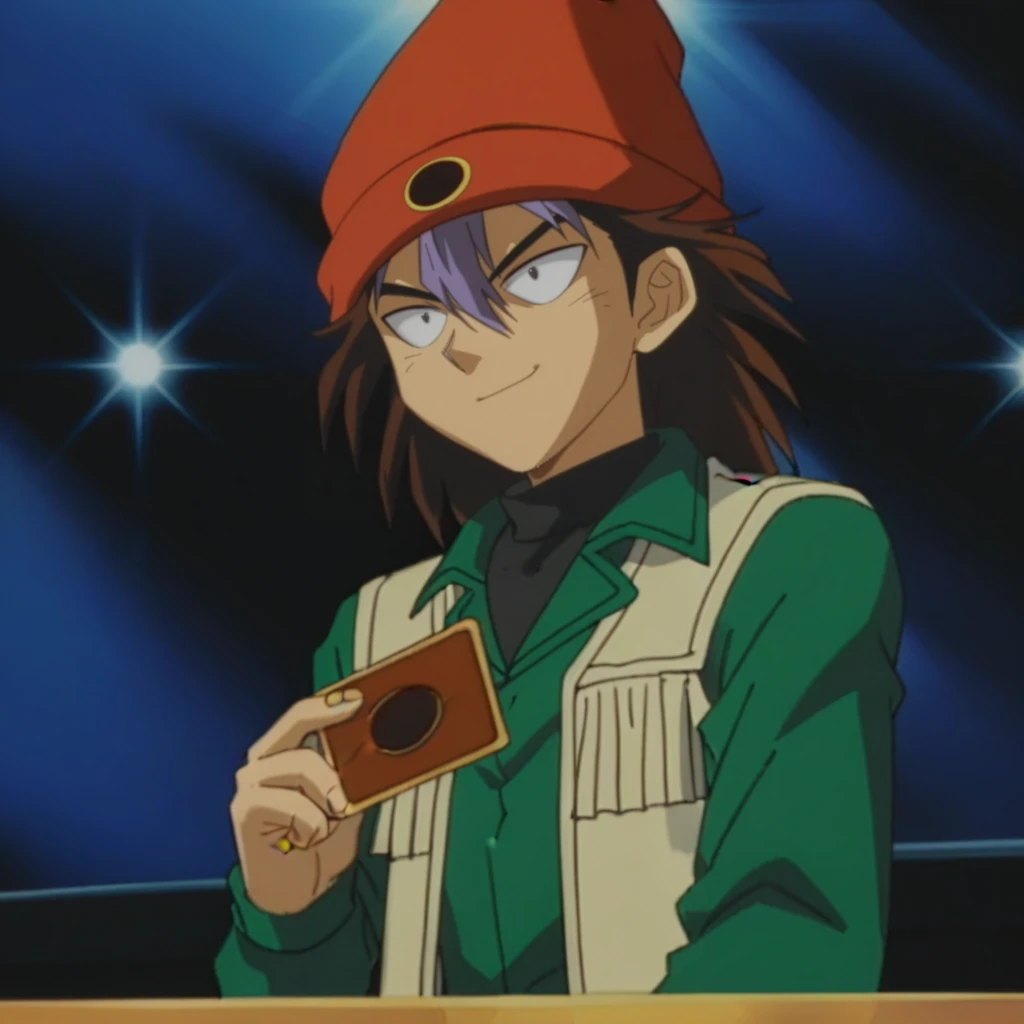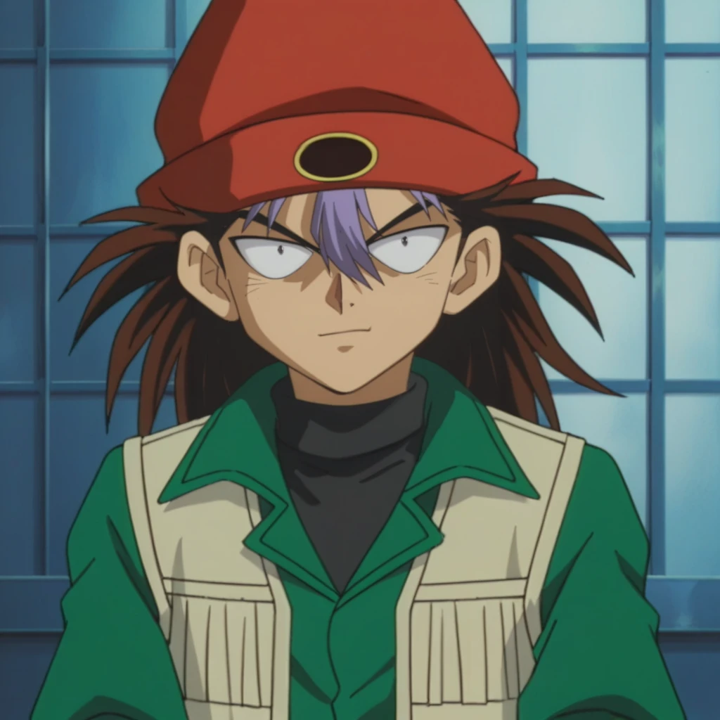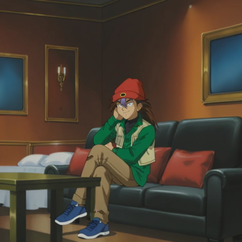 Prompts: male, multicolored hair, two-tone hair, spiked hair, long hair, brown hair, purple bangs, red beanie, black eyes, green jacket, light yellow vest, black undershirt, tan pants, blue sneakers