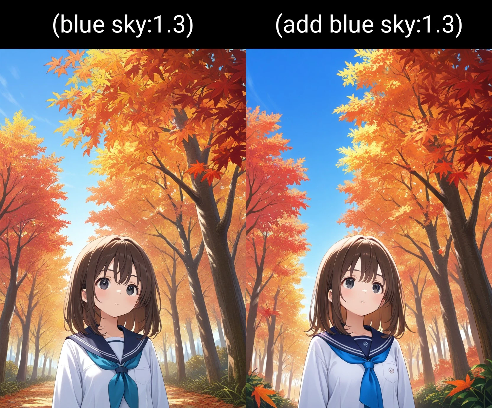 If the tag blue sky results in a sky that looks too pale or washed out, adding this prompt may help deepen the color slightly.