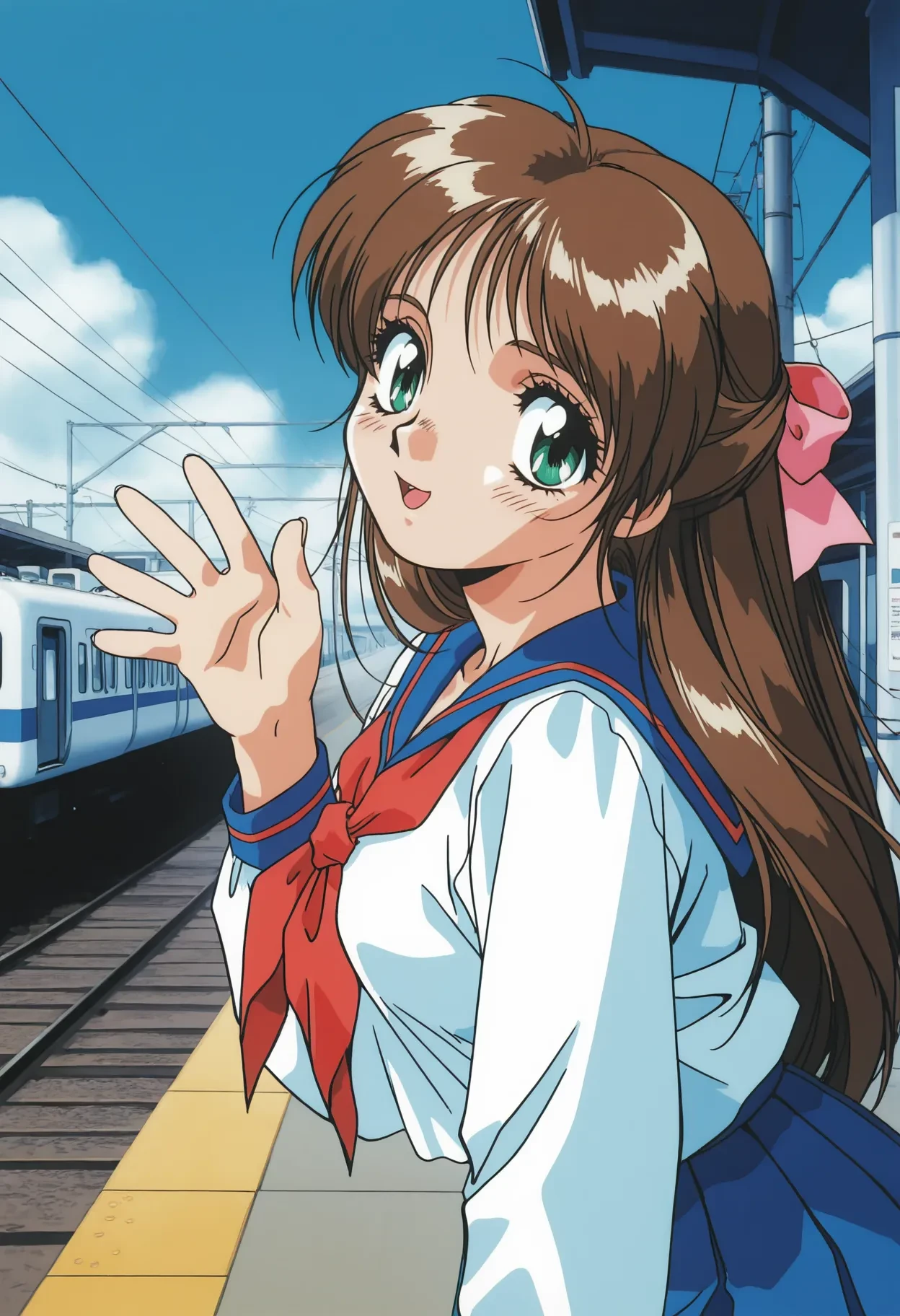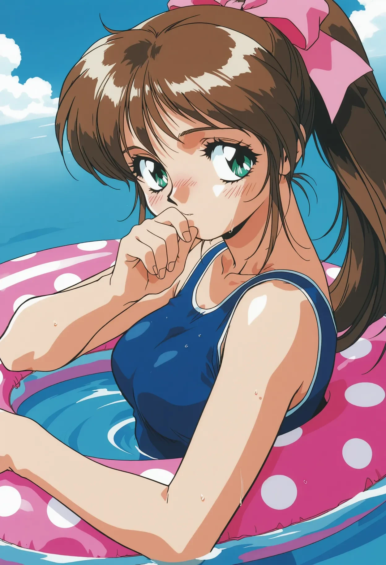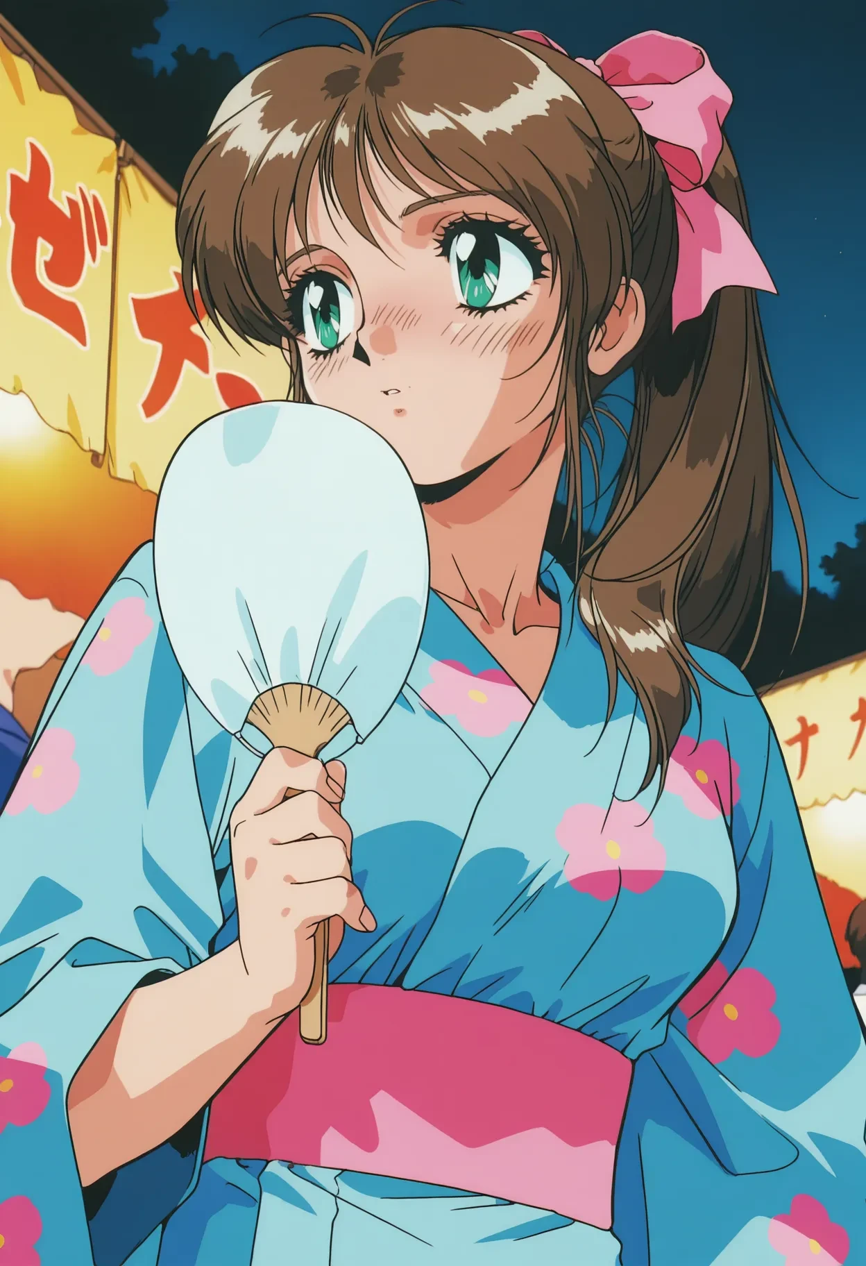 Appearance (Ponytail) : YoshiSally, 1990s \(style\), retro artstyle, jaggy lines, brown hair, long hair, high ponytail, pink hair ribbon, bangs, eyelashes, eye reflection, blush, green eyes, medium breasts,