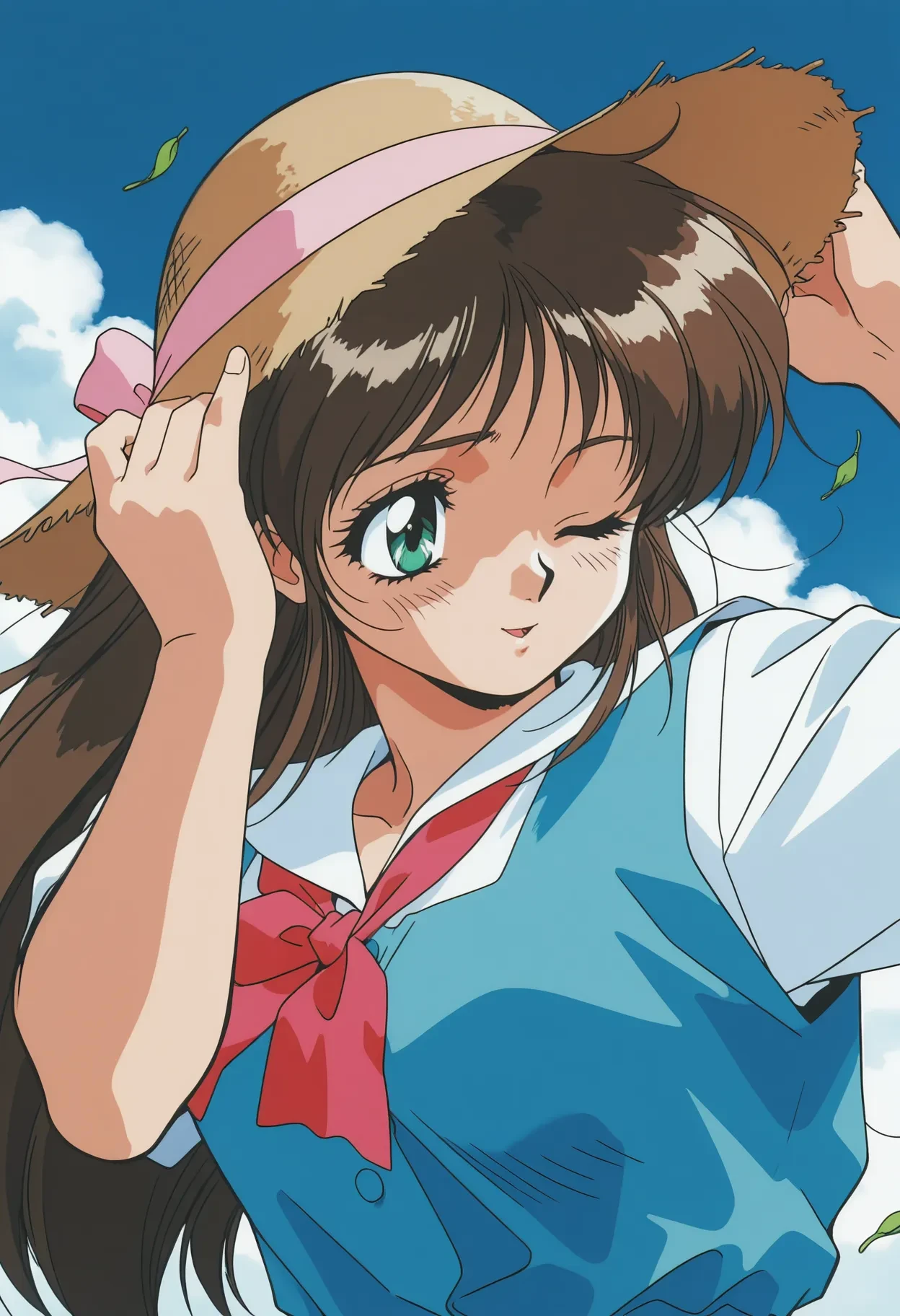 Appearance (HalfUp) : YoshiSally, 1990s \(style\), retro artstyle, jaggy lines, brown hair, long hair, half updo, pink hair ribbon, bangs, eyelashes, eye reflection, blush, green eyes, medium breasts,
