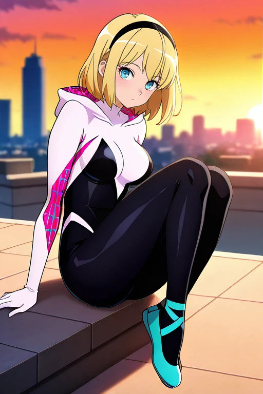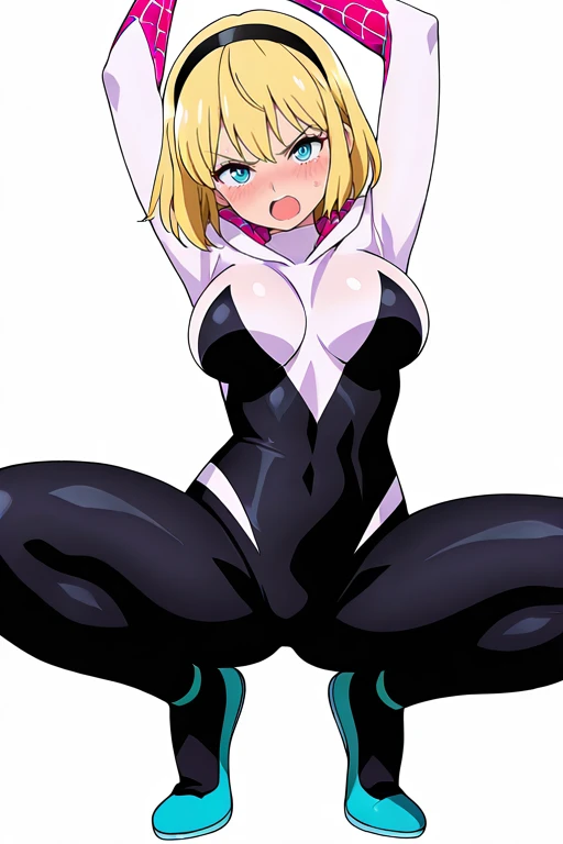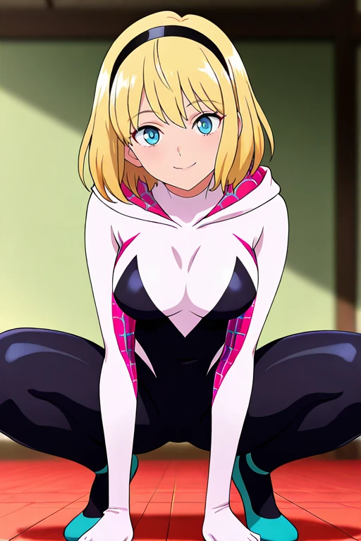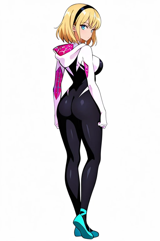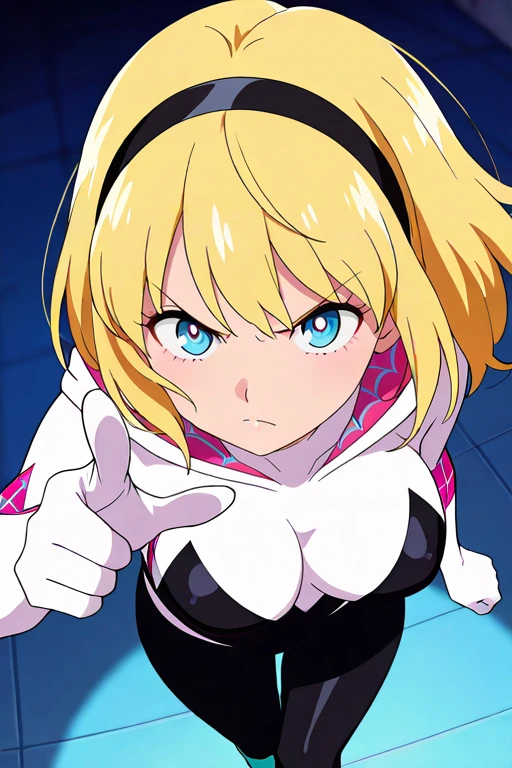 1girl, solo, hdSpiderGwen, short hair, blonde hair, hairband, blue eyes,