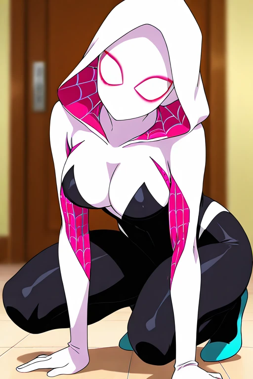 1girl, solo, hdSpiderGwen, hood, mask, hood up,