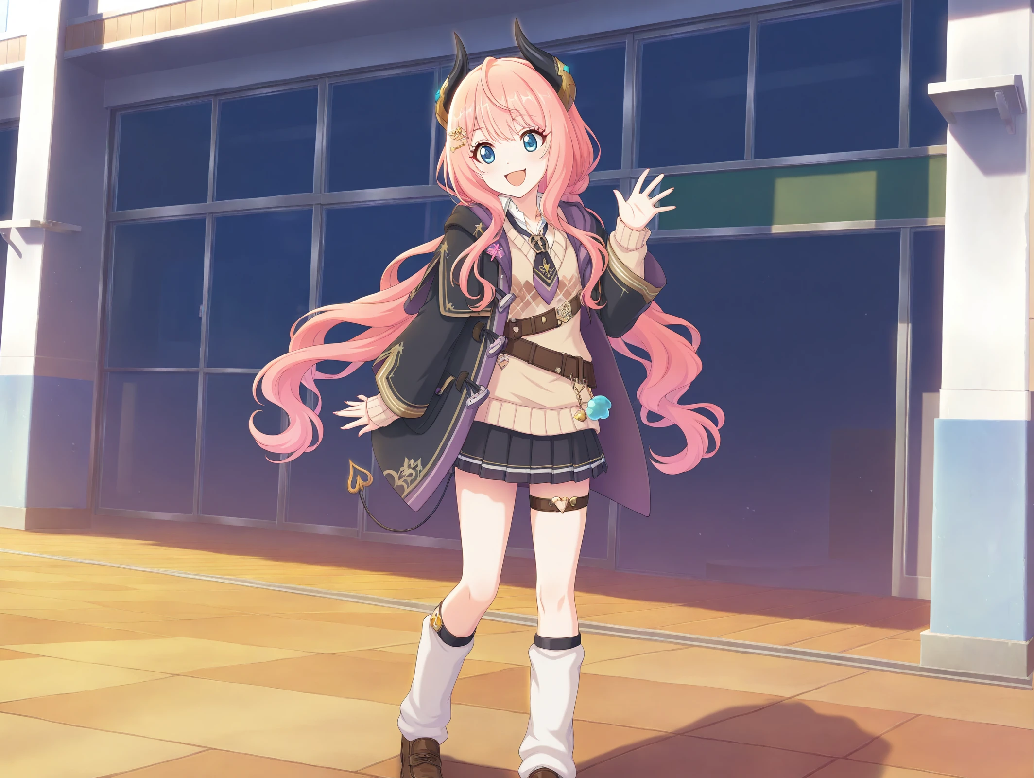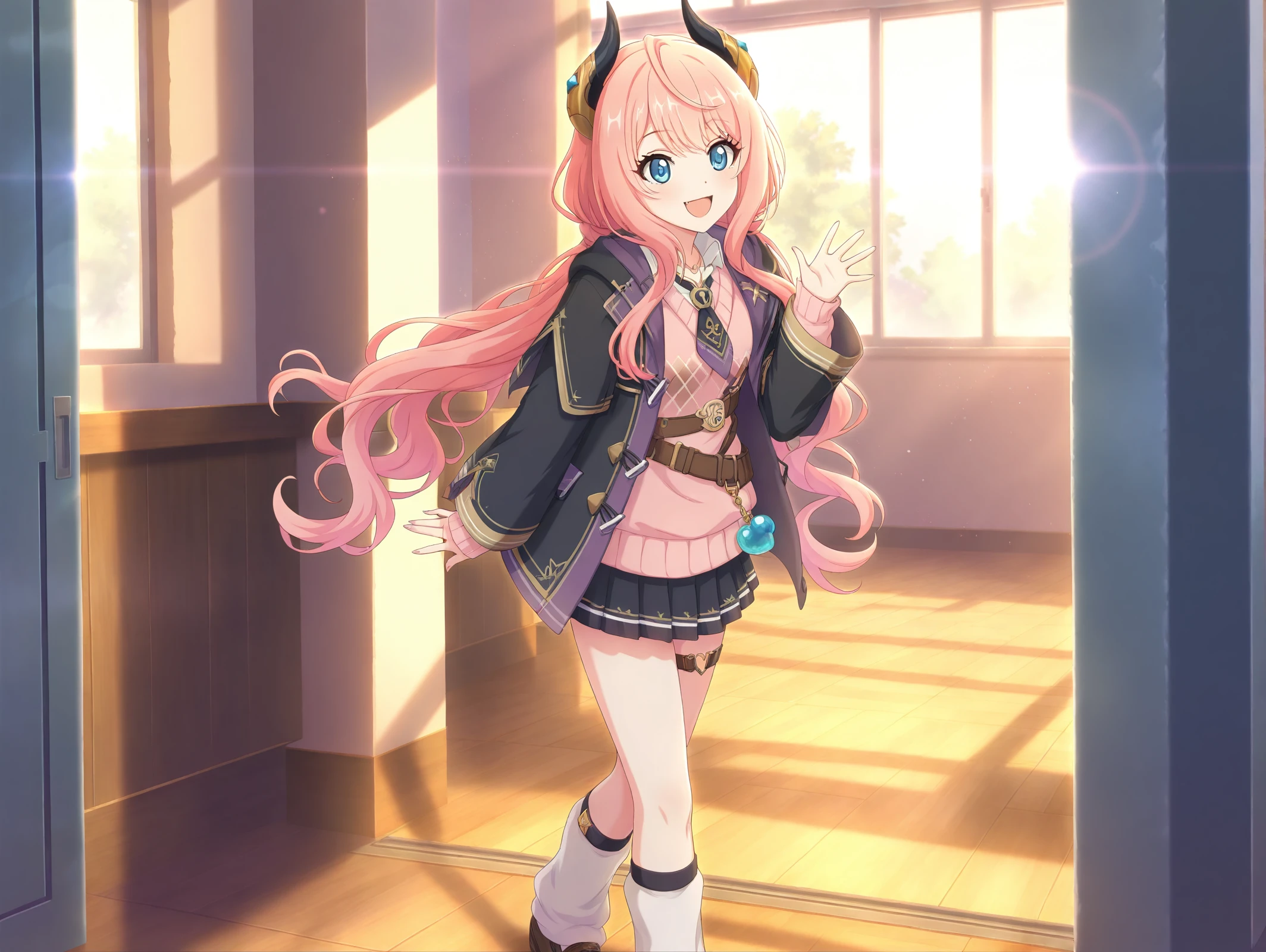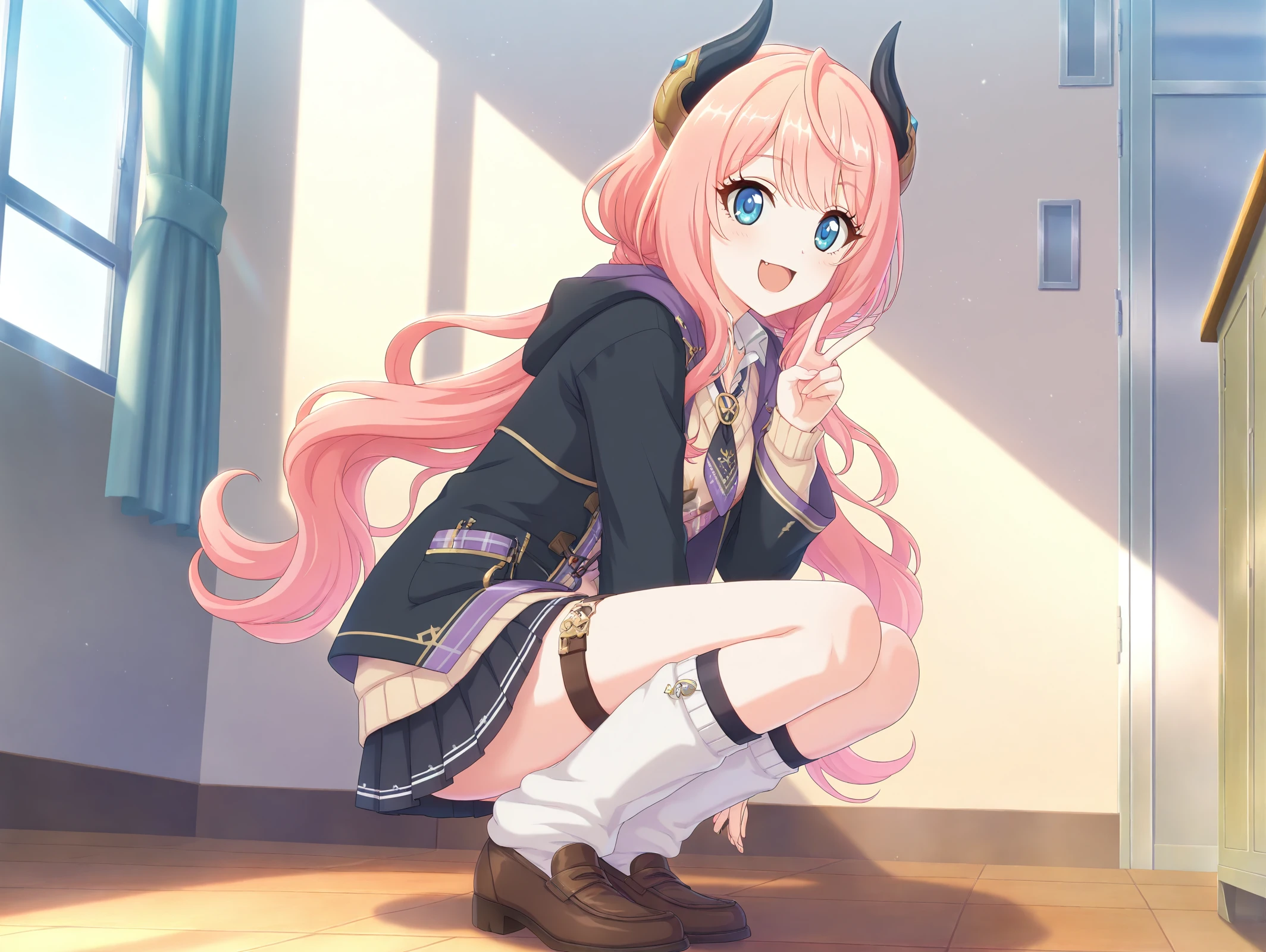 official style,more details,incredibly absurdres,<lora:Suzuna54??:0.9>,1girl,solo,long hair,pink hair,skirt,brown footwear,necktie,socks,pleated skirt,long sleeves,short necktie,blue eyes,sweater,loose socks,black skirt,collared shirt,thigh strap,white socks,black jacket,jacket,demon horns,school,:d,v,