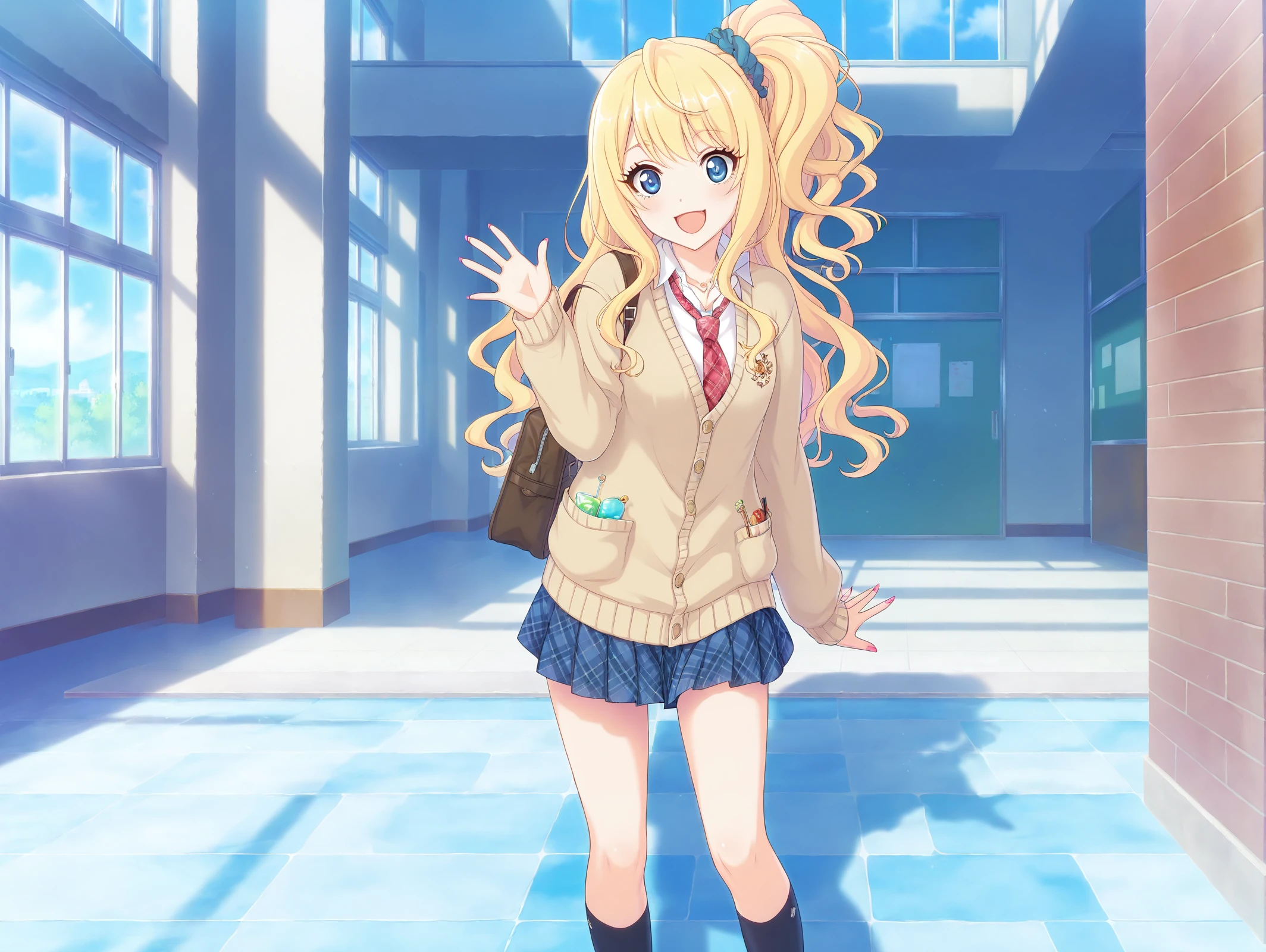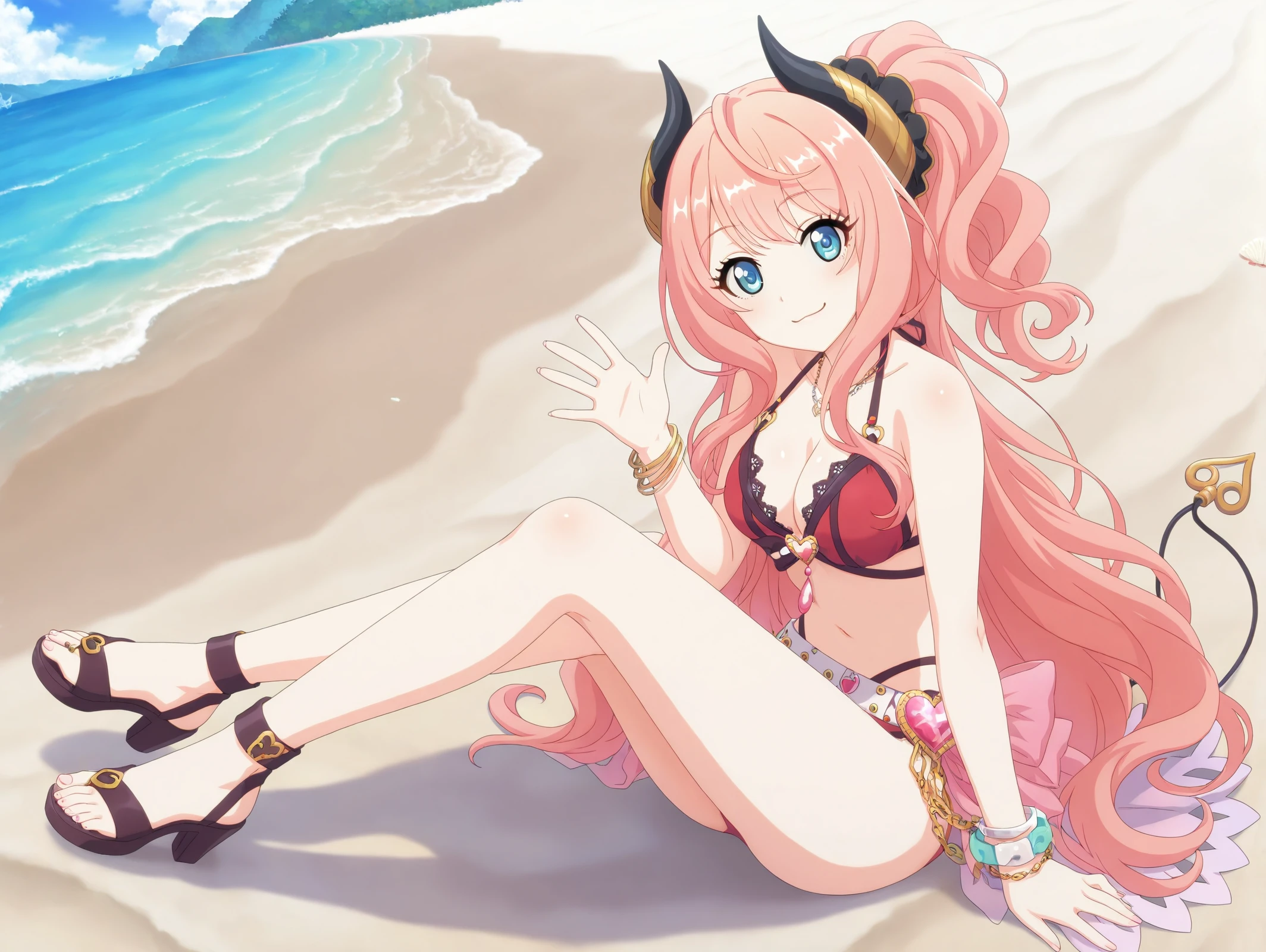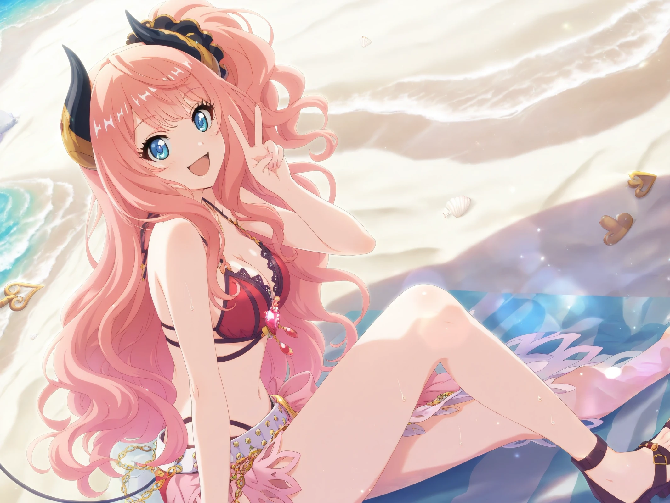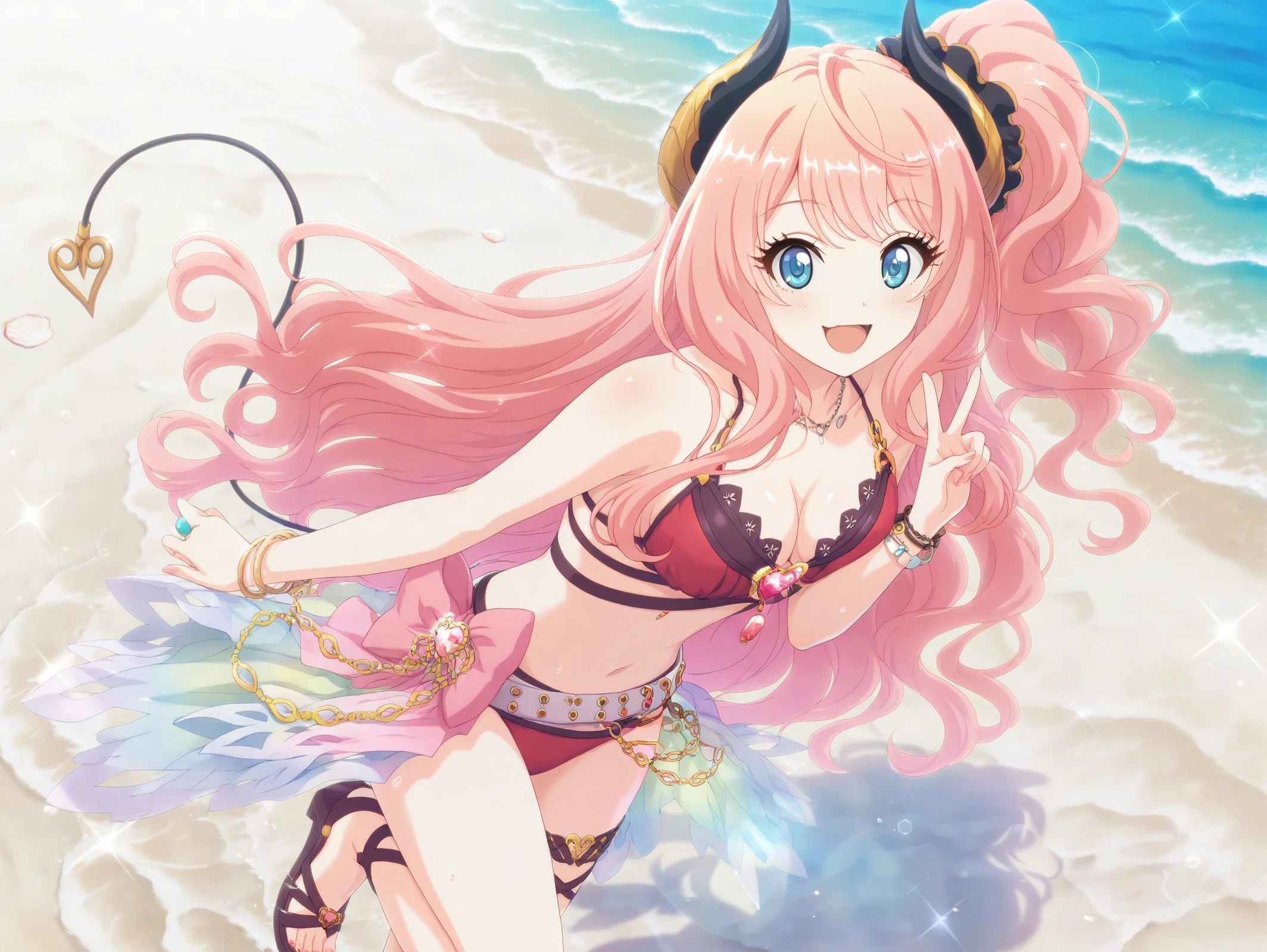 official style,more details,incredibly absurdres,<lora:Suzuna54??:0.9>,1girl,solo,long hair,pink hair,skirt,brown footwear,necktie,socks,pleated skirt,long sleeves,short necktie,blue eyes,sweater,loose socks,black skirt,collared shirt,thigh strap,white socks,black jacket,jacket,demon horns,school,:d,v,