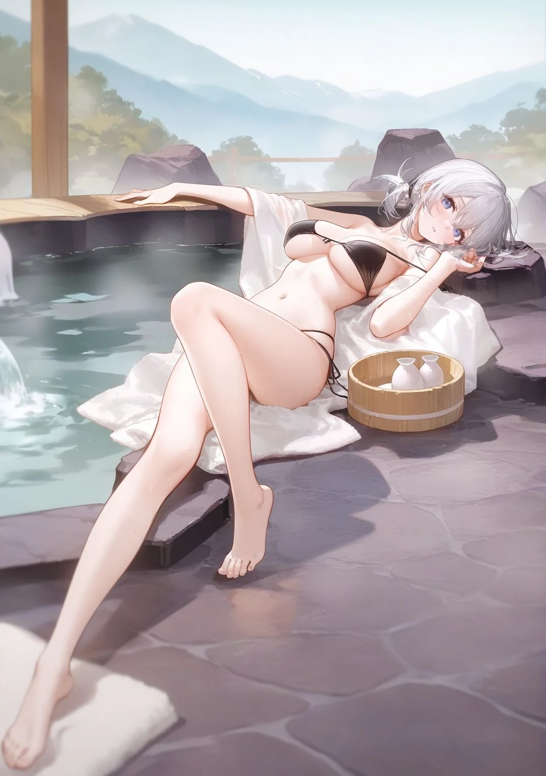 Belleau Hot Spring Skinbelleau (azur lane), white hair, blue eyes, hot spring skin, white bikini, hot onsen, steam, white hair ornament,