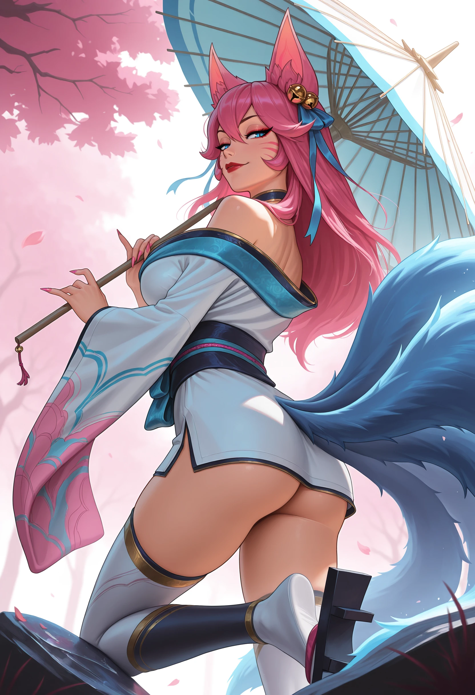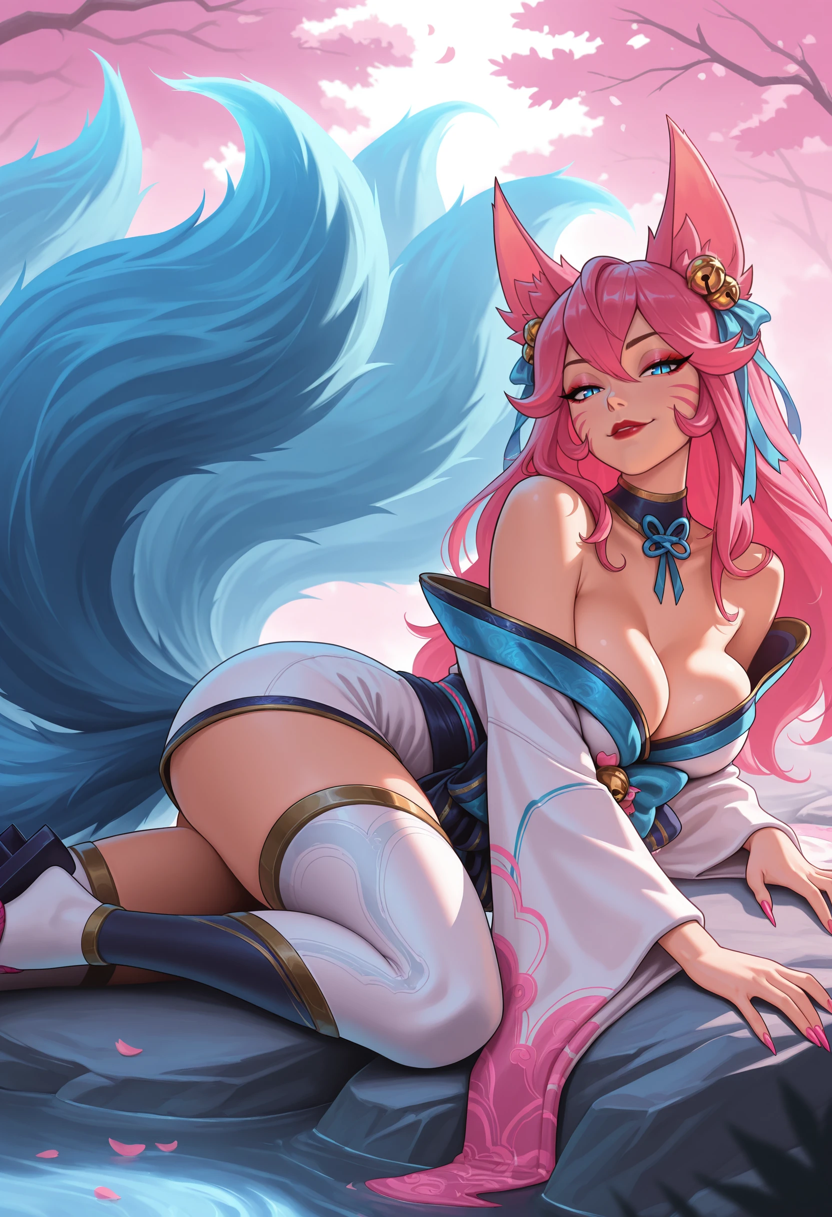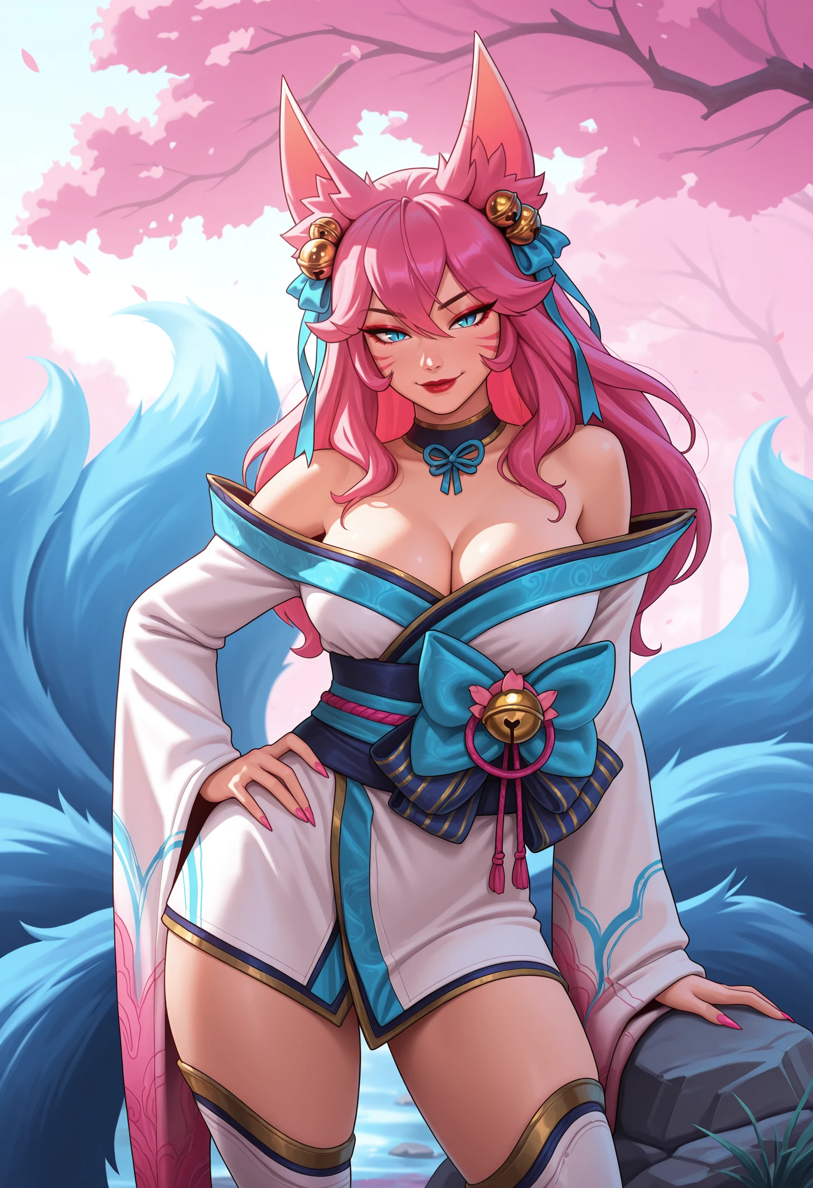 spiritblossomahriil, long hair, pink hair, hair between eyes, hair ornament, hair bell, hair ribbon, blue eyes, eyeshadow, slit pupils, jingle bell, red lips, choker, fox ears, facial mark, whisker markings, fox girl, kitsune, kyuubi, large breasts, japanese clothes, short kimono, long sleeves, wide sleeves, thighhighs, bow, ribbon, blue ribbon, bare shoulders, off shoulder, pink nails, sharp fingernails,