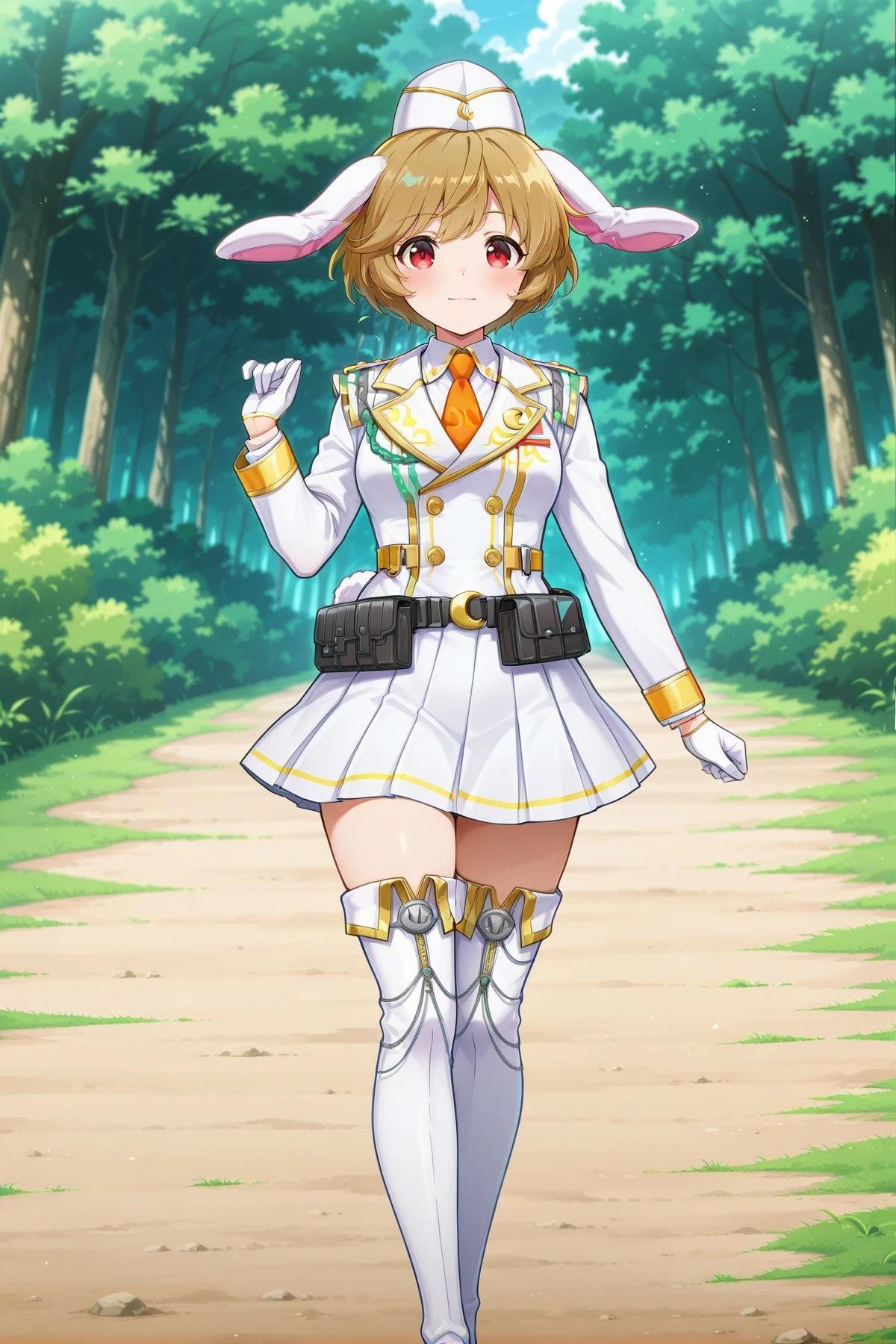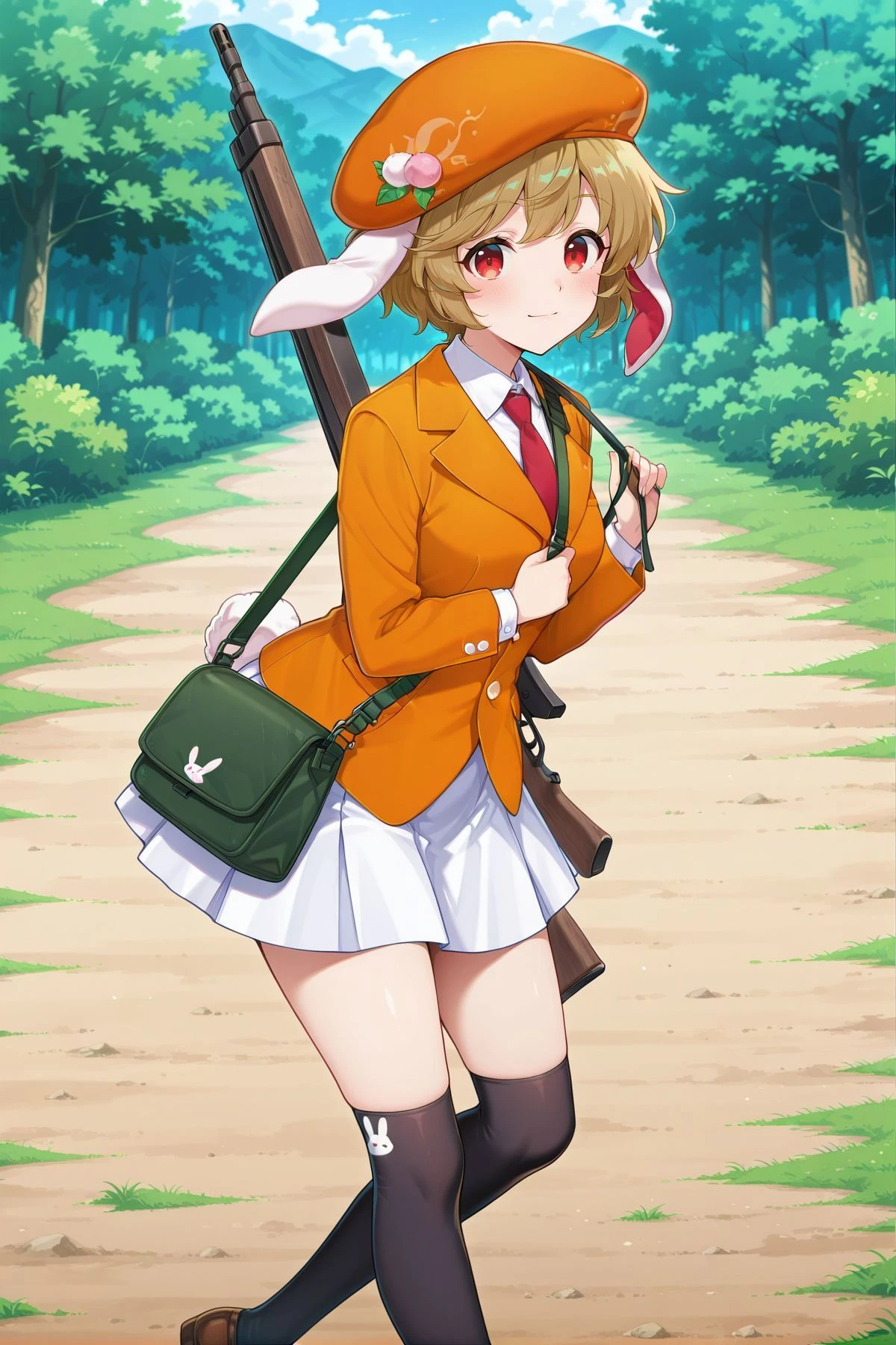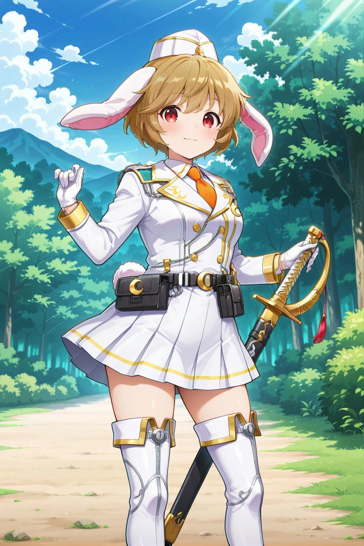 ringo, 1girl, solo, red eyes, brown hair, short hair, rabbit ears, floppy ears, rabbit tail,, ringo \(eagle ravi special forces\), alternate costume, green headwear, beret, red necktie, green jacket, collared shirt, white shirt, yellow skirt, pleated skirt, brown belt, belt bag, white socks, brown footwear, backpack, brown bag, holding lunatic gun,ringo, 1girl, solo, red eyes, brown hair, short hair, bangs pinned back, rabbit ears, floppy ears, rabbit tail, medium breasts,, ringo \(codename mandarin\), alternate costume, silver dango hariclip, domino mask, orange mask, red cape, bolt symbol, detached collar, orange collar, bare shoulders, cleavage, wrestling outfit, crop top, orange shirt, orange armband, frilled armband, elbow sleeve, fingerless gloves, orange gloves, midriff, black belt, crescent belt buckle, orange skirt, bike shorts under skirt, black shorts, black knee pads, kneehighs, cross-laced footwear, orange boots, paw shoes,ringo, 1girl, solo, red eyes, brown hair, short hair, rabbit ears, floppy ears, rabbit tail,, ringo \(white rabbit investigation team\), alternate costume, white headwear, orange necktie, crescent pin, military uniform, gold trim, double-breasted, white jacket, long sleeves, collared shirt, white shirt, white gloves, pleated skirt, white skirt, black belt, utility belt, thigh boots, white boots, sword, sheath, ringo, 1girl, solo, red eyes, brown hair, short hair, rabbit ears, floppy ears, rabbit tail, aged up,, ringo \(the orange eagle ravi\), alternate costume, orange beret, dango hat ornament, red necktie, orange jacket, long sleeves, white buttons, white shirt, collared shirt, pleated skirt, white skirt, black kneehighs, brown shoes, shoulder bag, green bag, weapon on back, assault rifle,ringo, 1girl, solo, red eyes, brown hair, short hair, rabbit ears, floppy ears, rabbit tail,, ringo \(veteran detective of the capital\), alternate costume, white space helmet, unworn helmet, helmet on back, brown coat, open coat, long sleeves, spacesuit, grey suit, gold trim, black belt, crescent belt buckle, grey skirt, pencil skirt, grey pantyhose, multicolored boots, grey boots, yellow boots, holding weapon, rocket launcher, Illustrious V1