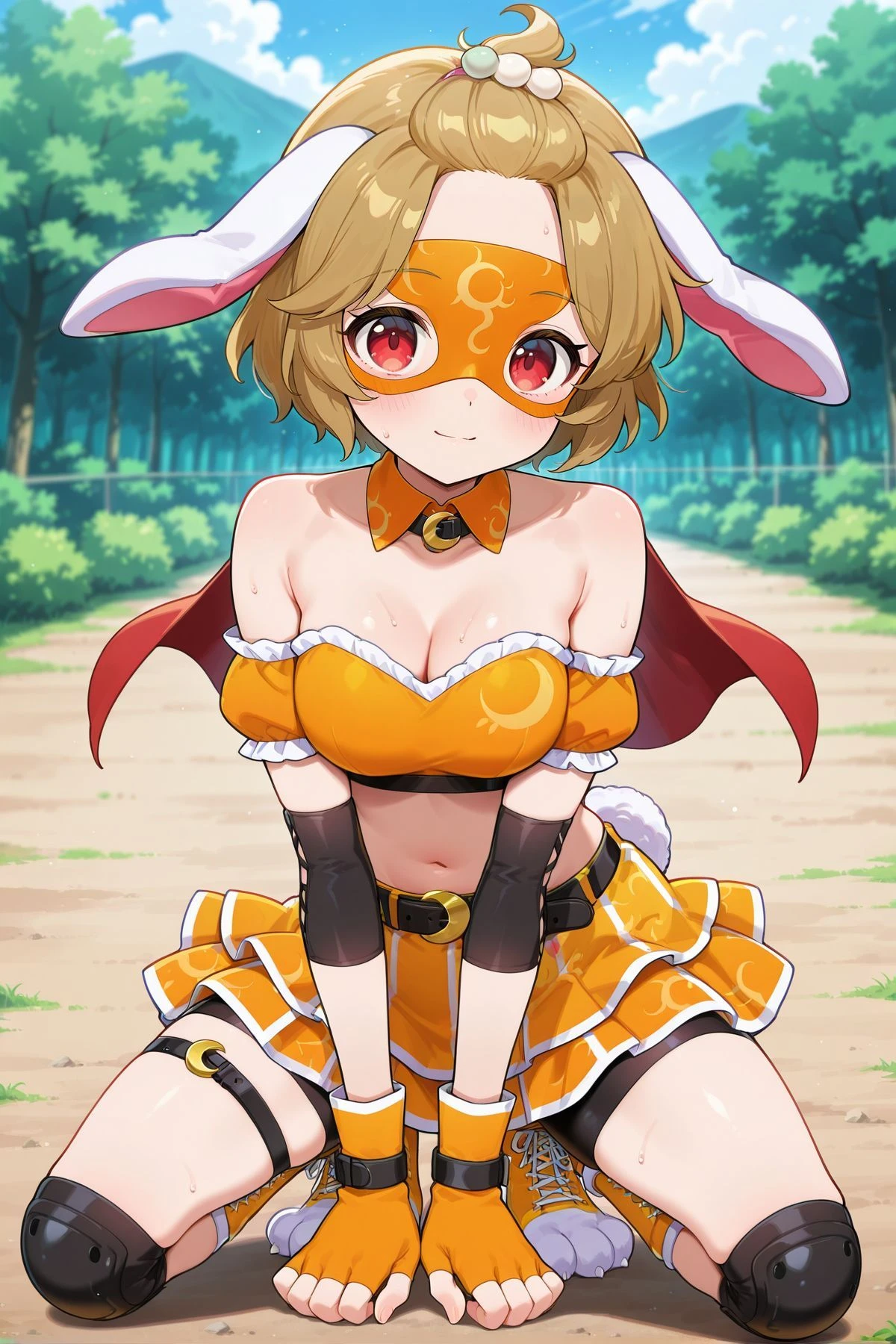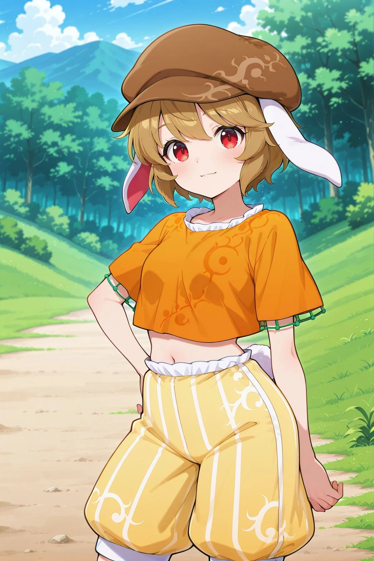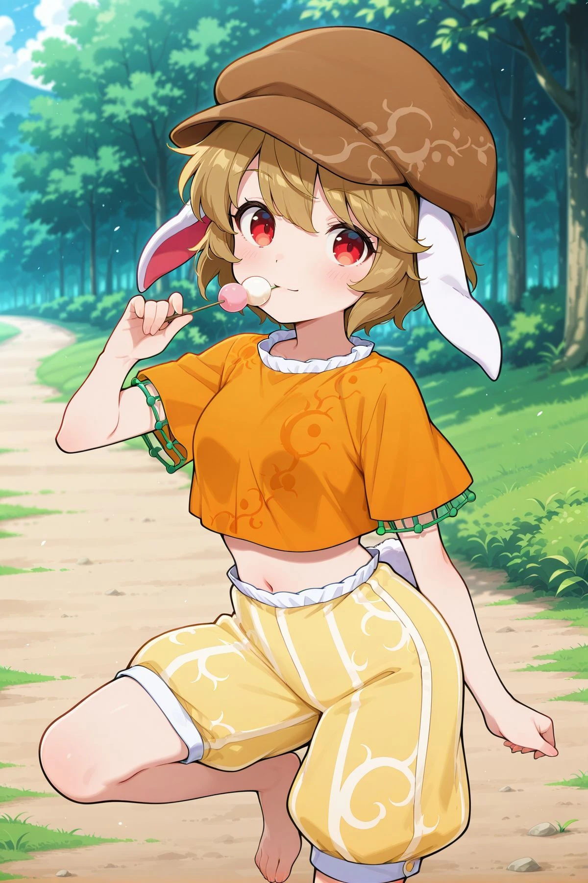 ringo, 1girl, solo, red eyes, brown hair, short hair, rabbit ears, floppy ears, rabbit tail,brown hat, newsboy cap, orange shirt, short sleeves, midriff, yellow shorts, barefoot, Optional :