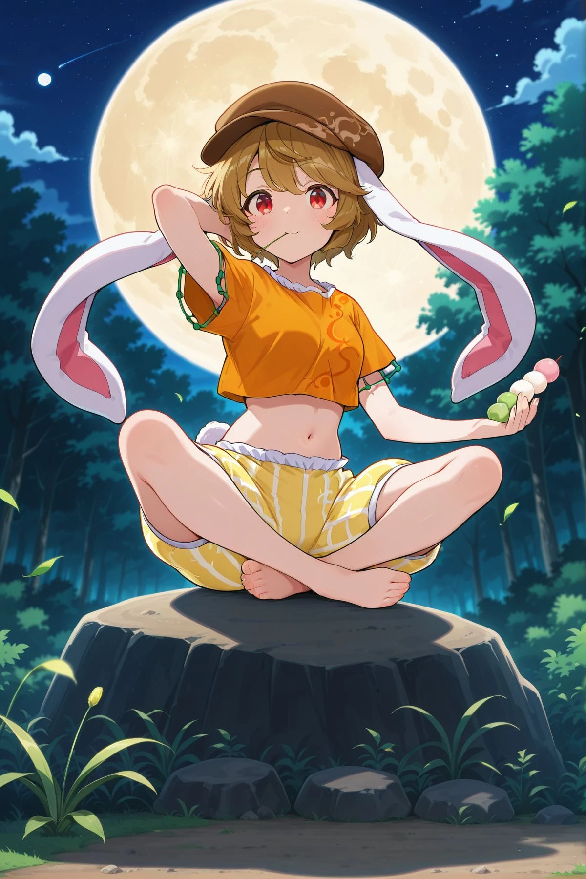 ringo, 1girl, solo, red eyes, brown hair, short hair, rabbit ears, floppy ears, rabbit tail,,brown hat, newsboy cap, orange shirt, short sleeves, midriff, yellow shorts, barefoot, Optional :