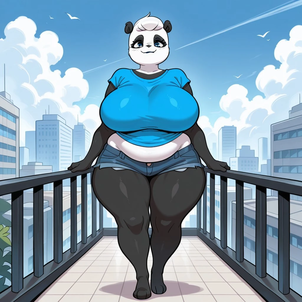 bear, giant panda, white and black fur, bangs, blue eyes, black nose, panda ears, black lips, chubby, huge breasts, wide hips