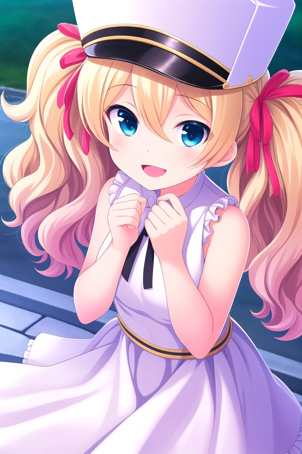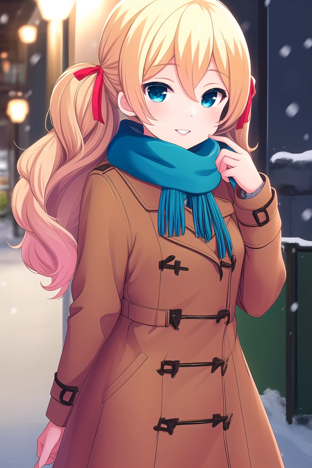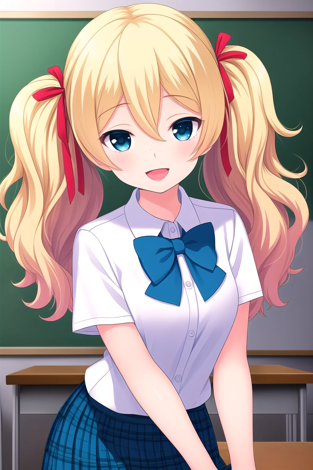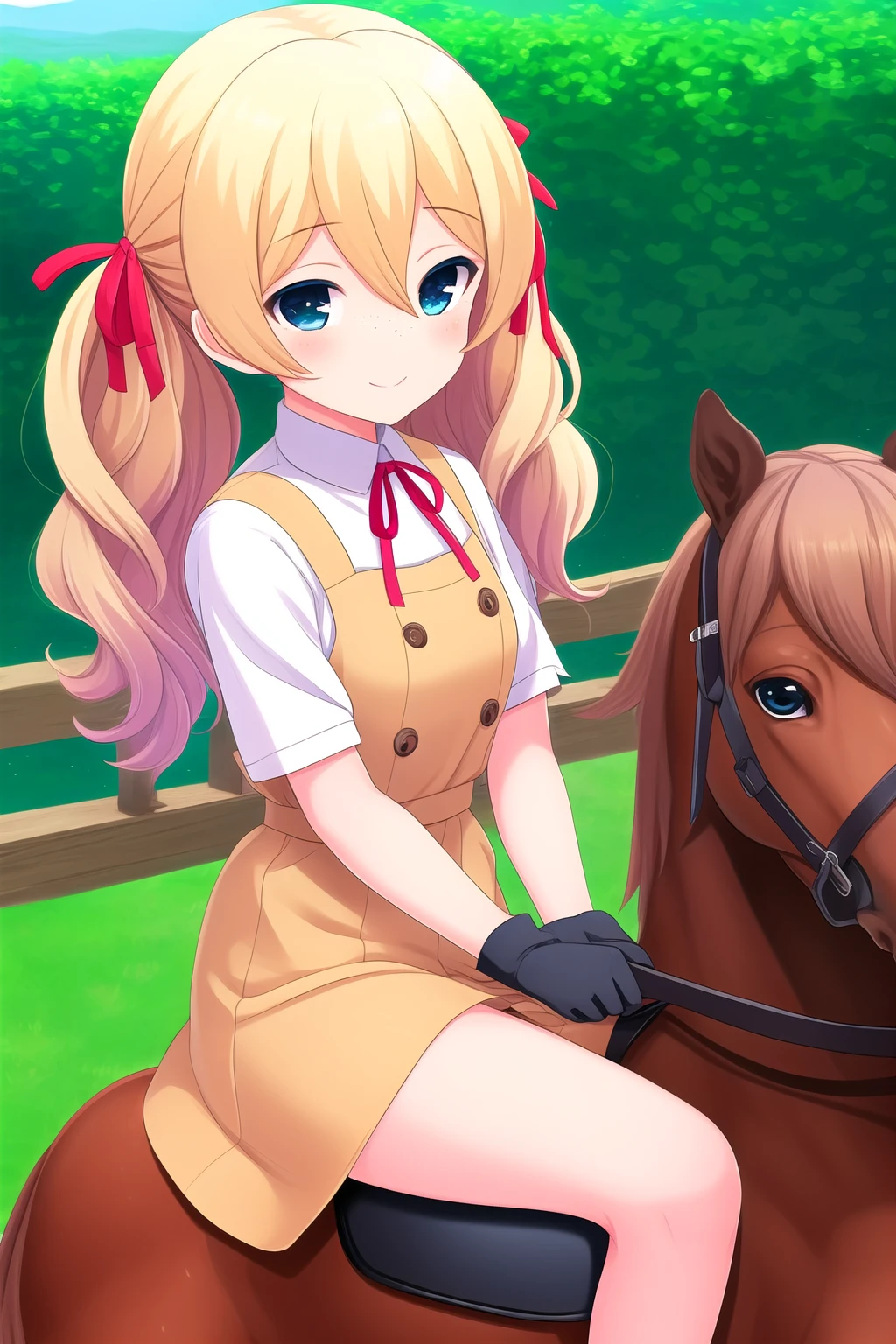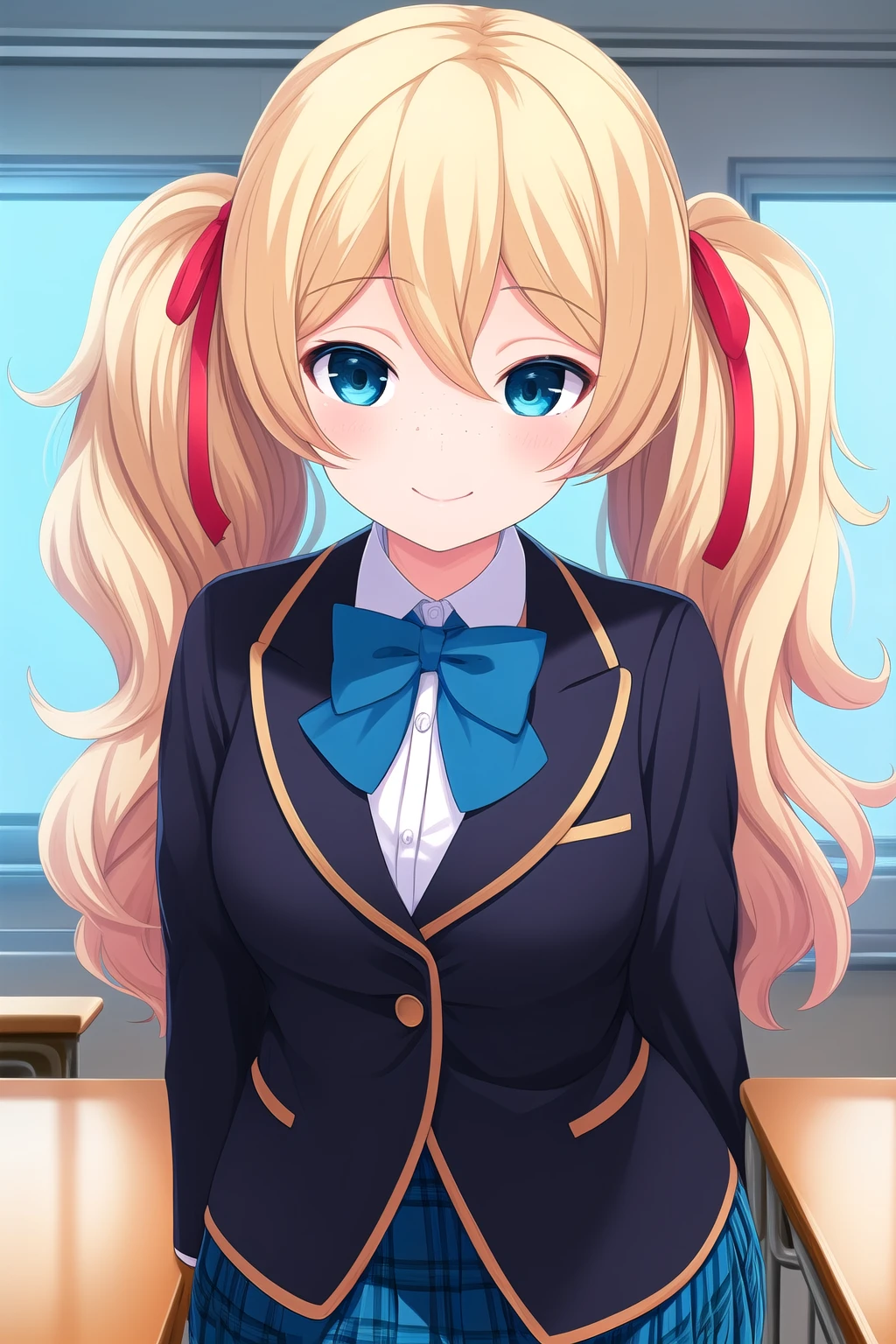 blonde hair, hair ribbon, red ribbon, twintails, wavy hair, hair between eyes, blue eyes, freckles