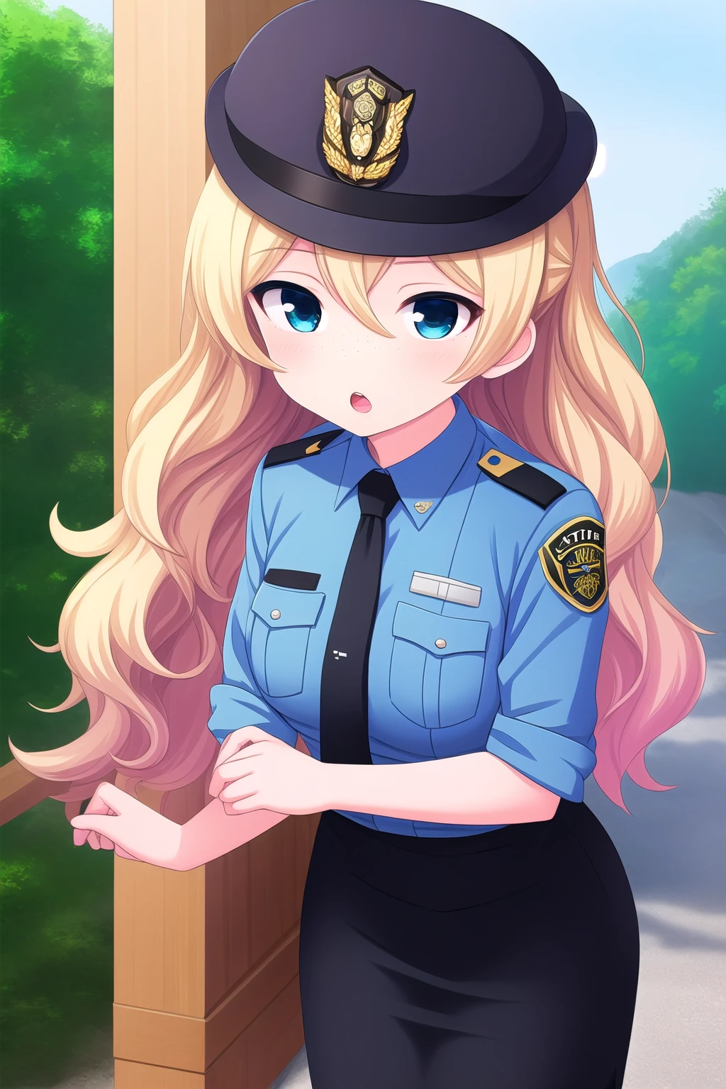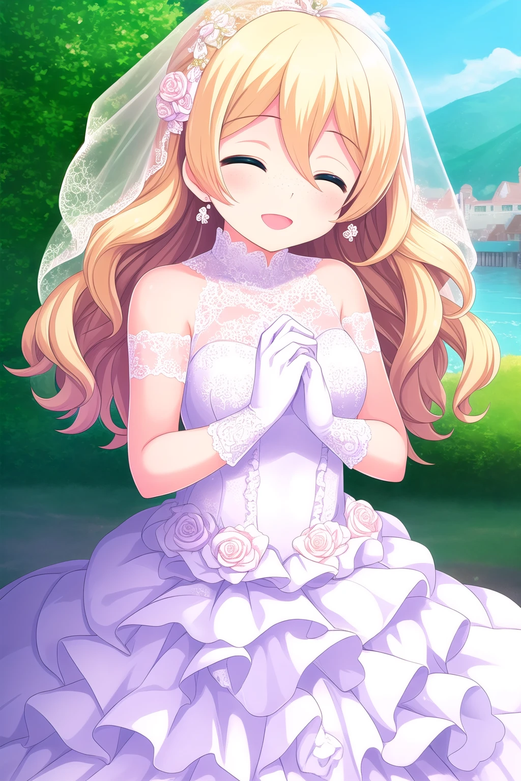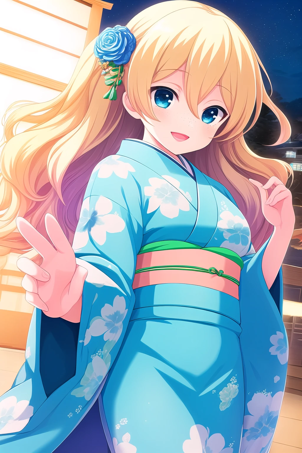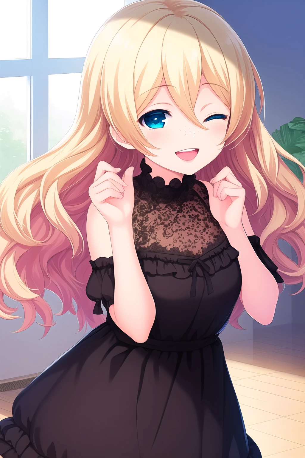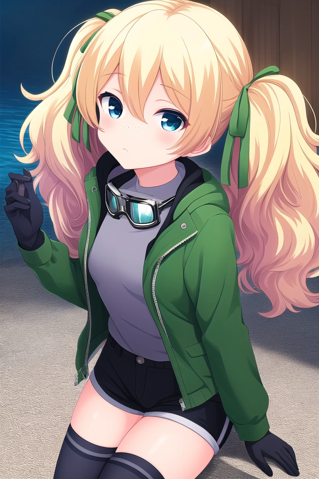 blonde hair, hair ribbon, red ribbon, twintails, wavy hair, hair between eyes, blue eyes, freckles