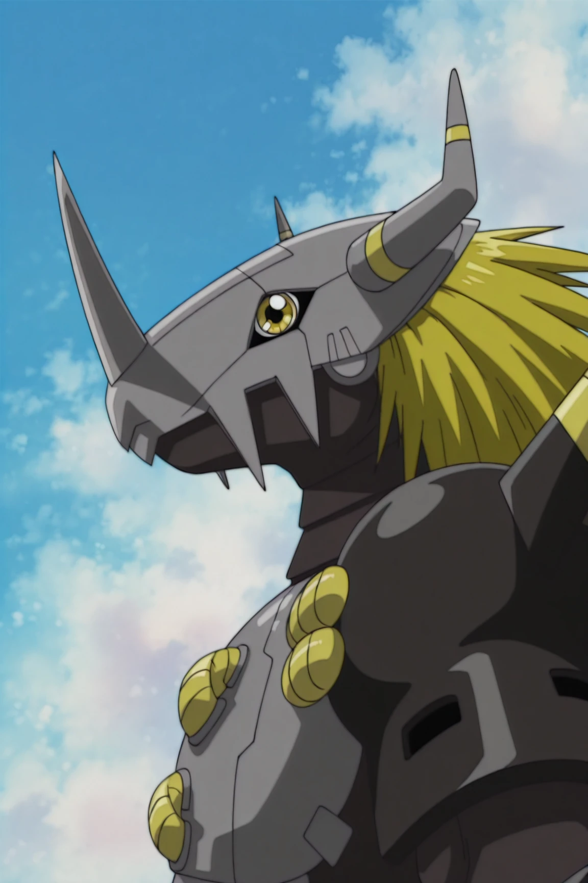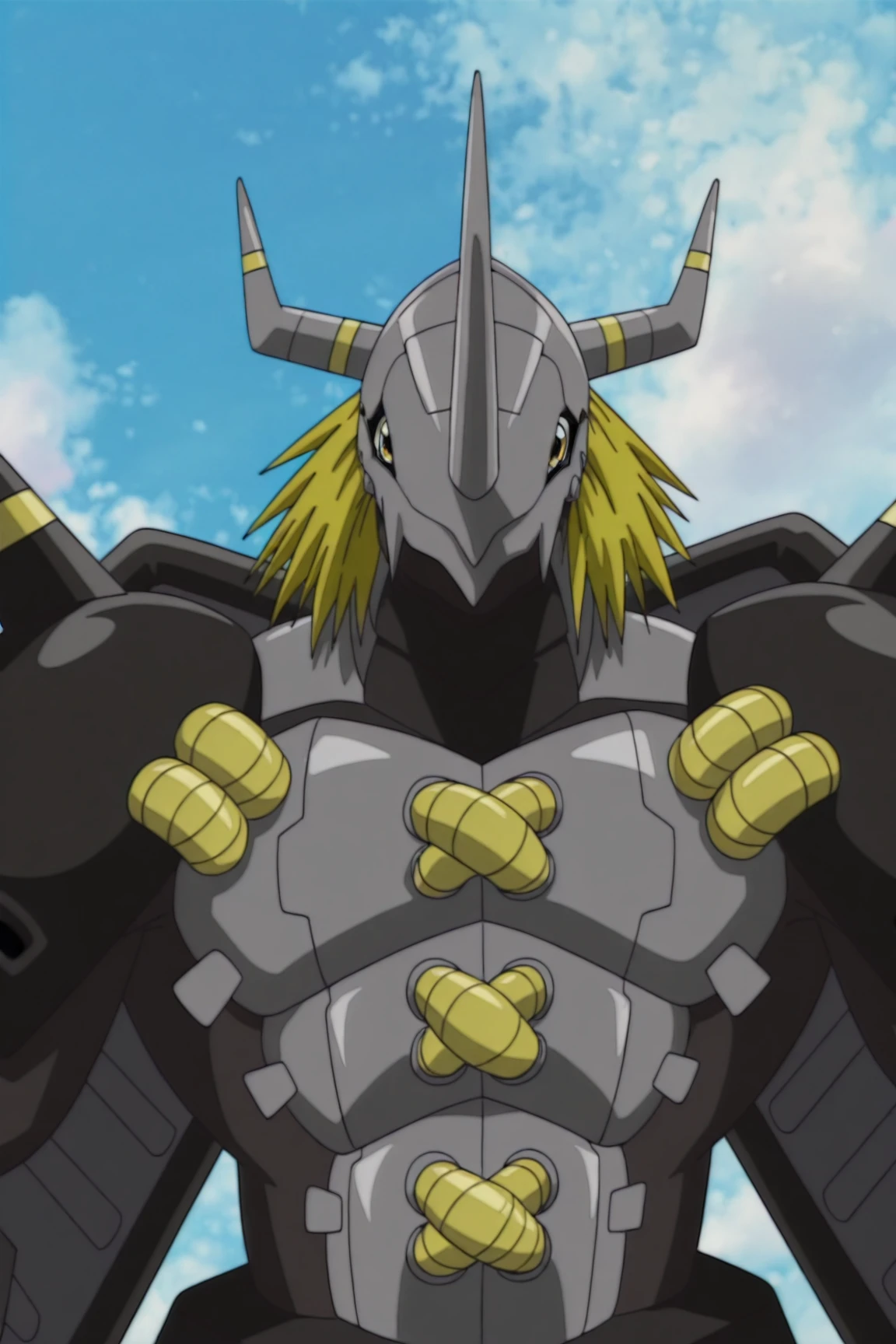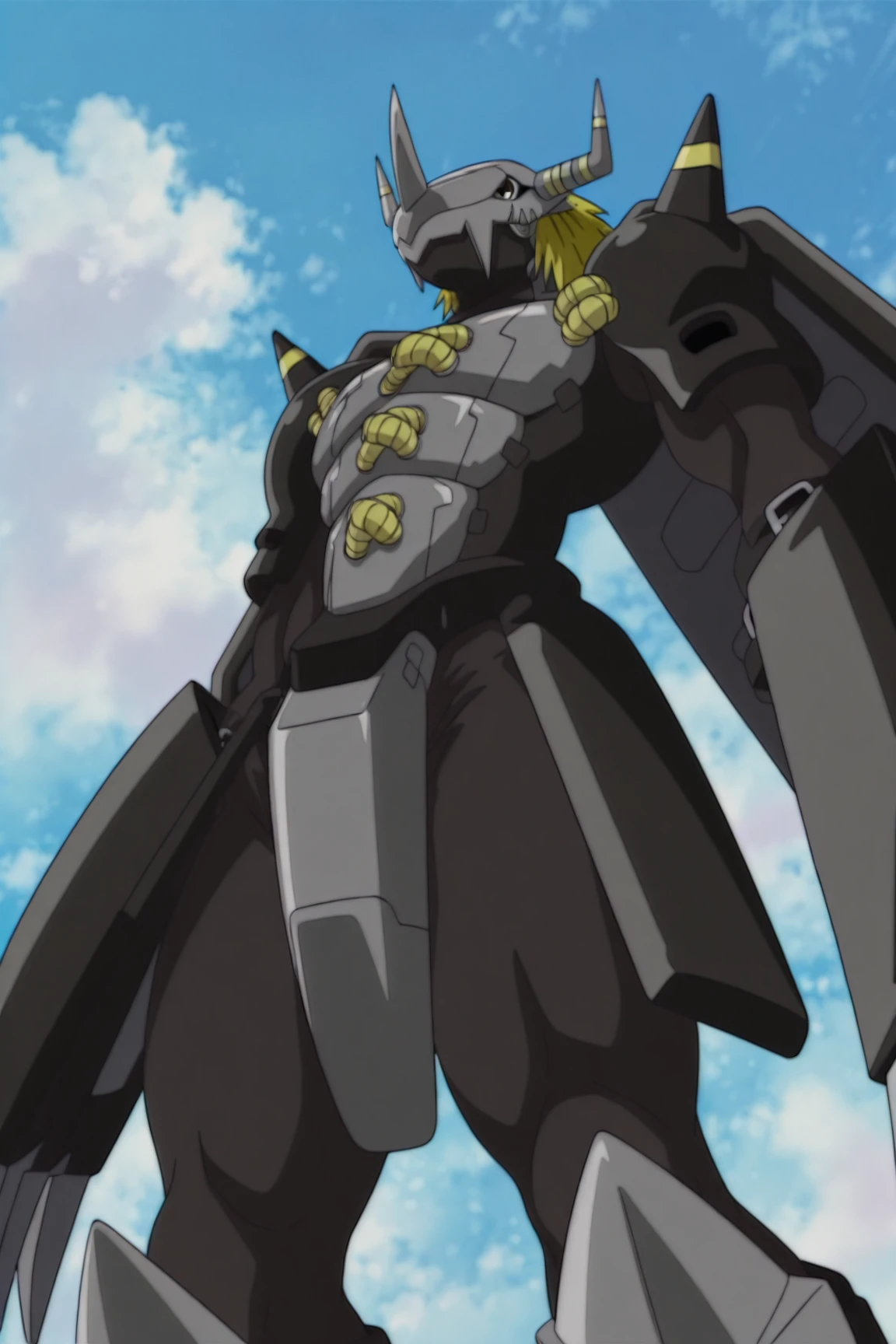 blackwargreymon, digimon (creature), colored skin, yellow eyes, blonde hair, helmet, chest armor, shoulder armor, mechanical wings, gauntlets, leg armor, waist armor, crotch plate,