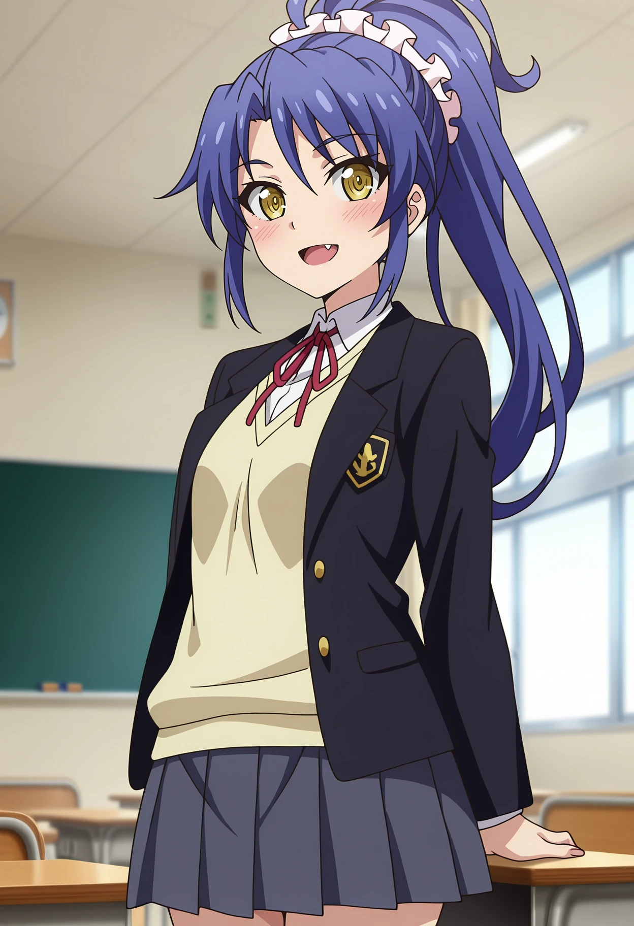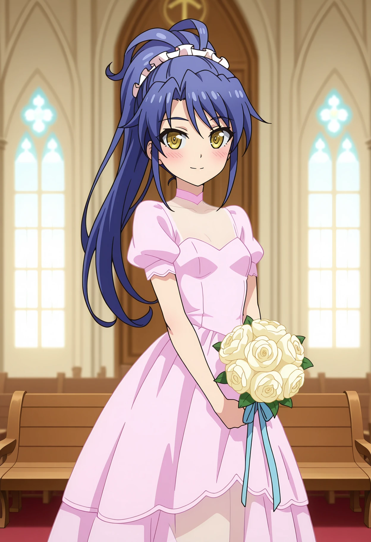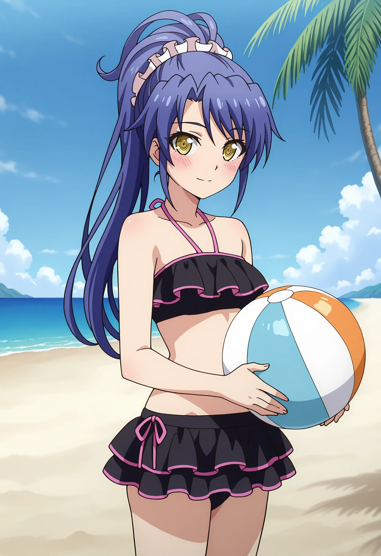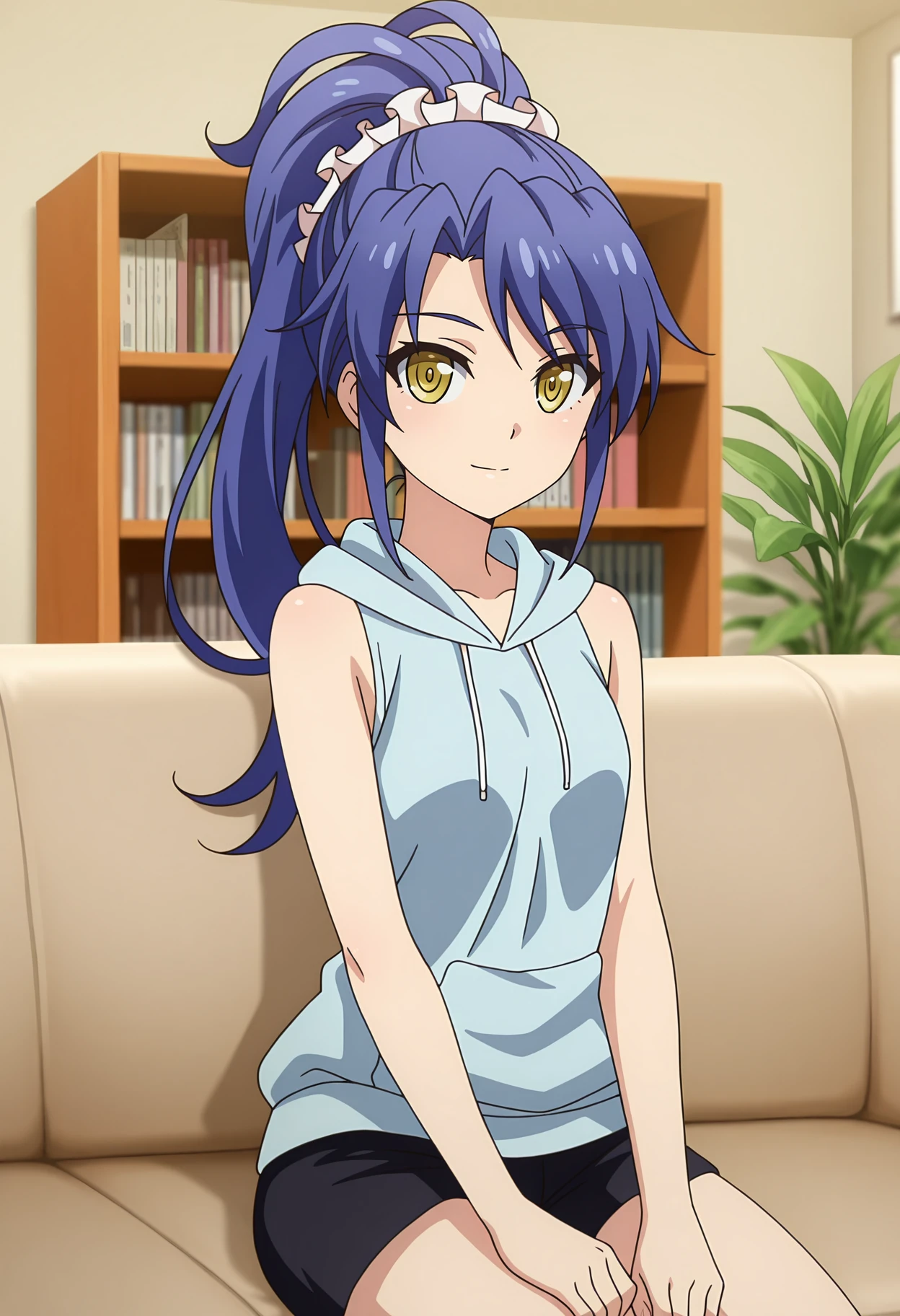 high ponytail, long hair, blue hair, yellow eyes, hair scrunchie, white scrunchie