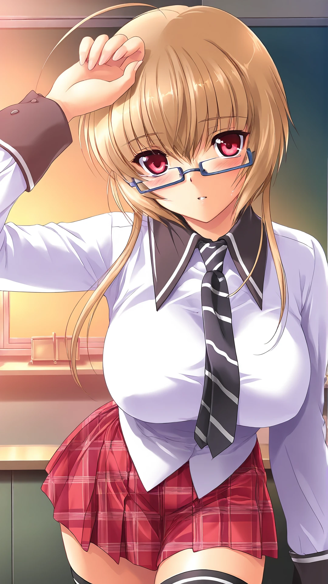 Sakuragi Kanae,1girl,solo,glasses,necktie,skirt,plaid,school uniform,long sleeves,ahoge,blonde hair,plaid skirt,short hair,red eyes,shirt,red skirt,brown hair,breasts,black thighhighs,