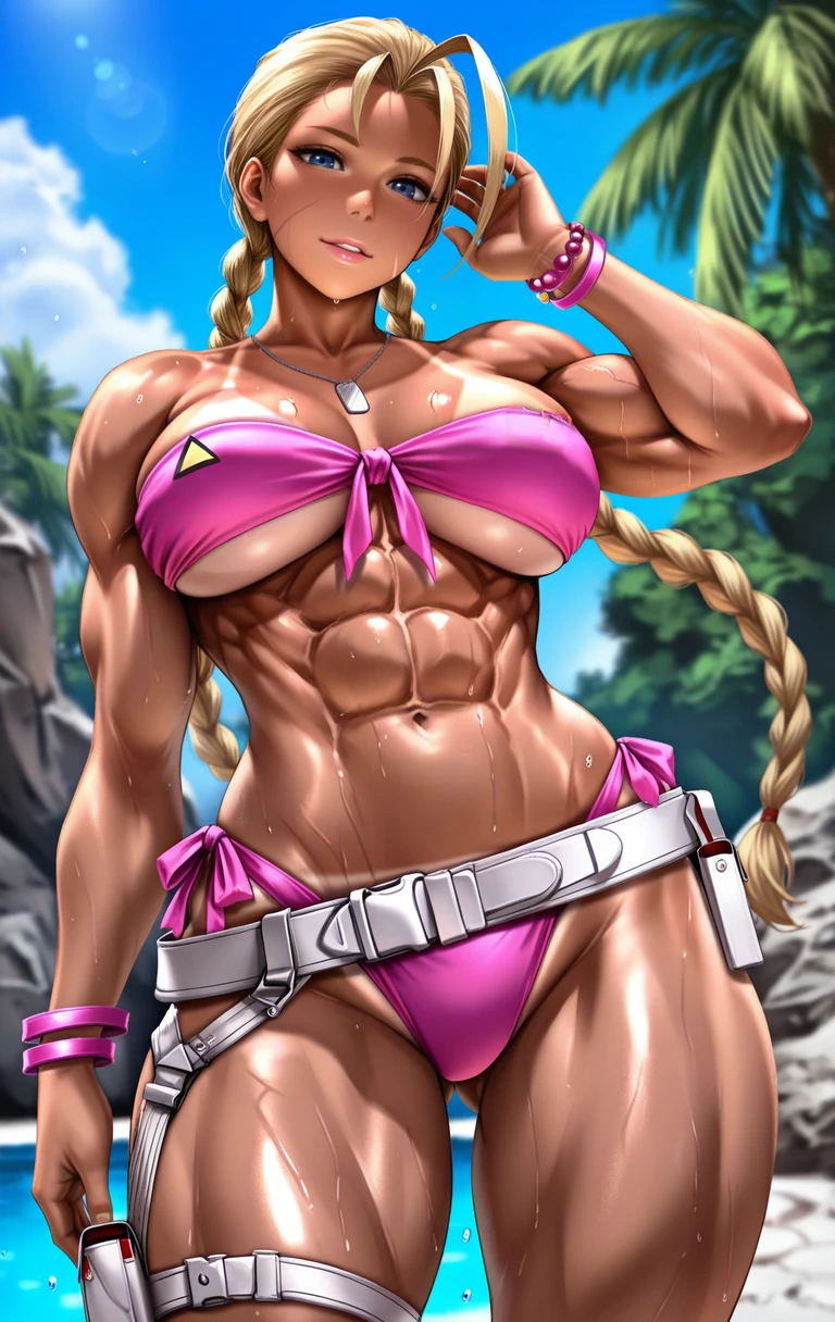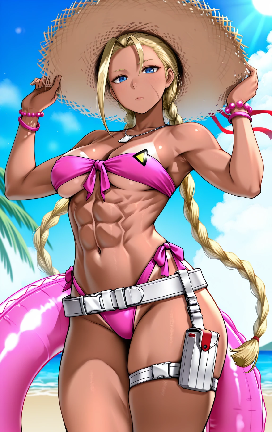 c4mmysfsw1m, blue eyes, blonde hair, antenna hair, low twin braids, long hair, scar on cheek, sun hat, straw hat, chain necklace, dog tags, pink bikini, bikini tan, strapless bikini, front-tie bikini top, underboob, tanlines, tan, midriff, toned female, abs, navel, groin, pink bracelet, side-tie bikini bottom, white belt, single thigh strap, thigh pouch, thick thighs,