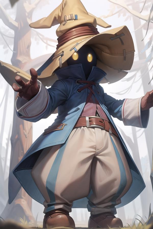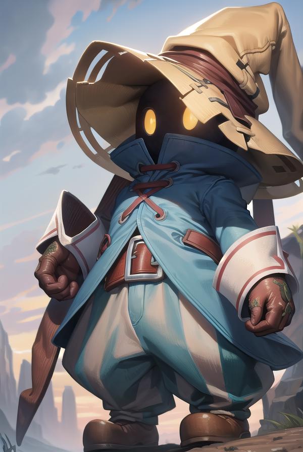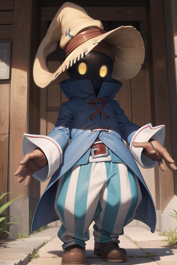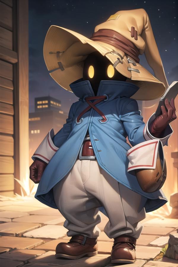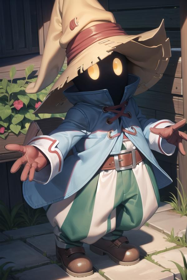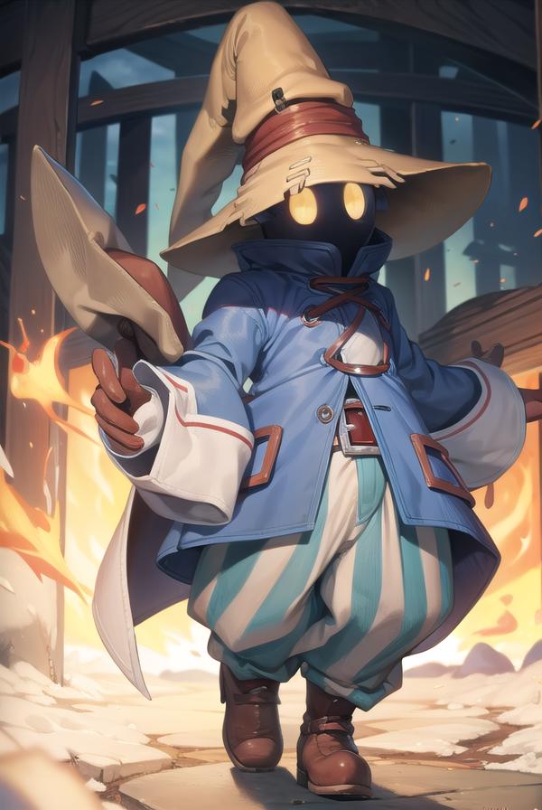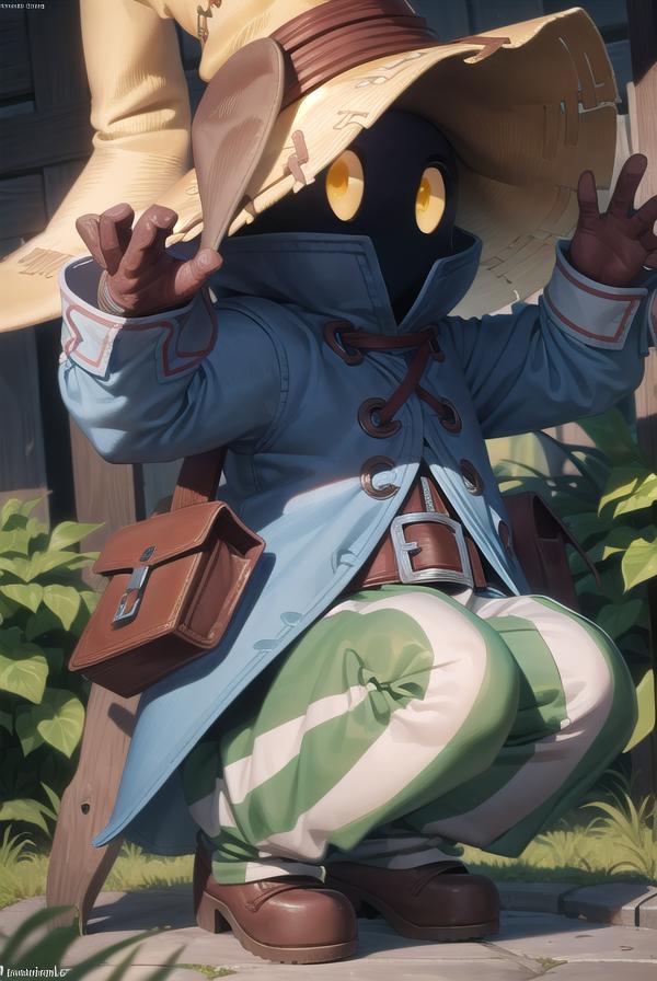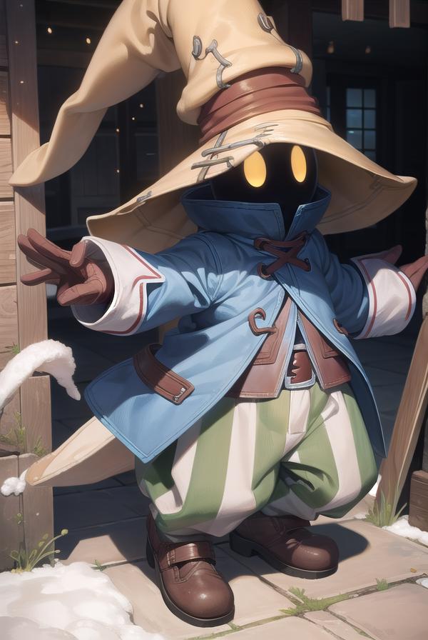 vivi ornitier, baggy pants, belt buckle, blue coat, boots, brown footwear, brown gloves, buckle, coat, gloves, hat, hat belt, high collar, pants, striped, striped pants, wizard hat, (yellow eyes:1.5), yellow headwear,